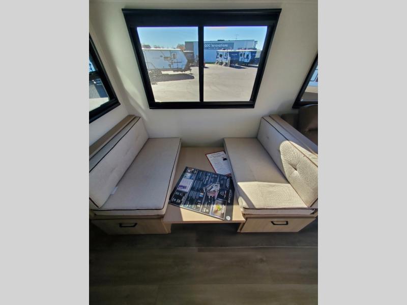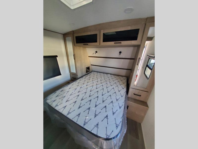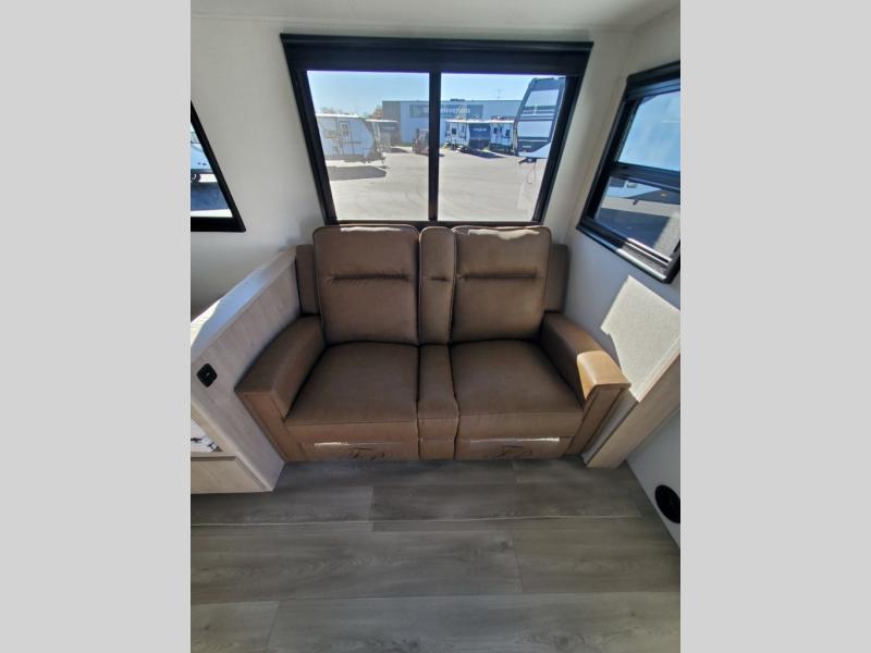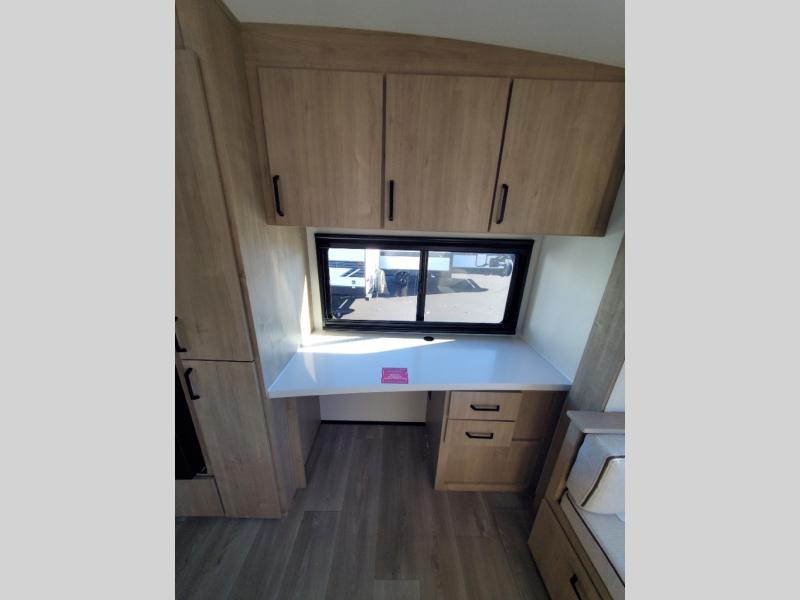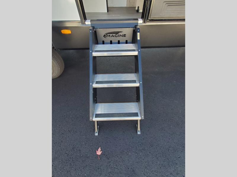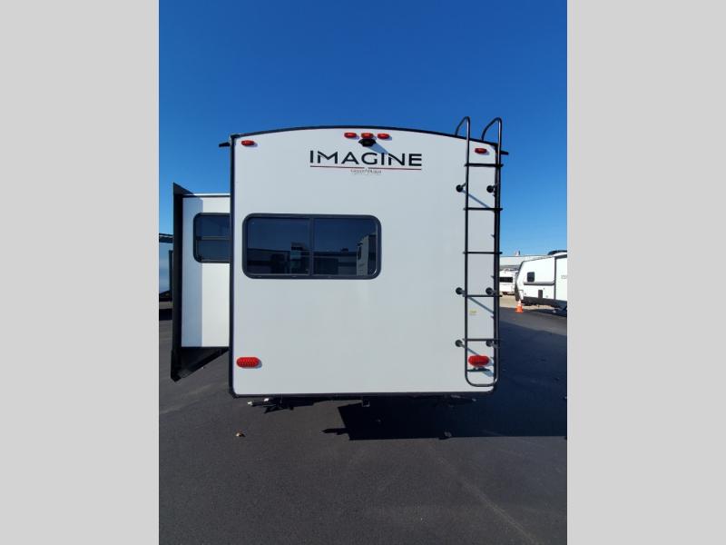 With this Imagine travel trailer, you can work while you're on the road because it offers you a desk in the main living area. You won't have to miss out on the action since you'll be right next to the booth dinette and tri-fold sofa, and there is even a pantry directly to the left of the desk for you to grab a quick snack while you're working. Once you're done with work, you can relax on the tri-fold sofa while you watch the telescoping LED HDTV, and the private bedroom offers you a 60" x 80" queen bed to rest on when you're ready to call it a night.