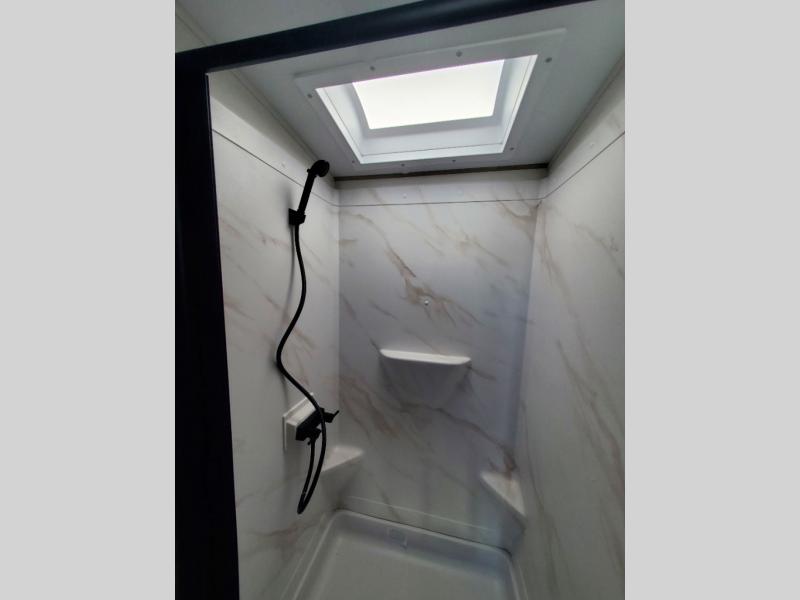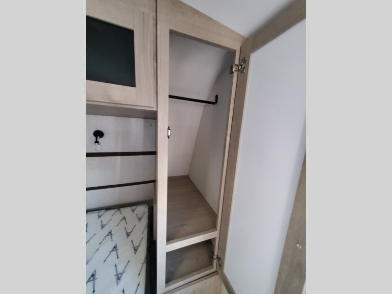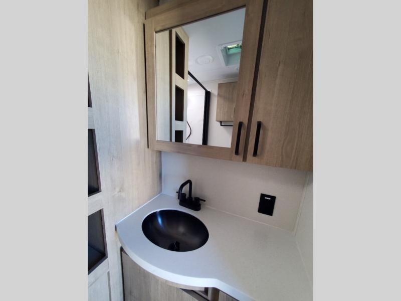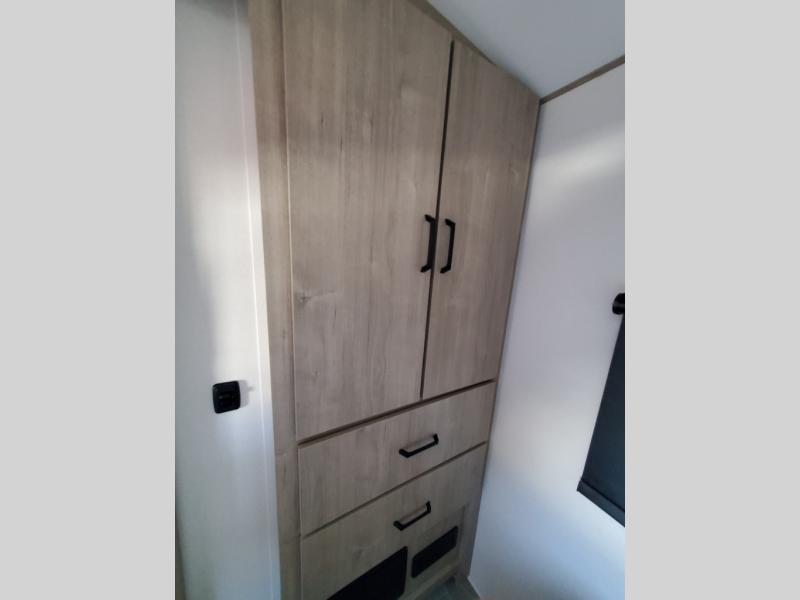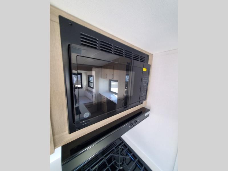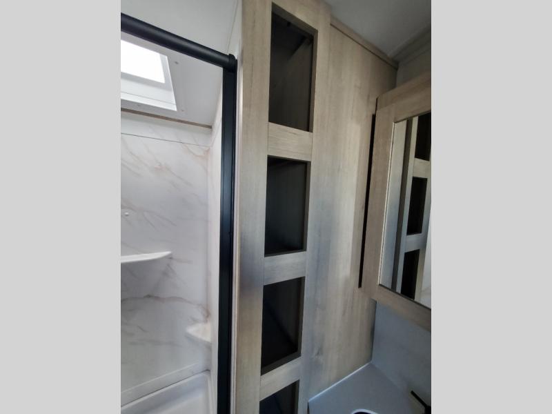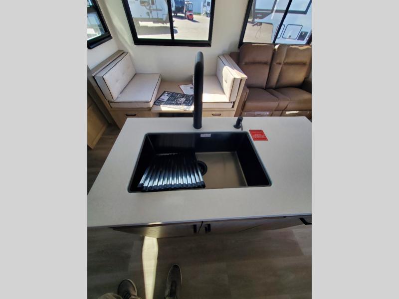 With this Imagine travel trailer, you can work while you're on the road because it offers you a desk in the main living area. You won't have to miss out on the action since you'll be right next to the booth dinette and tri-fold sofa, and there is even a pantry directly to the left of the desk for you to grab a quick snack while you're working. Once you're done with work, you can relax on the tri-fold sofa while you watch the telescoping LED HDTV, and the private bedroom offers you a 60" x 80" queen bed to rest on when you're ready to call it a night.