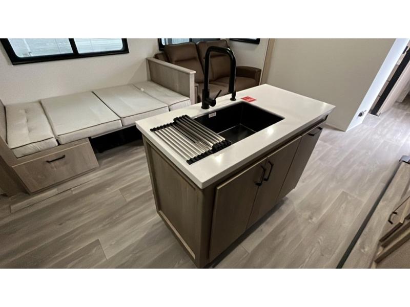 With this Imagine travel trailer, you can work while you're on the road because it offers you a desk in the main living area. You won't have to miss out on the action since you'll be right next to the booth dinette and tri-fold sofa, and there is even a pantry directly to the left of the desk for you to grab a quick snack while you're working. Once you're done with work, you can relax on the tri-fold sofa while you watch the telescoping TV, and the private bedroom offers you a 60" x 80" queen bed to rest on when you're ready to call it a night.