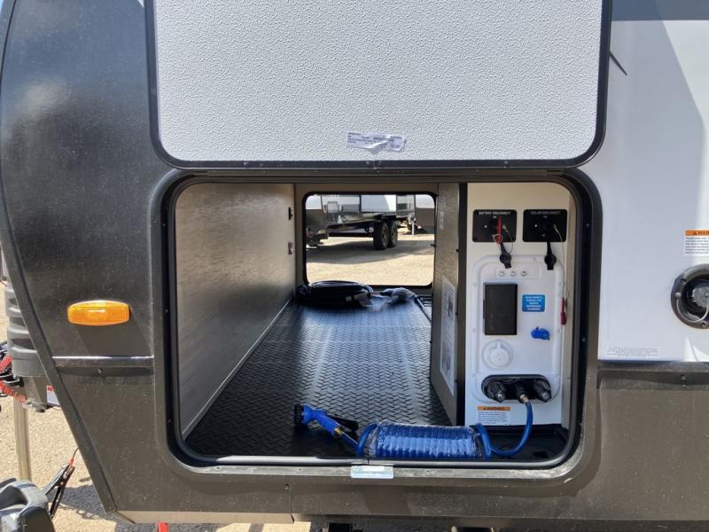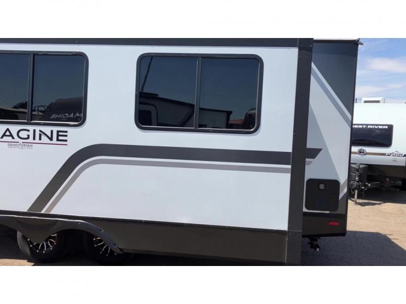 Just imagine leaving the world behind and secluding yourself away with your favorite people in your Grand Design Imagine travel trailer! The Imagine has been designed to enjoy camping and includes a high-capacity furnace, a heated and enclosed underbelly with suspended tanks, a designated heat duct to the subfloor, and a high-density roof insulation with attic vent. You'll have a large panoramic window to let natural lighting in and an adjustable Power Awning with LED Lights for those night gatherings. The exclusive drop-frame pass-through storage compartment is going to allow you to bring along lots of equipment, and the universal docking station is an all-in-one location for utilities and hook-ups. You'll also have oversized tank capacities so that you can fill and empty your tanks less often.