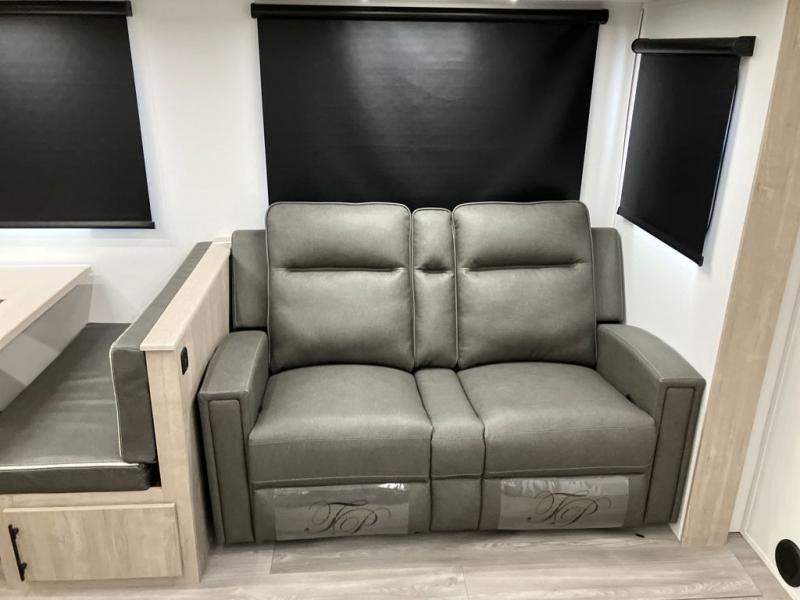 With this Imagine travel trailer, you can work while you're on the road because it offers you a desk in the main living area. You won't have to miss out on the action since you'll be right next to the booth dinette and tri-fold sofa, and there is even a pantry directly to the left of the desk for you to grab a quick snack while you're working. Once you're done with work, you can relax on the tri-fold sofa while you watch the telescoping TV, and the private bedroom offers you a 60" x 80" queen bed to rest on when you're ready to call it a night.