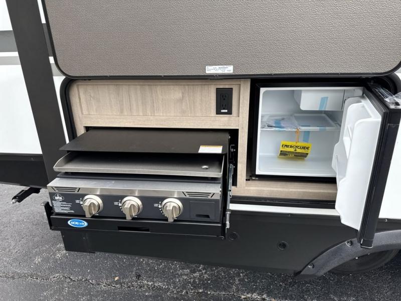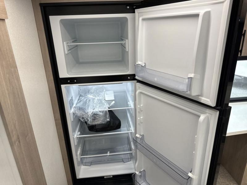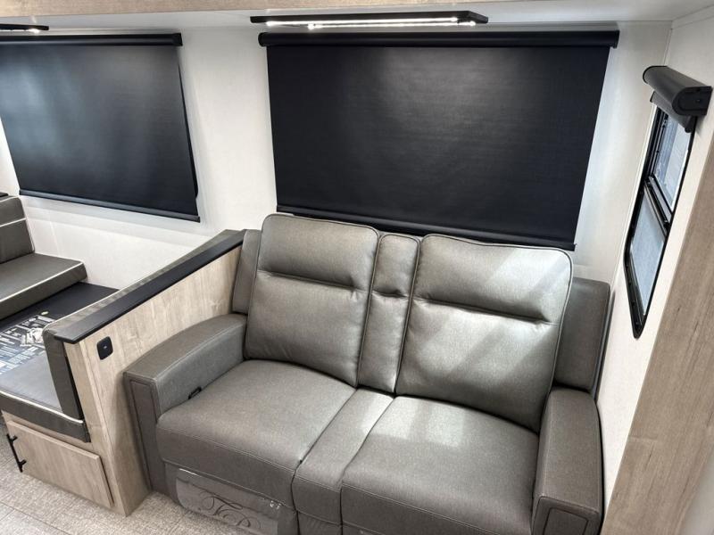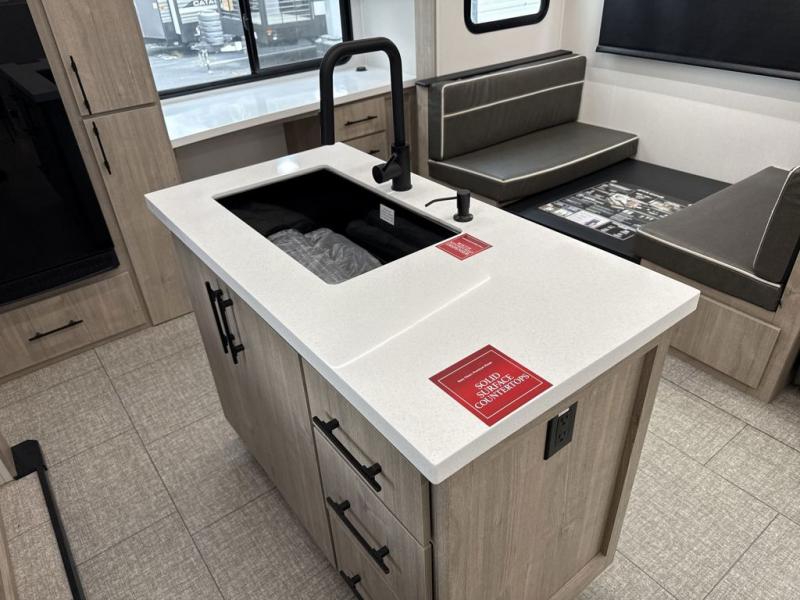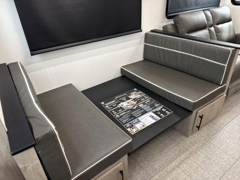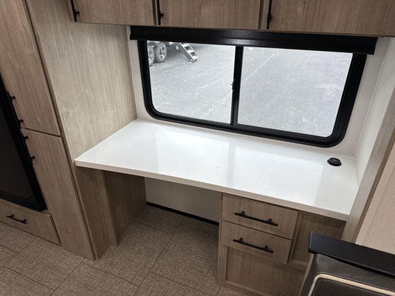 With this Imagine travel trailer, you can work while you're on the road because it offers you a desk in the main living area. You won't have to miss out on the action since you'll be right next to the booth dinette and tri-fold sofa, and there is even a pantry directly to the left of the desk for you to grab a quick snack while you're working. Once you're done with work, you can relax on the tri-fold sofa while you watch the telescoping TV, and the private bedroom offers you a 60" x 80" queen bed to rest on when you're ready to call it a night.