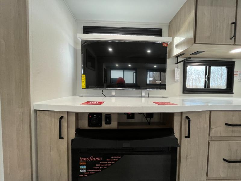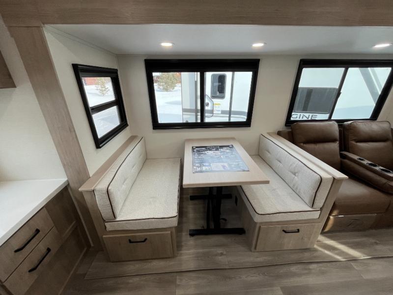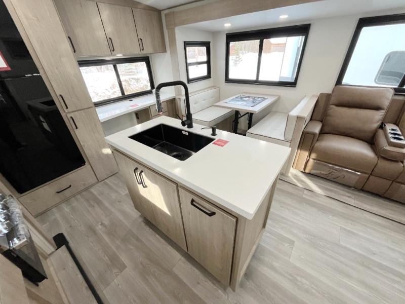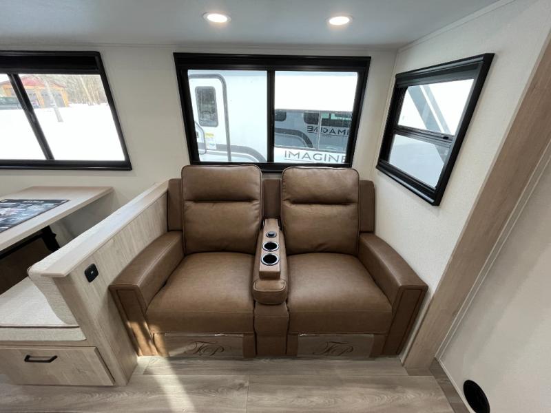 With this Imagine travel trailer, you can work while you're on the road because it offers you a desk in the main living area. You won't have to miss out on the action since you'll be right next to the booth dinette and theater seating, and there is even a pantry directly to the left of the desk for you to grab a quick snack while you're working. Once you're done with work, you can relax on the tri-fold sofa while you watch the telescoping TV, and the private bedroom offers you a 60" x 80" queen bed to rest on when you're ready to call it a night.