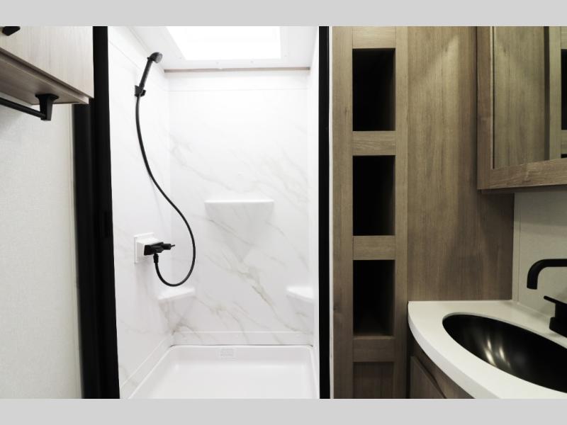 Designed for comfort in all seasons, the Imagine frame includes heated and enclosed underbelly, insulated tanks, double-insulated roof and front cap, high-capacity furnace (30,000 BTU), and 15,000 BTU ducted A/C to keep you comfortable year-round. The tankless on-demand water heater delivers endless hot water for showers and dishes while the solar package with 200W roof panel and 30 AMP controller provides off-grid flexibility — perfect for boondocking or extended stays.