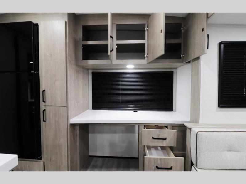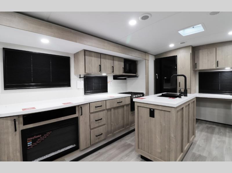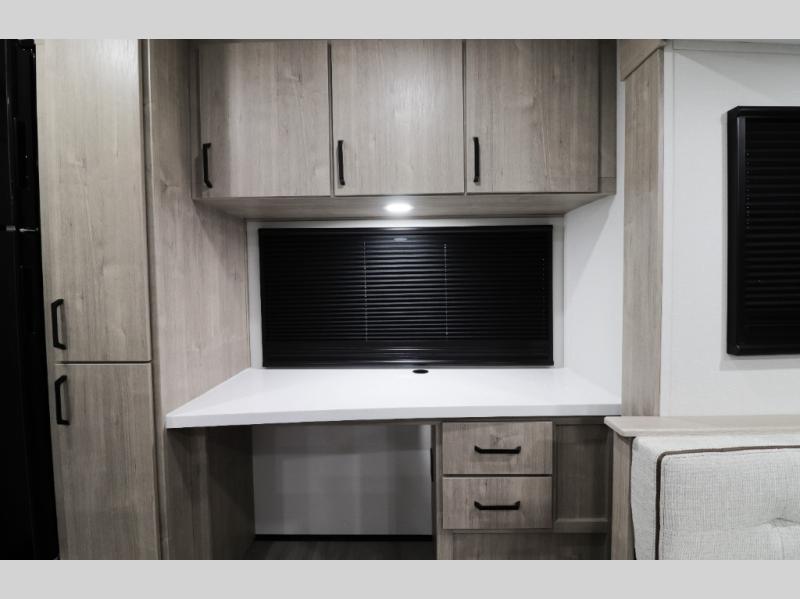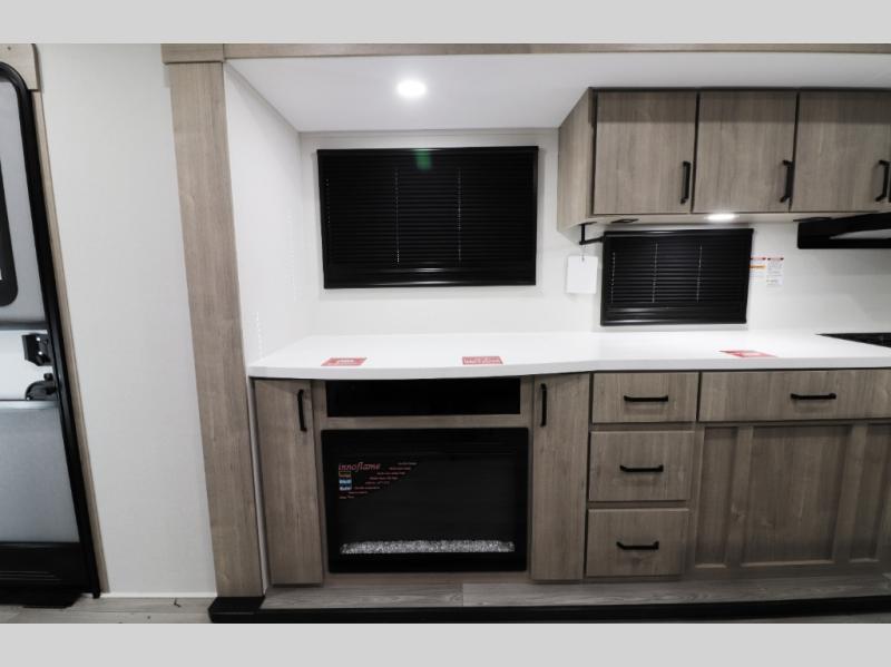 This 32’3 dual-slide travel trailer boasts a highly functional rear office workspace with built-in desk, charging stations, and power outlets — ideal for remote work, schoolwork, or planning your next adventure. The spacious living area opens up with opposing slides, comfortable theater seating, and a high-definition LED TV with TV & cable prep, perfect for relaxing nights in. Cozy up in cooler weather with the electric fireplace that adds ambiance and warmth.