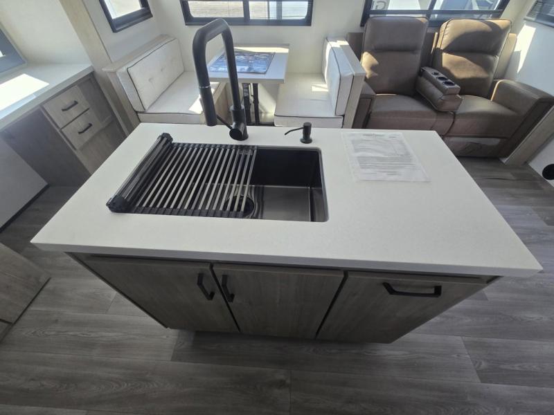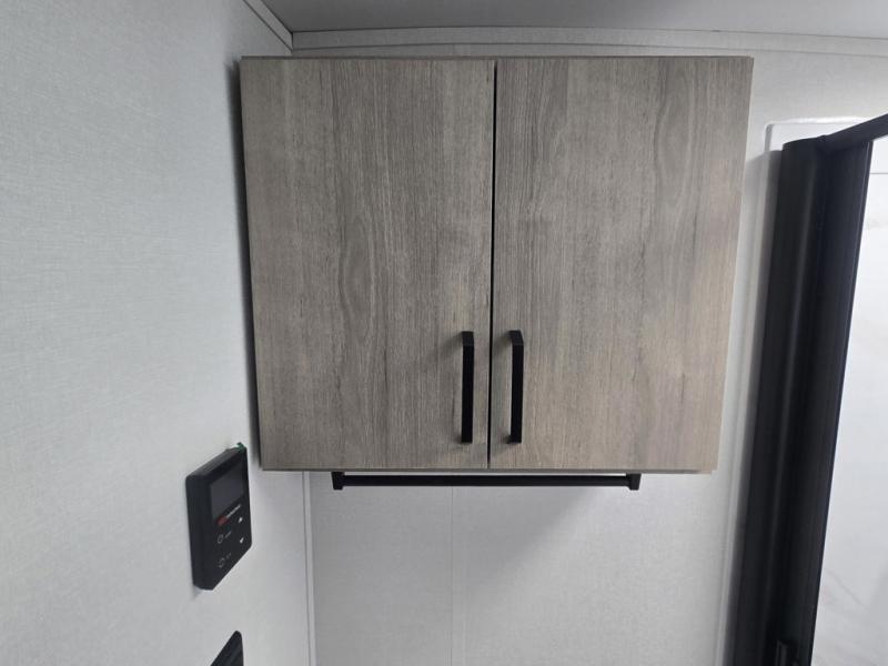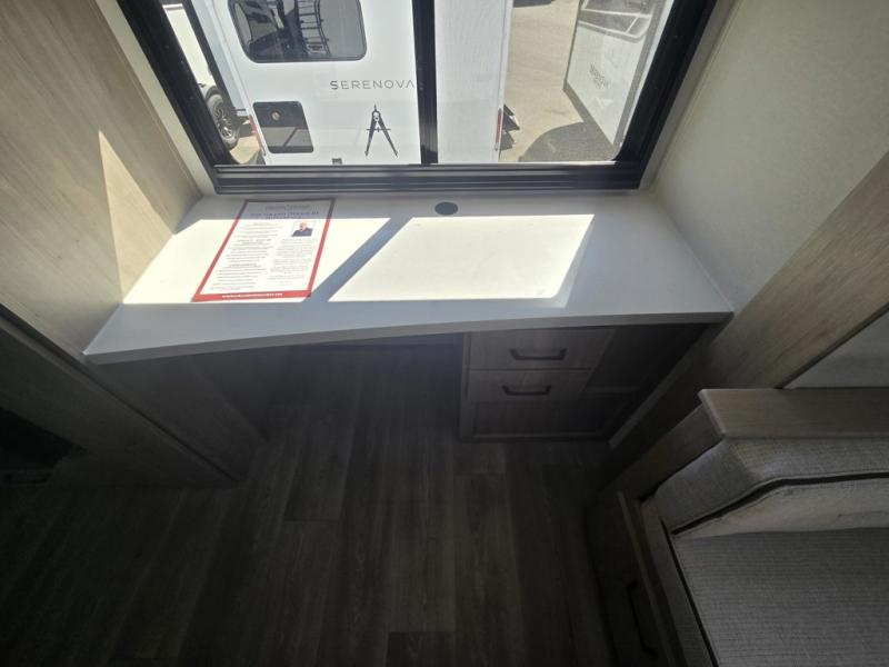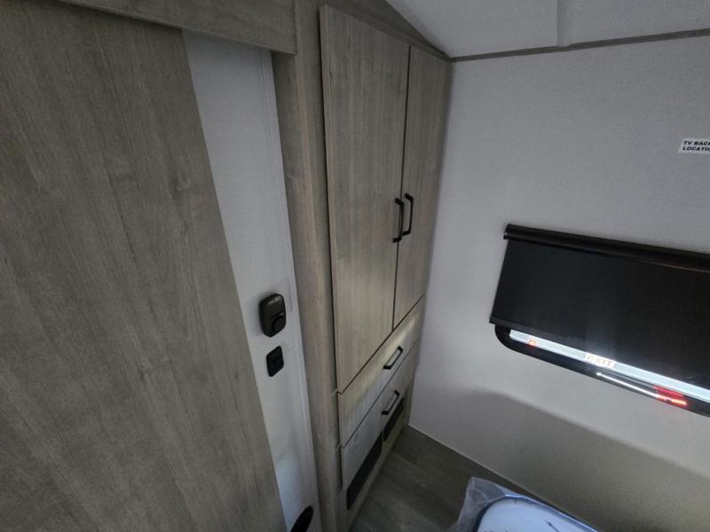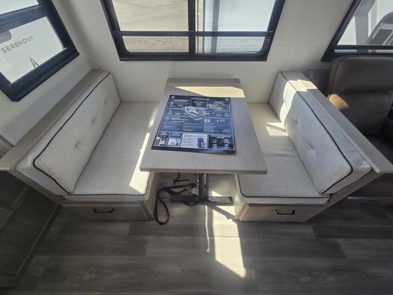 With this Imagine travel trailer, you can work while you're on the road because it offers you a desk in the main living area. You won't have to miss out on the action since you'll be right next to the booth dinette and tri-fold sofa, and there is even a pantry directly to the left of the desk for you to grab a quick snack while you're working. Once you're done with work, you can relax on the tri-fold sofa while you watch the telescoping TV, and the private bedroom offers you a 60" x 80" queen bed to rest on when you're ready to call it a night.