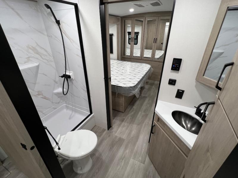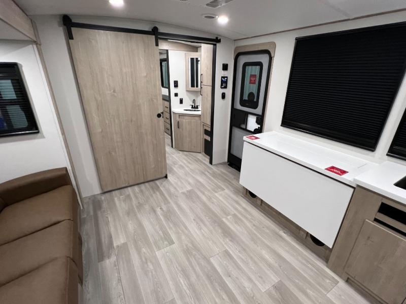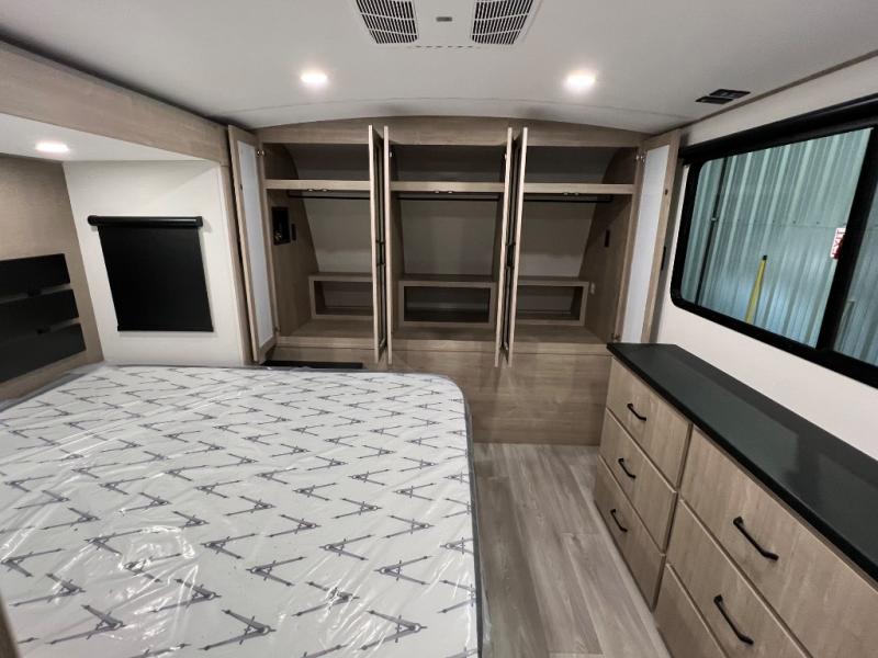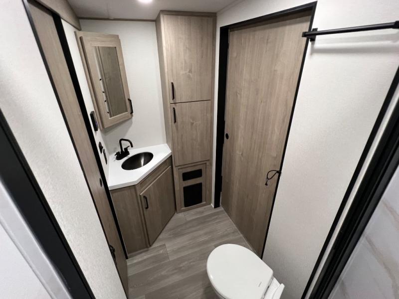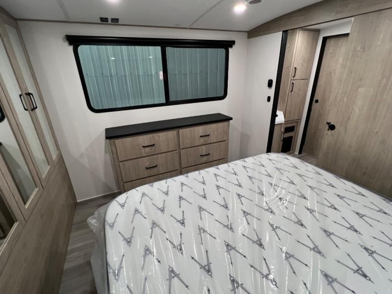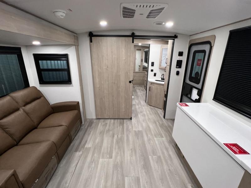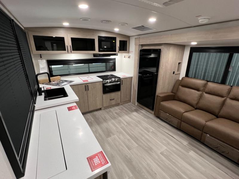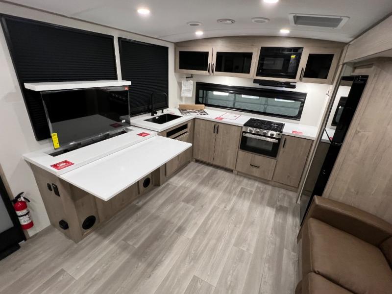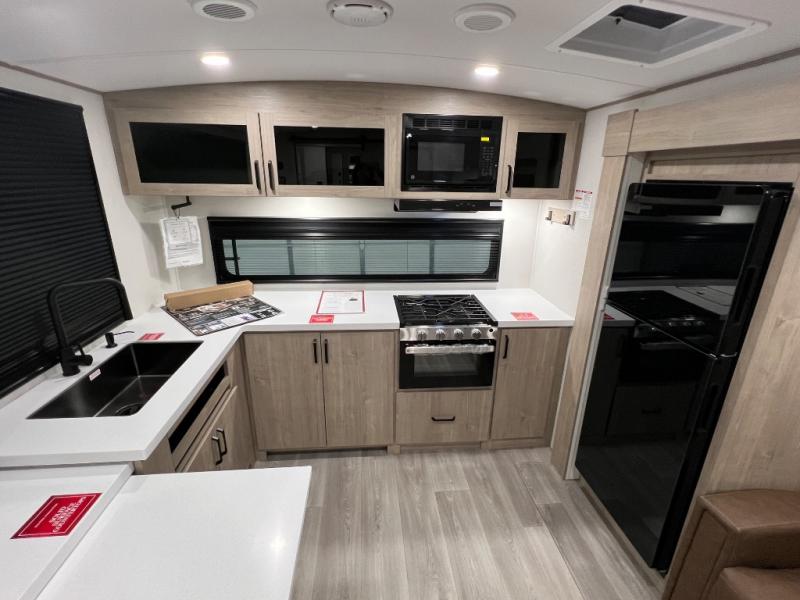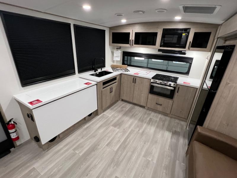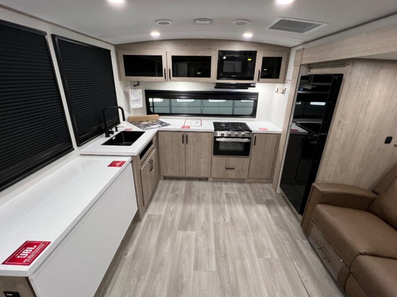 At the front of the 2700BS trailer, you’ll find a spacious full bedroom featuring a 70" x 80" king bed housed in one of two slide outs, offering both generous space and a comfortable night’s rest. The room also includes a wardrobe and dresser, providing ample storage for clothing and essentials. Moving toward the center, the walk-through bathroom boasts a 30" x 36" residential walk-in shower with a skylight, a toilet, and a sink opposite a mirrored medicine cabinet for added convenience and storage. At the rear, the open-concept kitchen and living area make excellent use of the second slide out, which includes cozy theater seating, perfect for dining or relaxing while watching TV. Next to it sits a 10-cu. ft. refrigerator, offering plenty of room for groceries and refreshments. Across the space, the L-shaped kitchen spans the entire rear wall, giving you extensive countertop room for meal prep. Equipped with a three-burner range, oven, microwave, and stainless steel sink, this kitchen allows you to cook in comfort and style without relying on campsite facilities.