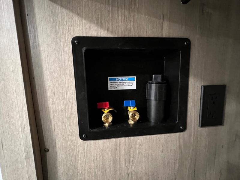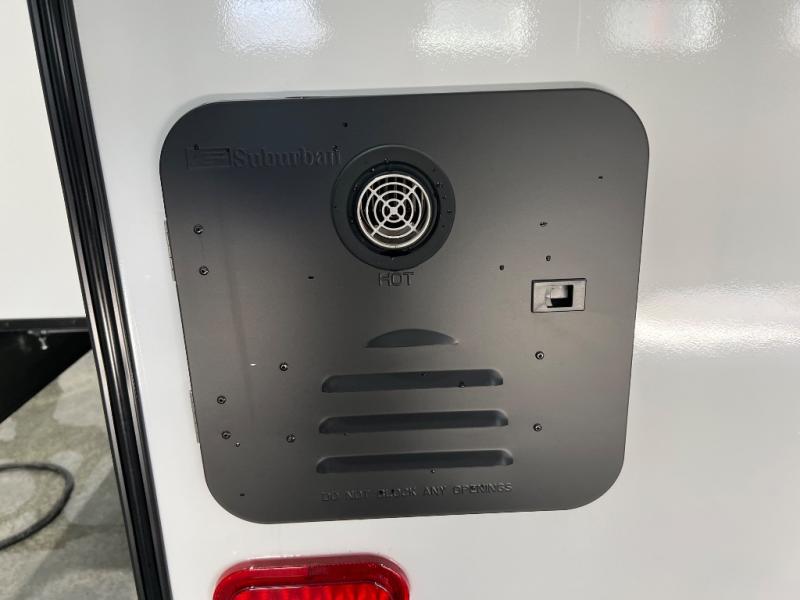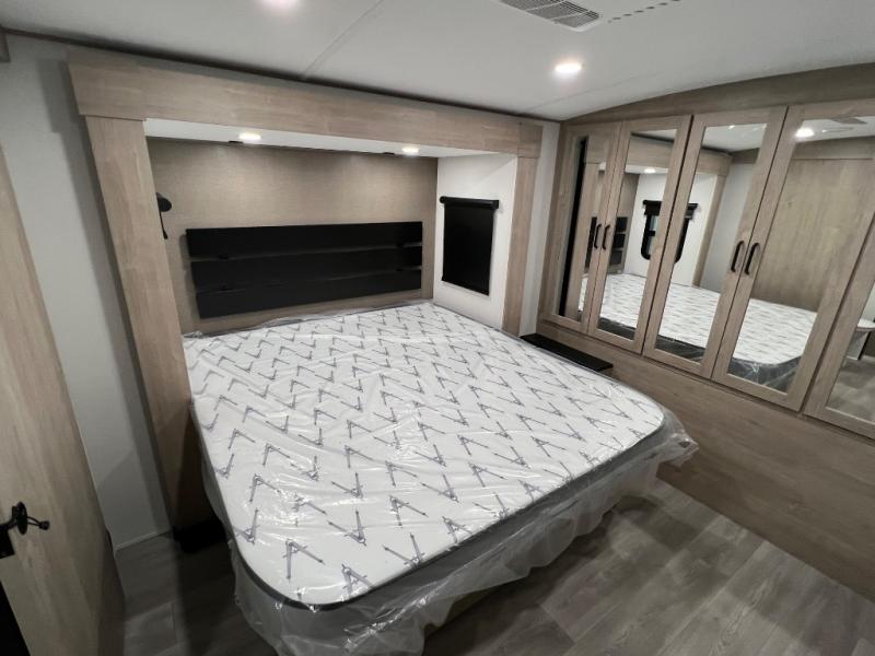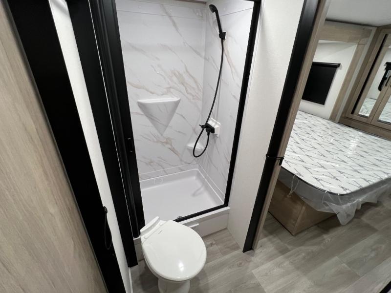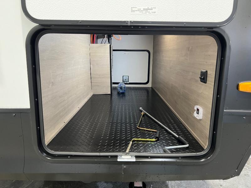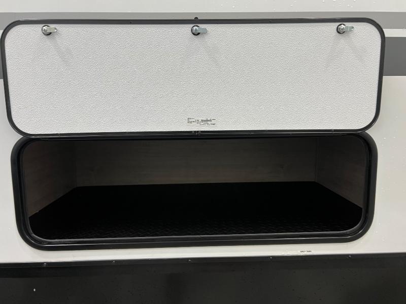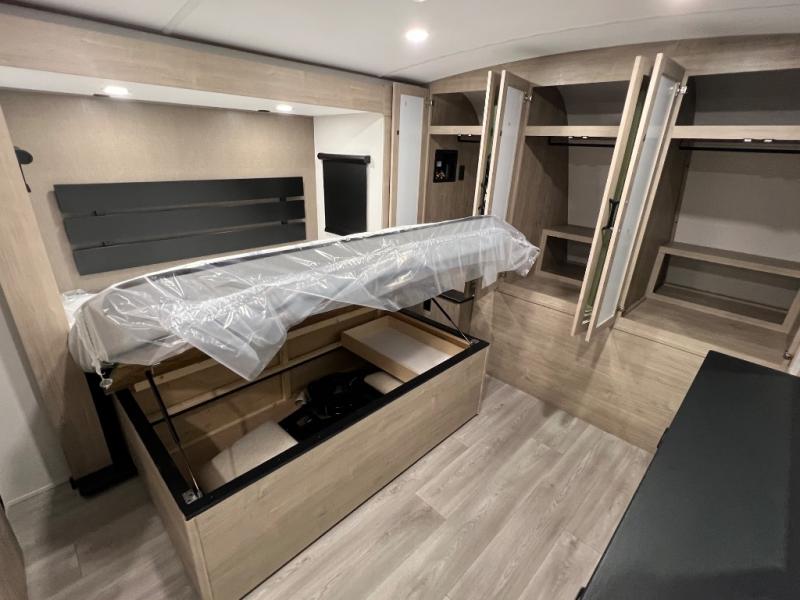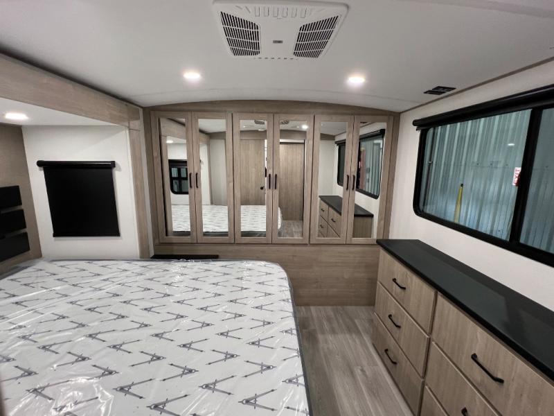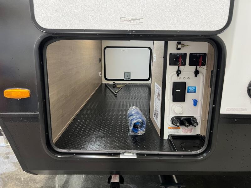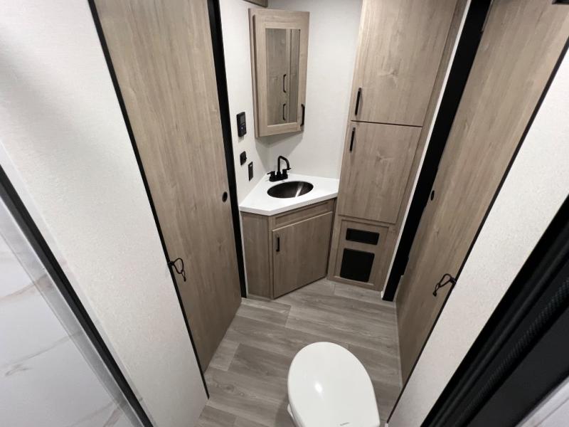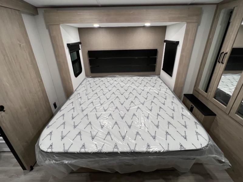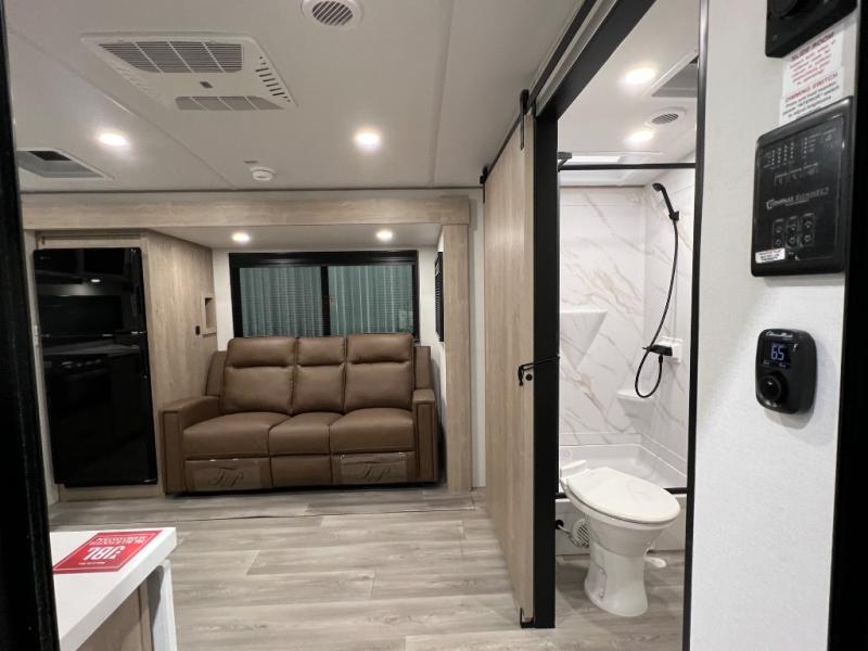 At the front of the 2700BS trailer, you’ll find a spacious full bedroom featuring a 70" x 80" king bed housed in one of two slide outs, offering both generous space and a comfortable night’s rest. The room also includes a wardrobe and dresser, providing ample storage for clothing and essentials. Moving toward the center, the walk-through bathroom boasts a 30" x 36" residential walk-in shower with a skylight, a toilet, and a sink opposite a mirrored medicine cabinet for added convenience and storage. At the rear, the open-concept kitchen and living area make excellent use of the second slide out, which includes cozy theater seating, perfect for dining or relaxing while watching TV. Next to it sits a 10-cu. ft. refrigerator, offering plenty of room for groceries and refreshments. Across the space, the L-shaped kitchen spans the entire rear wall, giving you extensive countertop room for meal prep. Equipped with a three-burner range, oven, microwave, and stainless steel sink, this kitchen allows you to cook in comfort and style without relying on campsite facilities.