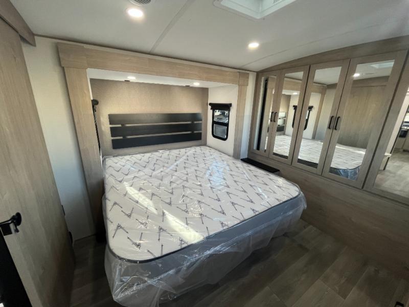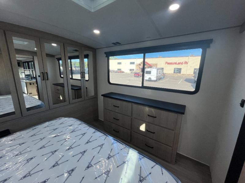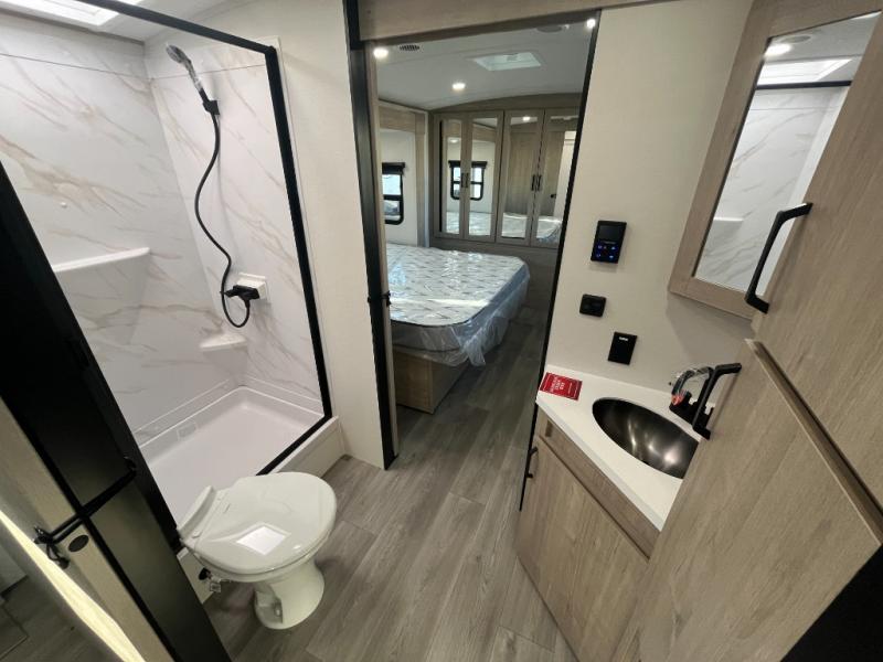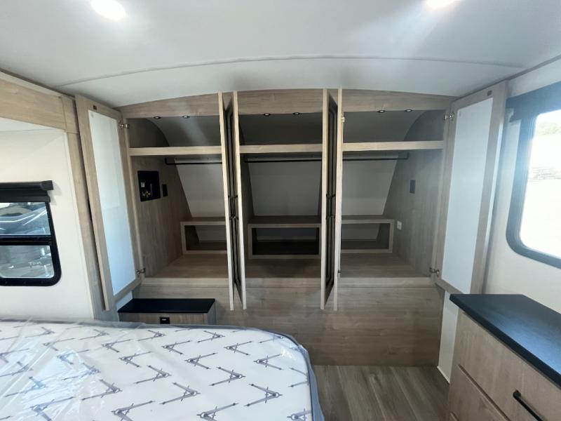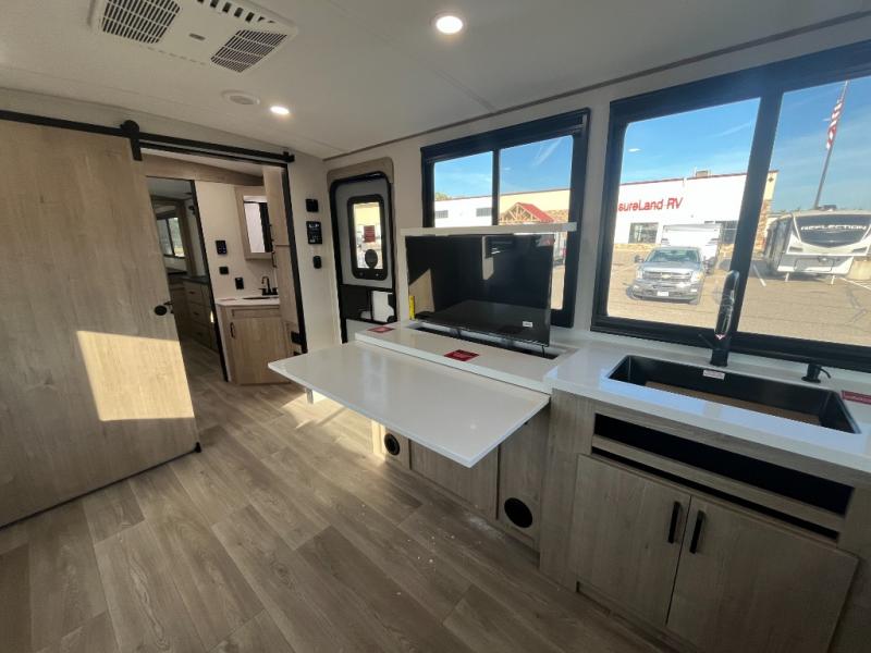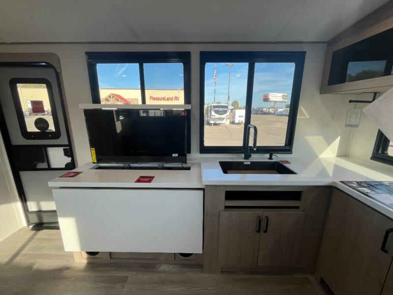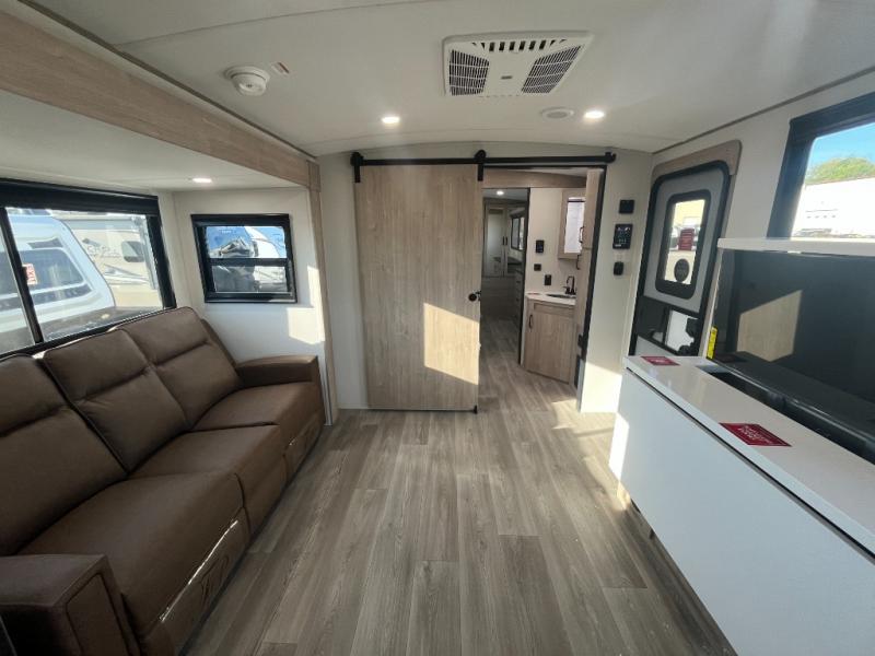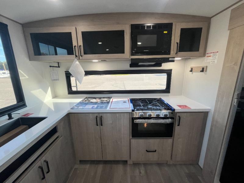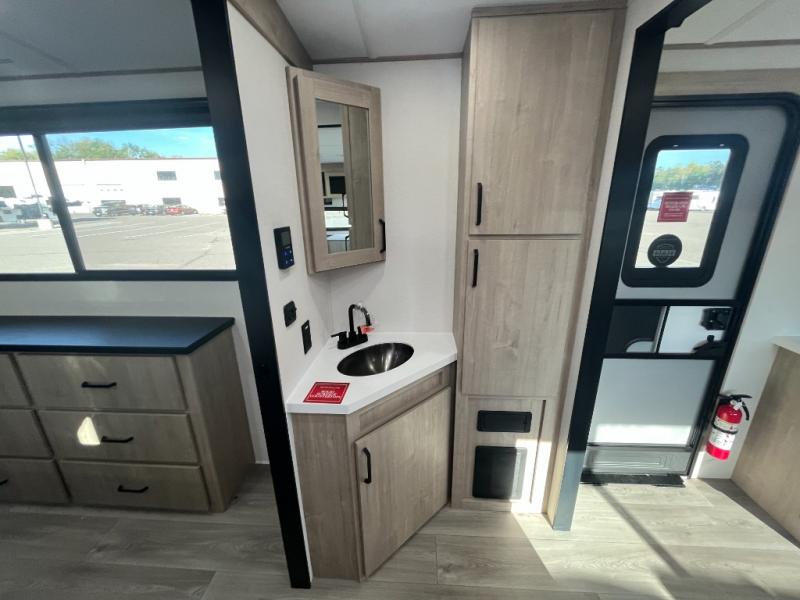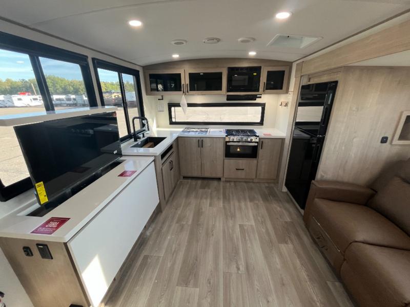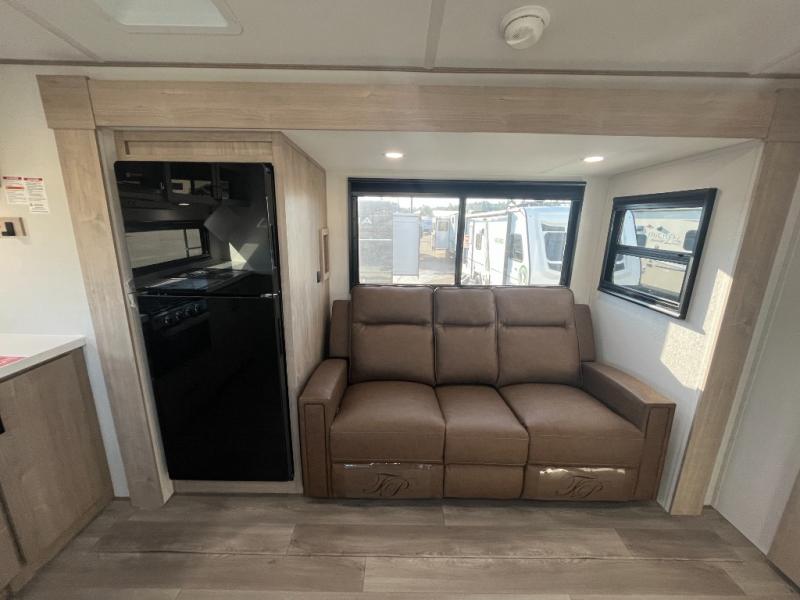 At the front of the 2700BS trailer, you’ll find a spacious full bedroom featuring a 70" x 80" king bed housed in one of two slide outs, offering both generous space and a comfortable night’s rest. The room also includes a wardrobe and dresser, providing ample storage for clothing and essentials. Moving toward the center, the walk-through bathroom boasts a 30" x 36" residential walk-in shower with a skylight, a toilet, and a sink opposite a mirrored medicine cabinet for added convenience and storage. At the rear, the open-concept kitchen and living area make excellent use of the second slide out, which includes cozy theater seating, perfect for dining or relaxing while watching TV. Next to it sits a 10-cu. ft. refrigerator, offering plenty of room for groceries and refreshments. Across the space, the L-shaped kitchen spans the entire rear wall, giving you extensive countertop room for meal prep. Equipped with a three-burner range, oven, microwave, and stainless steel sink, this kitchen allows you to cook in comfort and style without relying on campsite facilities.