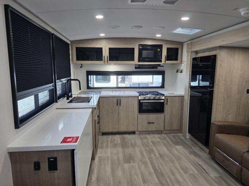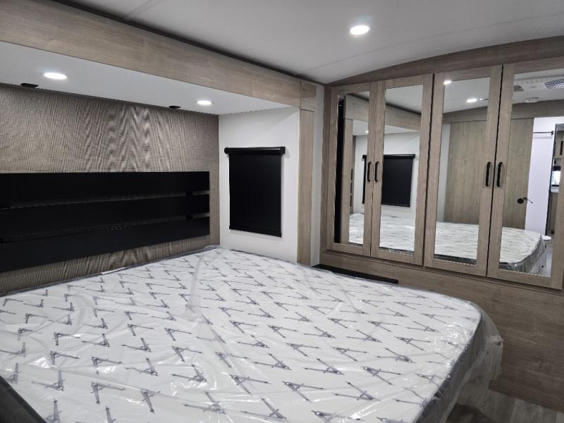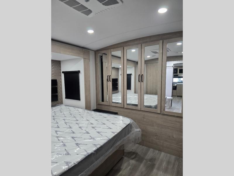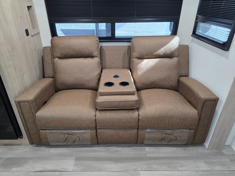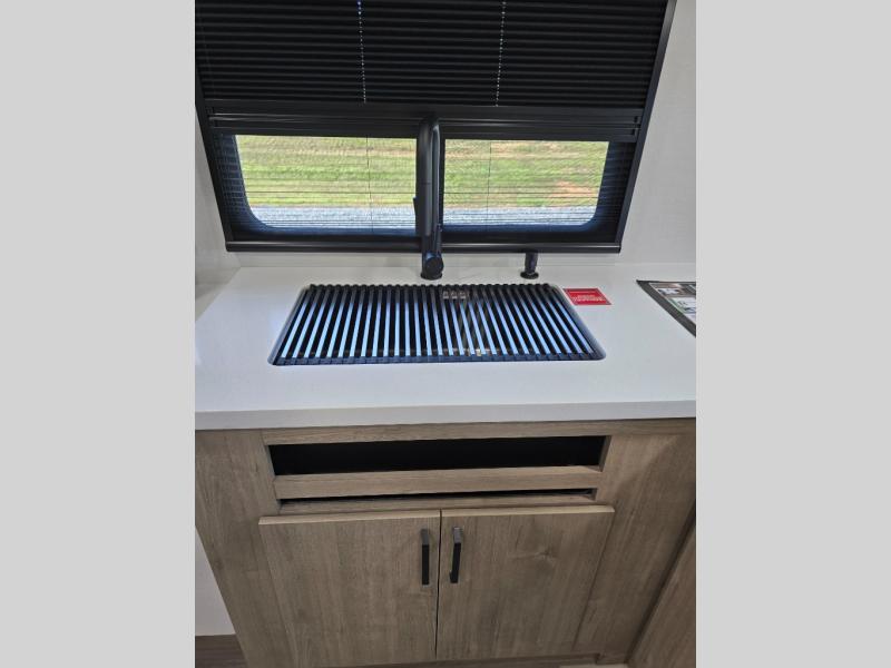 Step inside and you’ll find a spacious rear living area with theater seating, a large entertainment center, and panoramic windows that bring the outdoors in. The modern kitchen features solid-surface countertops, a deep stainless sink, residential cabinetry, and plenty of storage — making meal prep on the road a breeze.