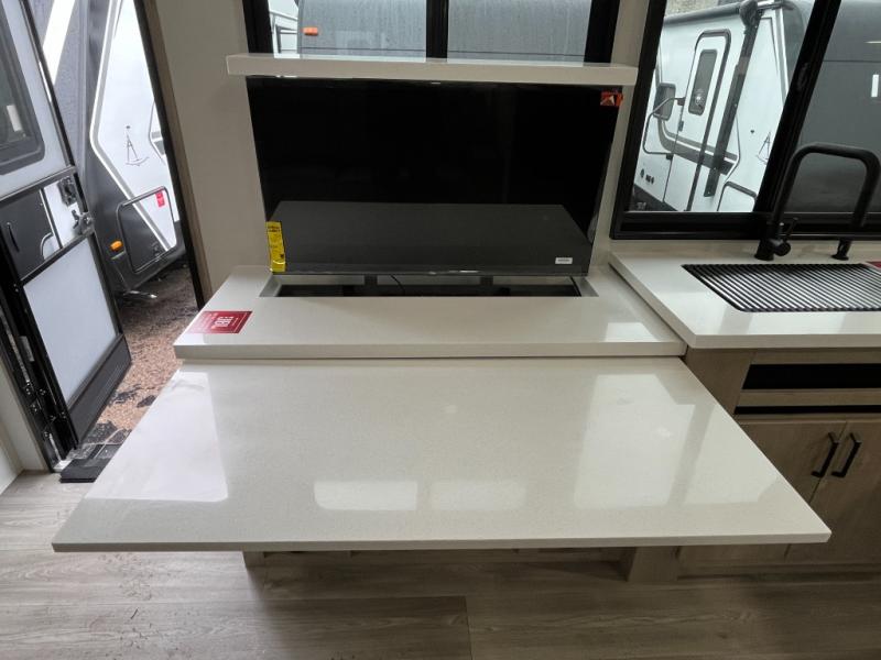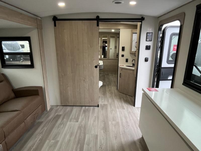 At the front of the 2700BS trailer, you’ll find a spacious full bedroom featuring a 70" x 80" king bed housed in one of two slide outs, offering both generous space and a comfortable night’s rest. The room also includes a wardrobe and dresser, providing ample storage for clothing and essentials. Moving toward the center, the walk-through bathroom boasts a 30" x 36" residential walk-in shower with a skylight, a toilet, and a sink opposite a mirrored medicine cabinet for added convenience and storage. At the rear, the open-concept kitchen and living area make excellent use of the second slide out, which includes cozy theater seating, perfect for dining or relaxing while watching TV. Next to it sits a 10-cu. ft. refrigerator, offering plenty of room for groceries and refreshments. Across the space, the L-shaped kitchen spans the entire rear wall, giving you extensive countertop room for meal prep. Equipped with a three-burner range, oven, microwave, and stainless steel sink, this kitchen allows you to cook in comfort and style without relying on campsite facilities.