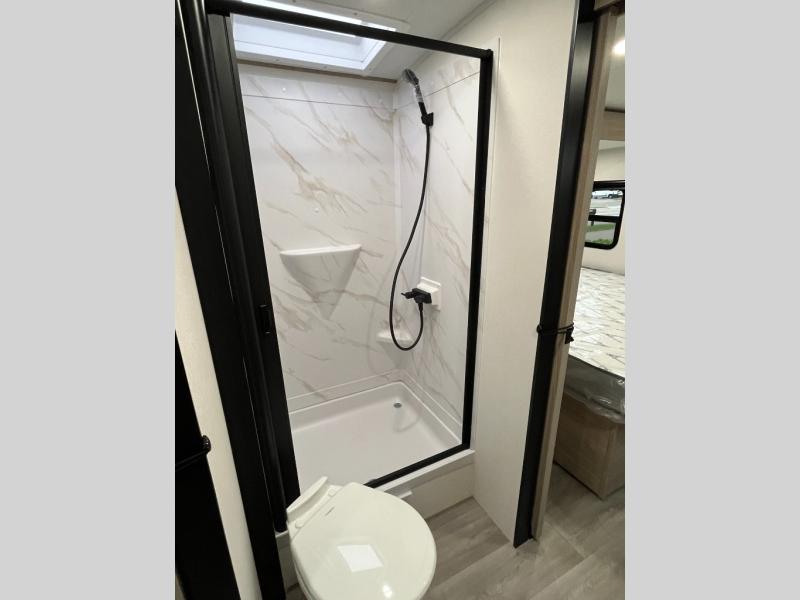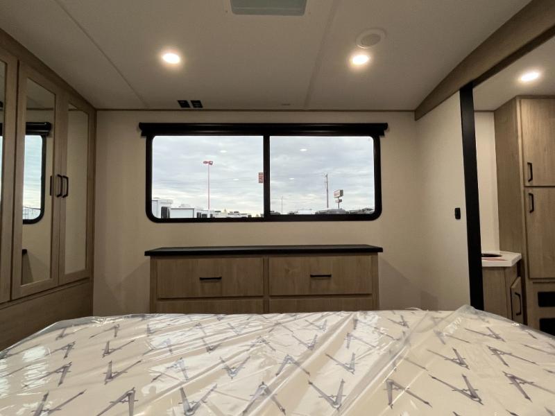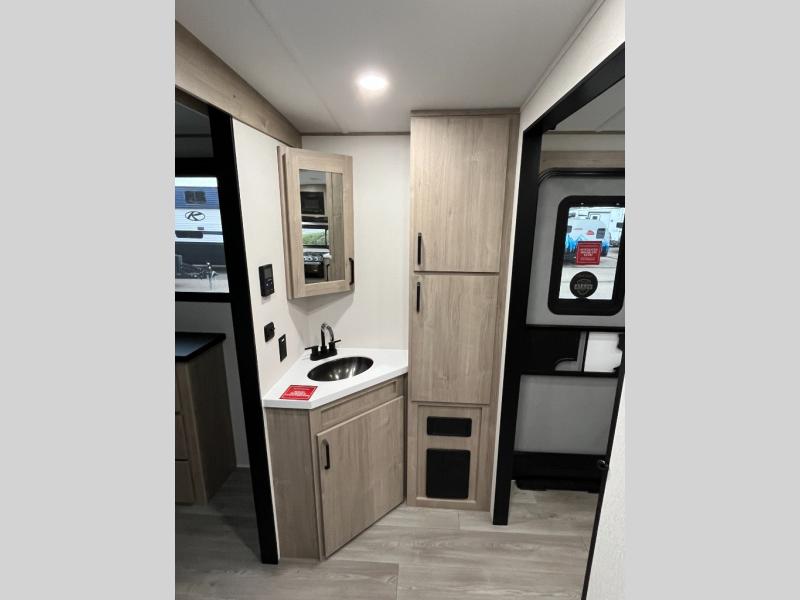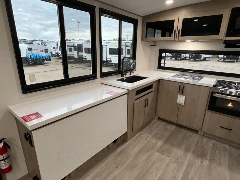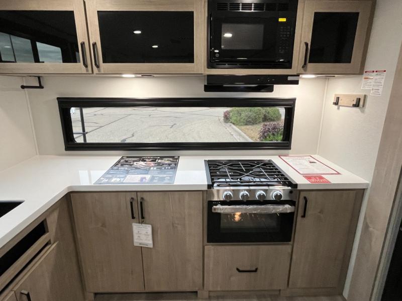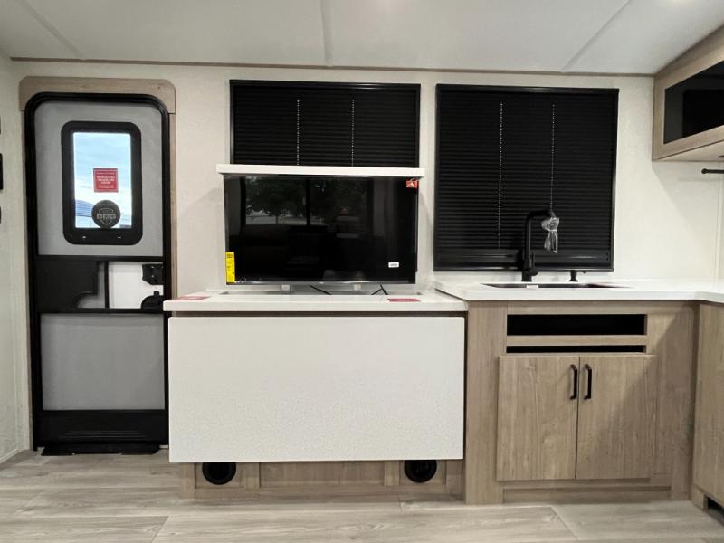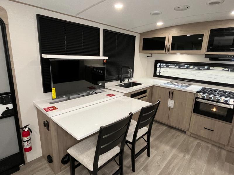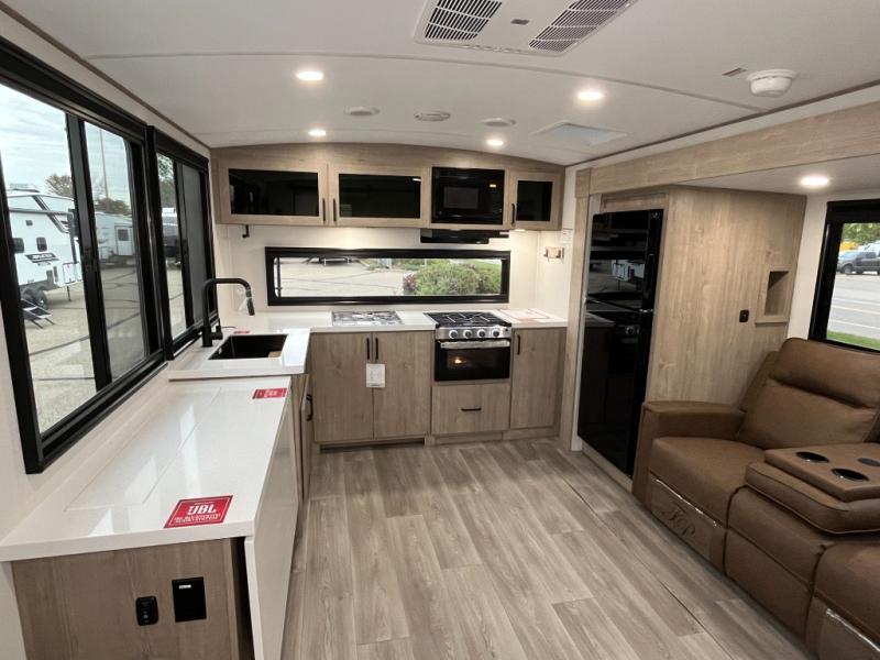 At the front of the 2700BS trailer, you’ll find a spacious full bedroom featuring a 70" x 80" king bed housed in one of two slide outs, offering both generous space and a comfortable night’s rest. The room also includes a wardrobe and dresser, providing ample storage for clothing and essentials. Moving toward the center, the walk-through bathroom boasts a 30" x 36" residential walk-in shower with a skylight, a toilet, and a sink opposite a mirrored medicine cabinet for added convenience and storage. At the rear, the open-concept kitchen and living area make excellent use of the second slide out, which includes cozy theater seating, perfect for dining or relaxing while watching TV. Next to it sits a 10-cu. ft. refrigerator, offering plenty of room for groceries and refreshments. Across the space, the L-shaped kitchen spans the entire rear wall, giving you extensive countertop room for meal prep. Equipped with a three-burner range, oven, microwave, and stainless steel sink, this kitchen allows you to cook in comfort and style without relying on campsite facilities.
