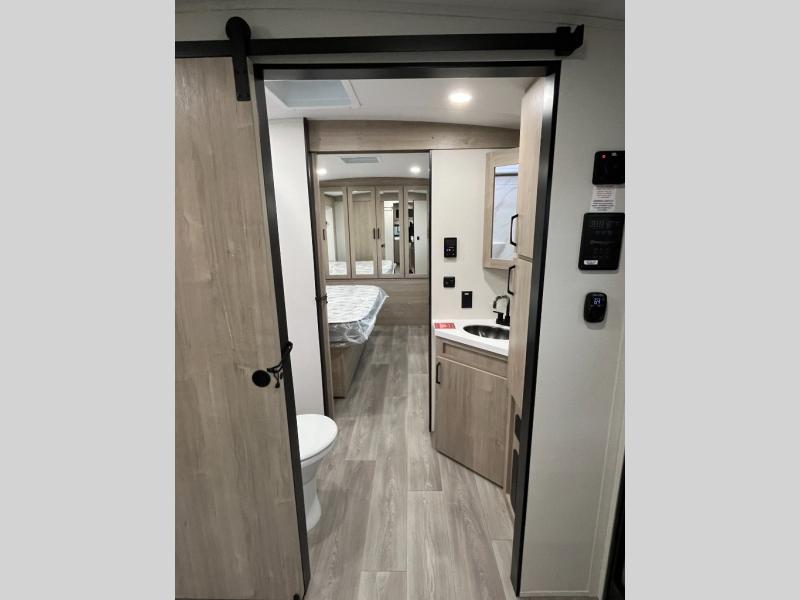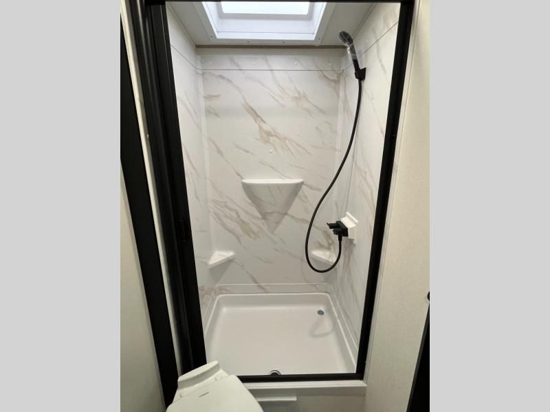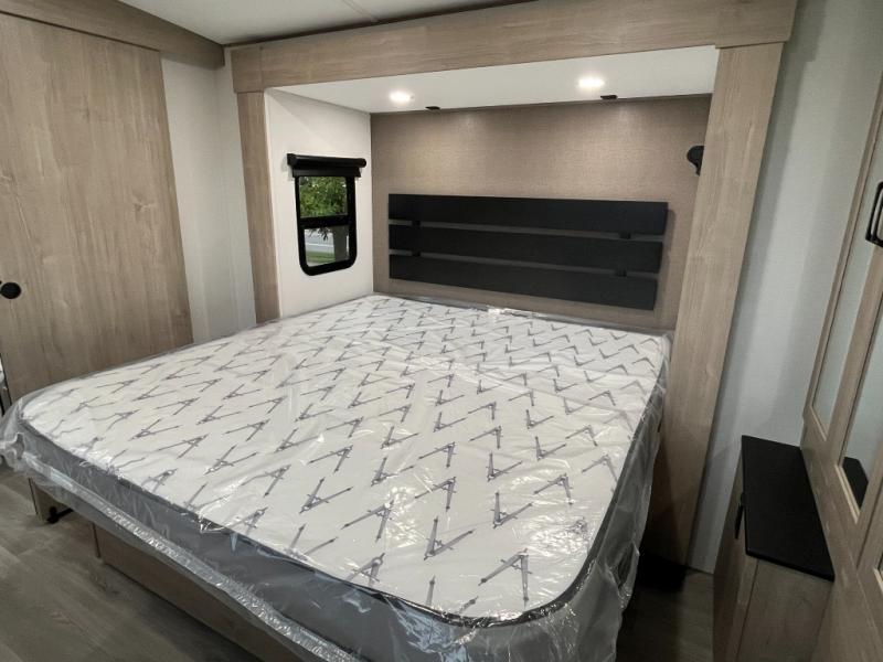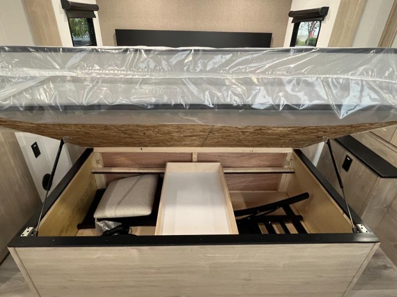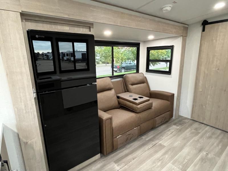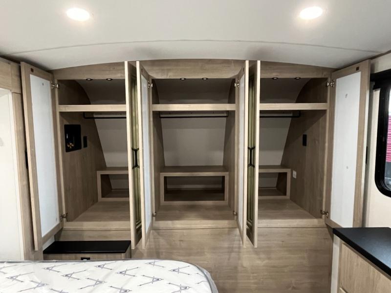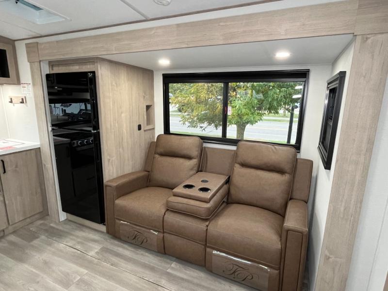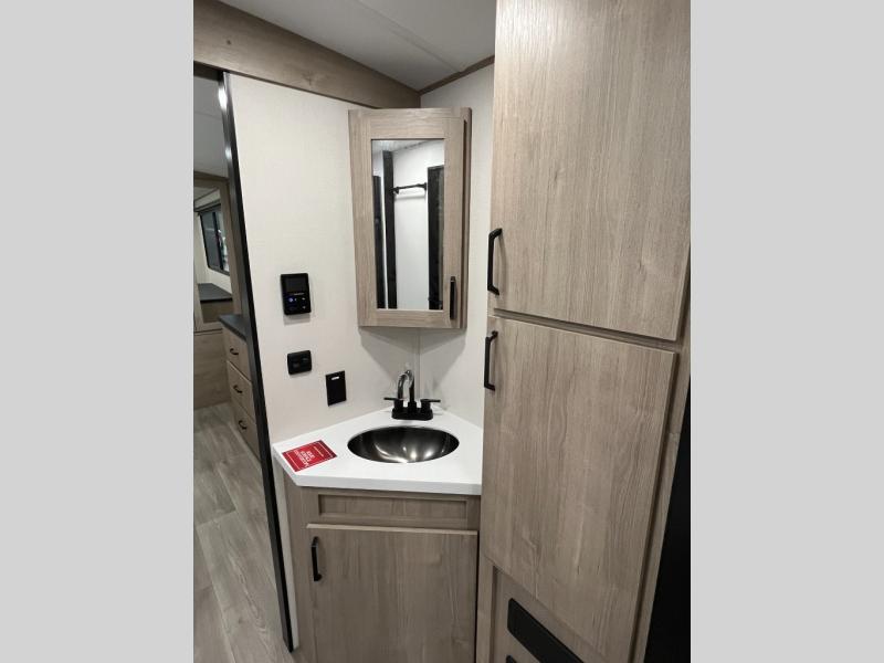At the front of the 2700BS trailer, you’ll find a spacious full bedroom featuring a 70" x 80" king bed housed in one of two slide outs, offering both generous space and a comfortable night’s rest. The room also includes a wardrobe and dresser, providing ample storage for clothing and essentials. Moving toward the center, the walk-through bathroom boasts a 30" x 36" residential walk-in shower with a skylight, a toilet, and a sink opposite a mirrored medicine cabinet for added convenience and storage. At the rear, the open-concept kitchen and living area make excellent use of the second slide out, which includes cozy theater seating, perfect for dining or relaxing while watching TV. Next to it sits a 10-cu. ft. refrigerator, offering plenty of room for groceries and refreshments. Across the space, the L-shaped kitchen spans the entire rear wall, giving you extensive countertop room for meal prep. Equipped with a three-burner range, oven, microwave, and stainless steel sink, this kitchen allows you to cook in comfort and style without relying on campsite facilities.