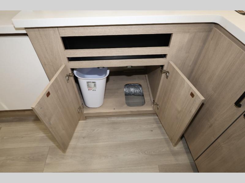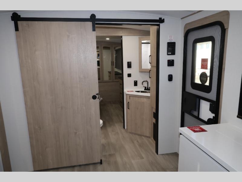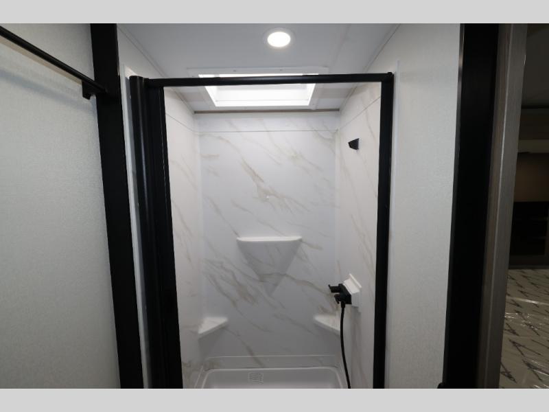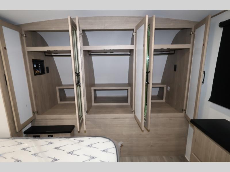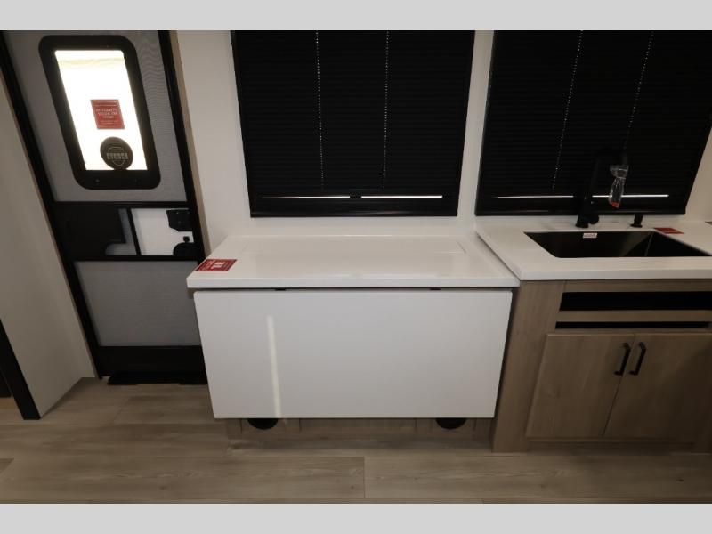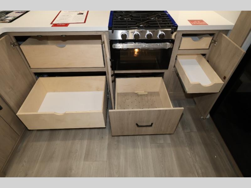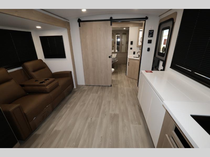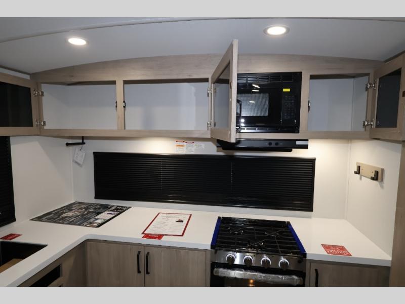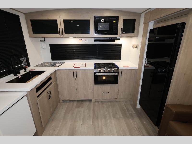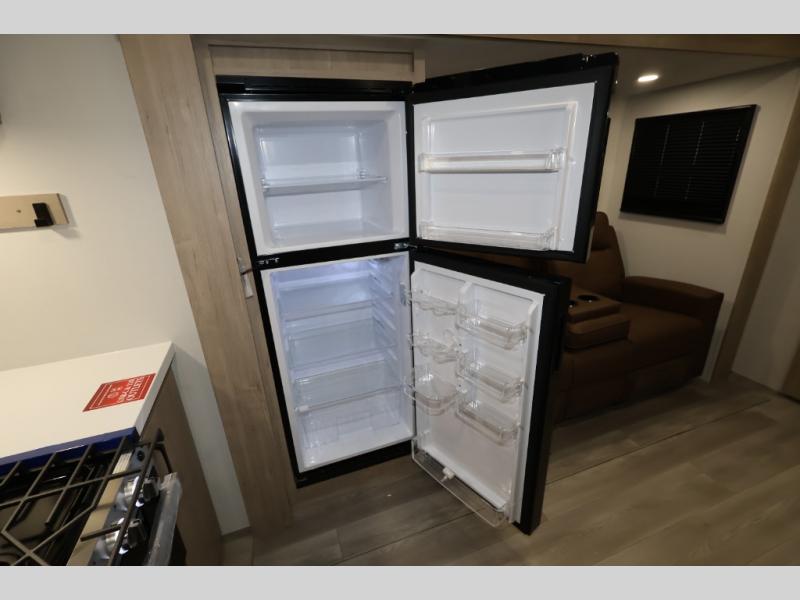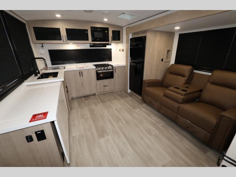 At the front of the 2700BS trailer, you’ll find a spacious full bedroom featuring a 70" x 80" king bed housed in one of two slide outs, offering both generous space and a comfortable night’s rest. The room also includes a wardrobe and dresser, providing ample storage for clothing and essentials. Moving toward the center, the walk-through bathroom boasts a 30" x 36" residential walk-in shower with a skylight, a toilet, and a sink opposite a mirrored medicine cabinet for added convenience and storage. At the rear, the open-concept kitchen and living area make excellent use of the second slide out, which includes cozy theater seating, perfect for dining or relaxing while watching TV. Next to it sits a 10-cu. ft. refrigerator, offering plenty of room for groceries and refreshments. Across the space, the L-shaped kitchen spans the entire rear wall, giving you extensive countertop room for meal prep. Equipped with a three-burner range, oven, microwave, and stainless steel sink, this kitchen allows you to cook in comfort and style without relying on campsite facilities.
