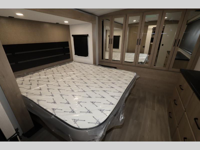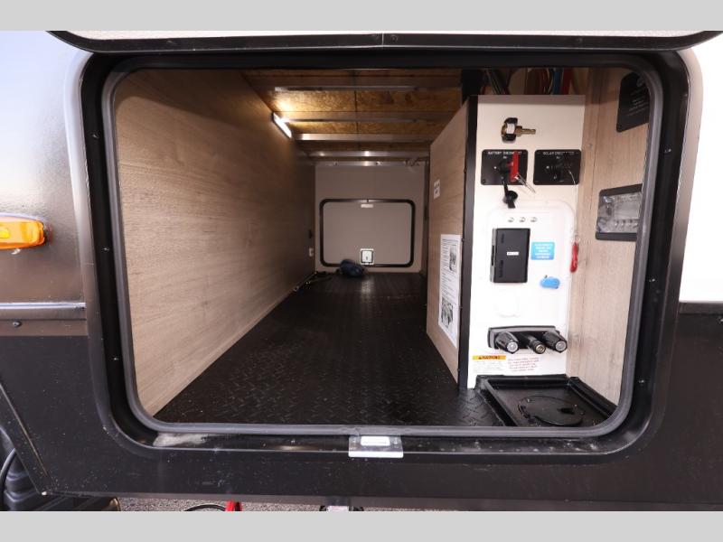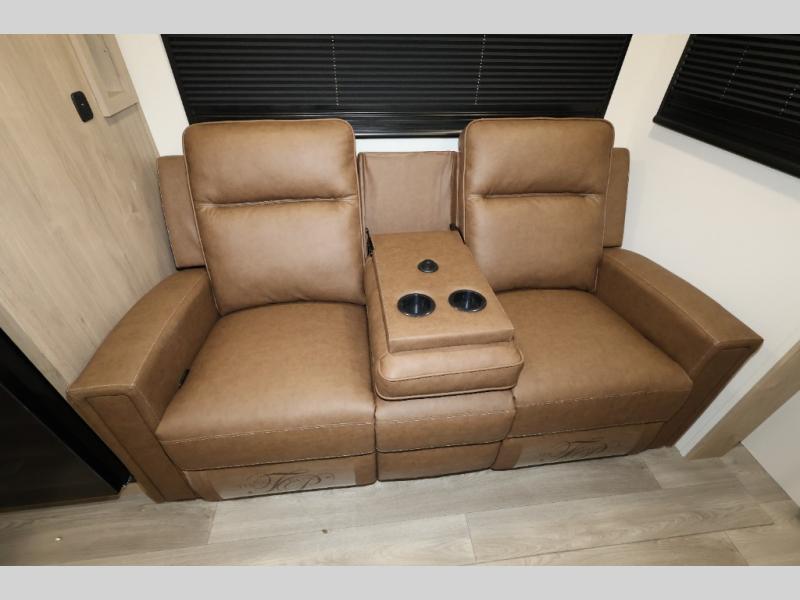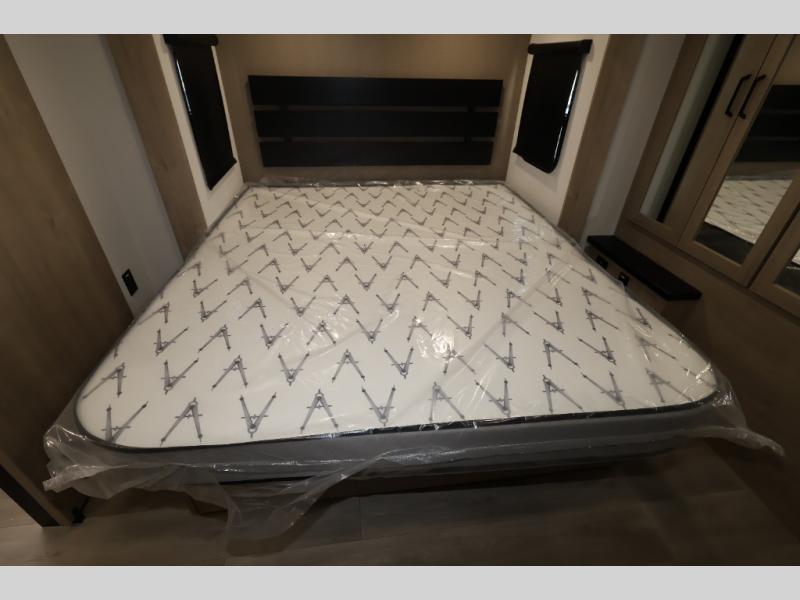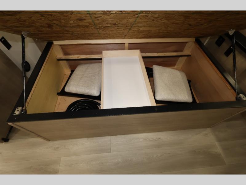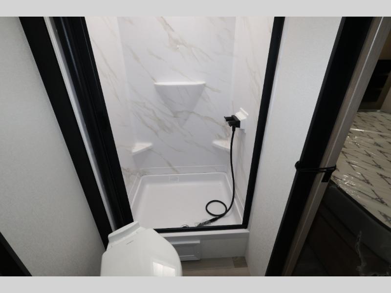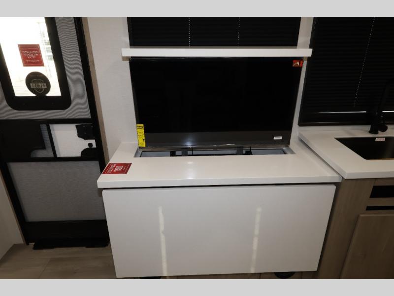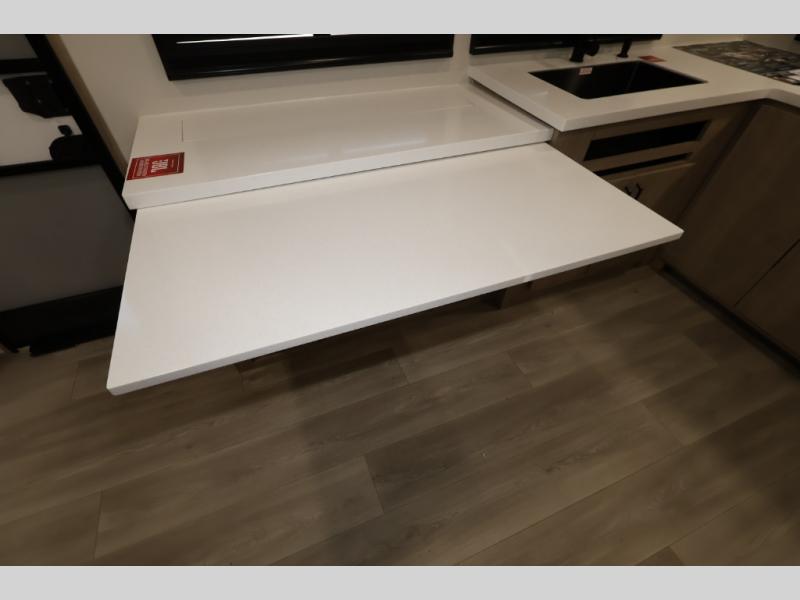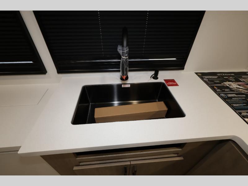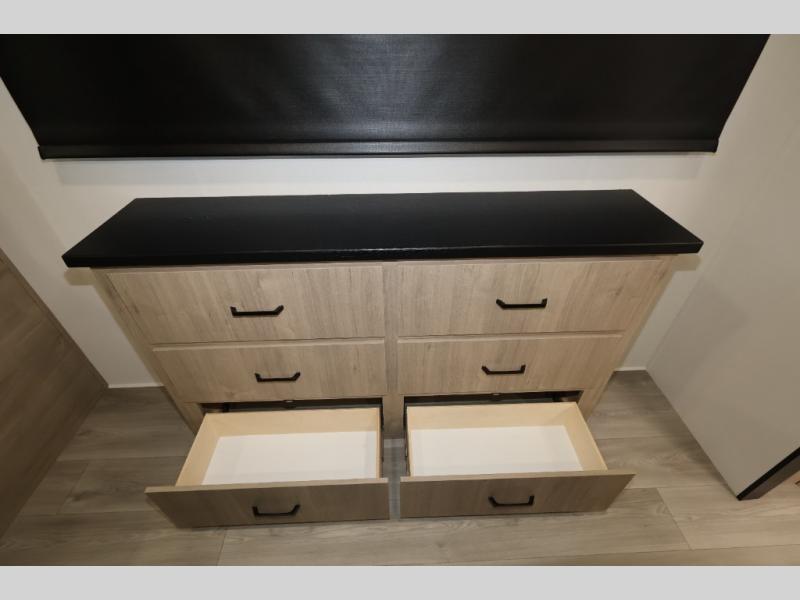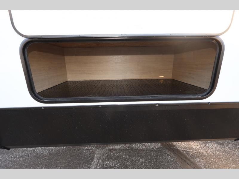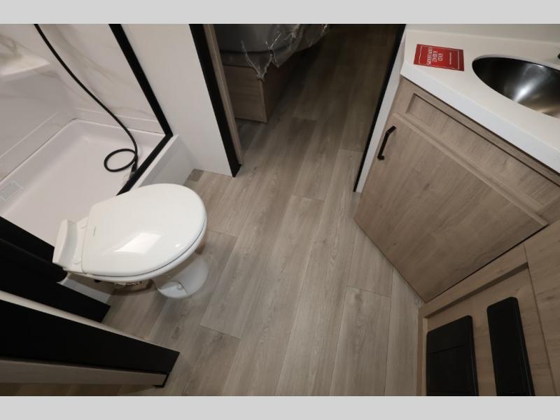 At the front of the 2700BS trailer, you’ll find a spacious full bedroom featuring a 70" x 80" king bed housed in one of two slide outs, offering both generous space and a comfortable night’s rest. The room also includes a wardrobe and dresser, providing ample storage for clothing and essentials. Moving toward the center, the walk-through bathroom boasts a 30" x 36" residential walk-in shower with a skylight, a toilet, and a sink opposite a mirrored medicine cabinet for added convenience and storage. At the rear, the open-concept kitchen and living area make excellent use of the second slide out, which includes cozy theater seating, perfect for dining or relaxing while watching TV. Next to it sits a 10-cu. ft. refrigerator, offering plenty of room for groceries and refreshments. Across the space, the L-shaped kitchen spans the entire rear wall, giving you extensive countertop room for meal prep. Equipped with a three-burner range, oven, microwave, and stainless steel sink, this kitchen allows you to cook in comfort and style without relying on campsite facilities.