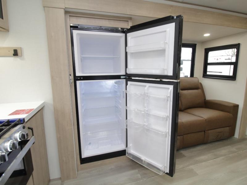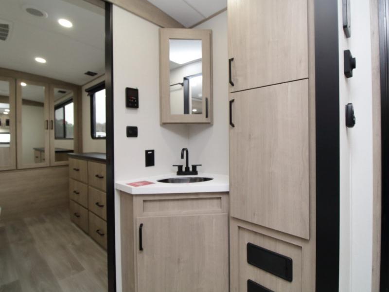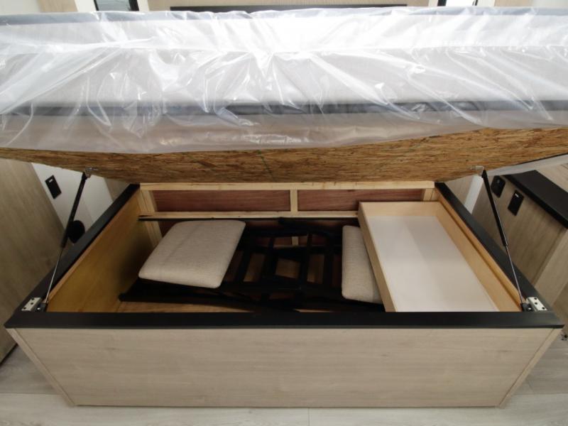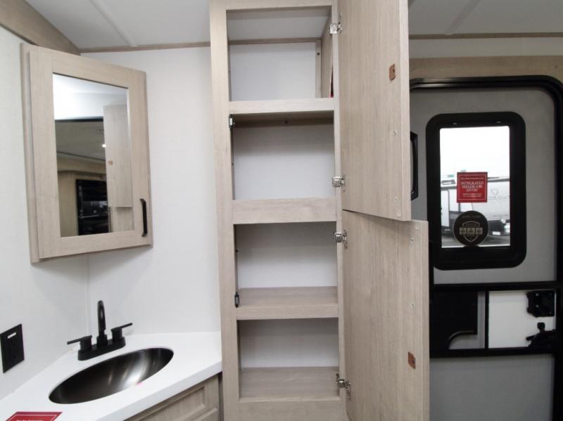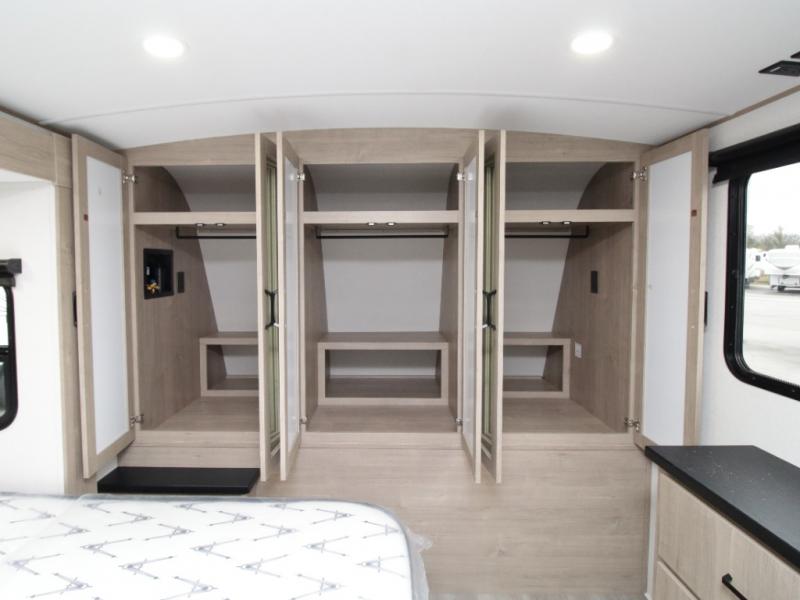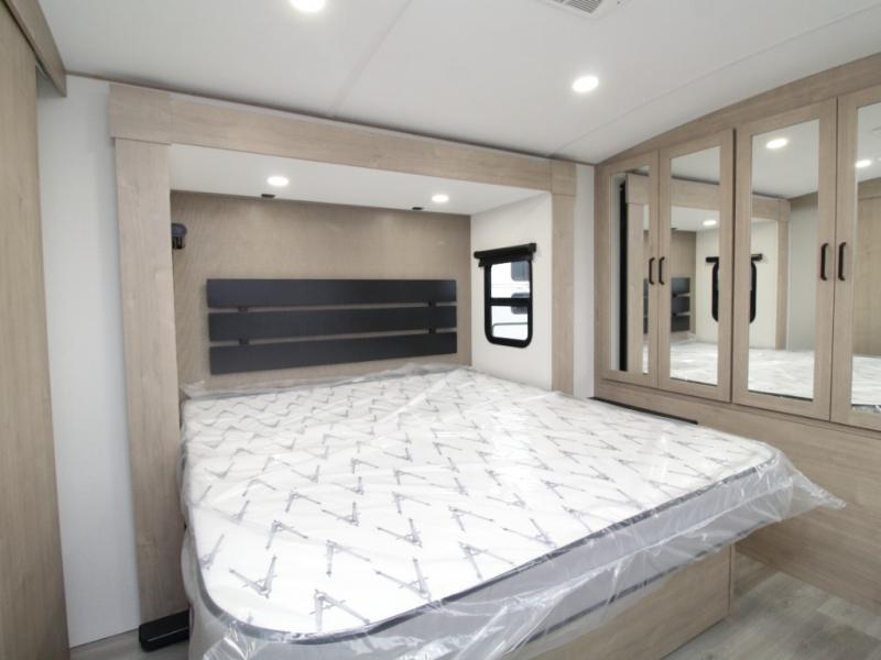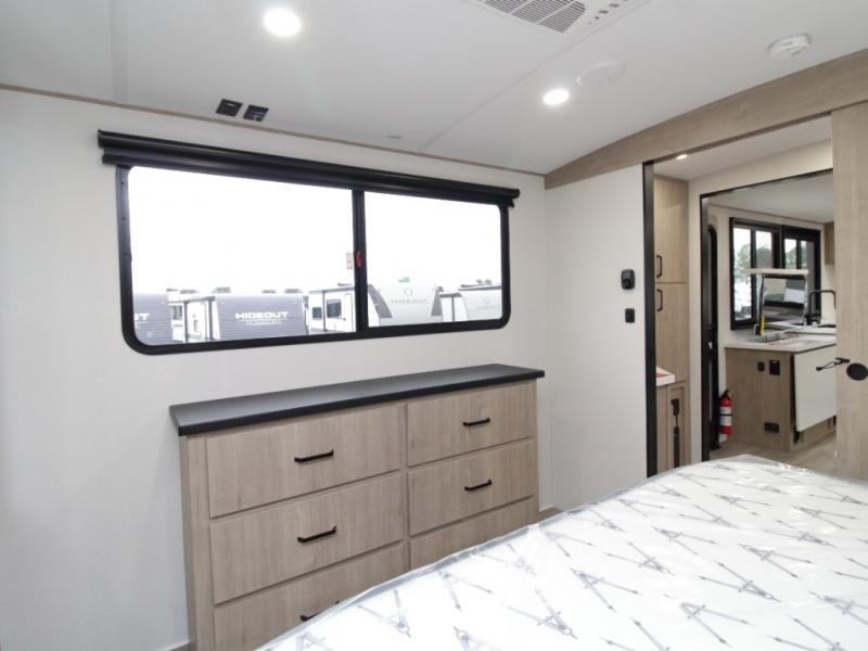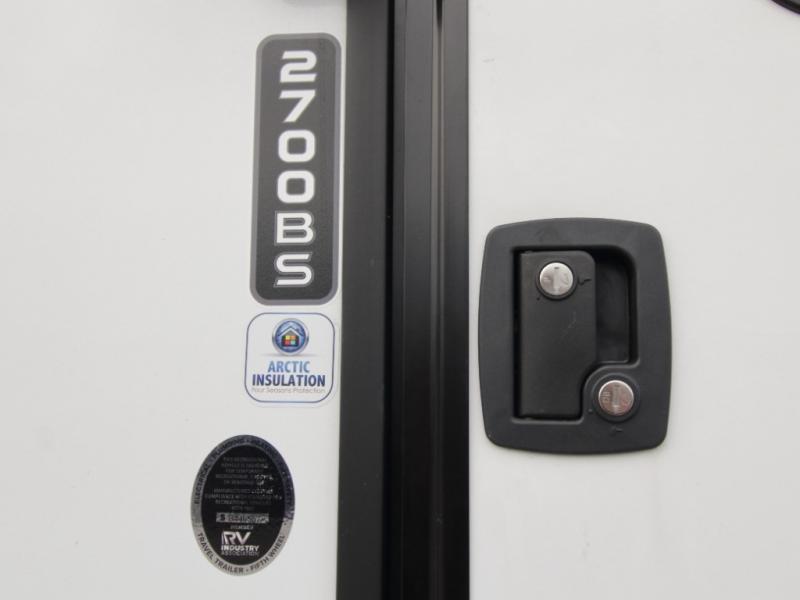 At the front of the 2700BS, you’ll find a private bedroom centered around a 70" x 80" king bed housed in a dedicated slide out. The added floor space makes it easy to move around, while the wardrobe and dresser offer generous storage for clothing, gear, and travel essentials. This comfortable retreat ensures a restful night wherever you set up camp.
