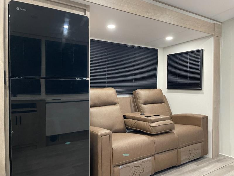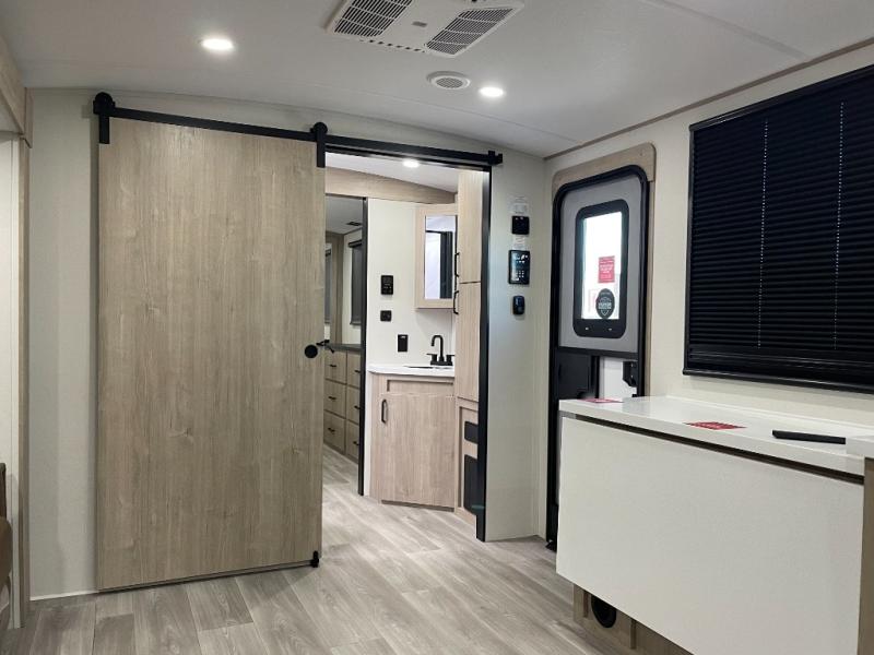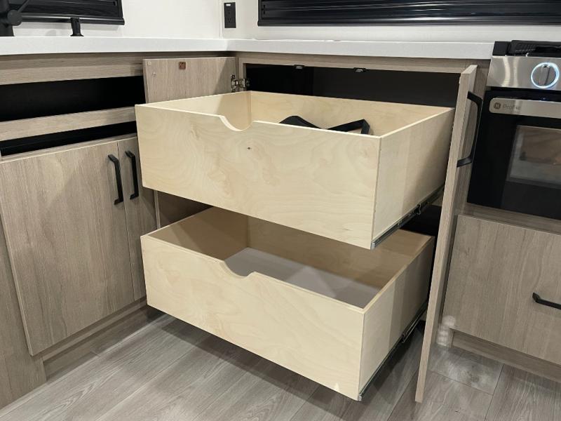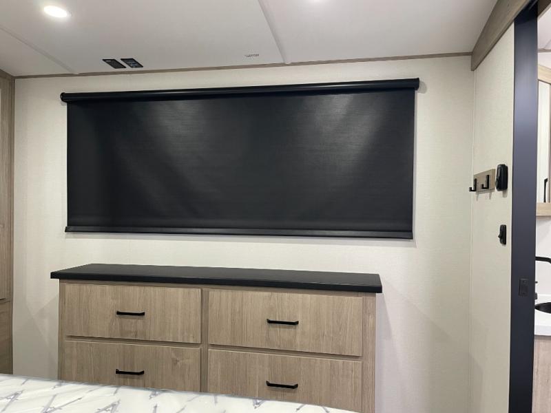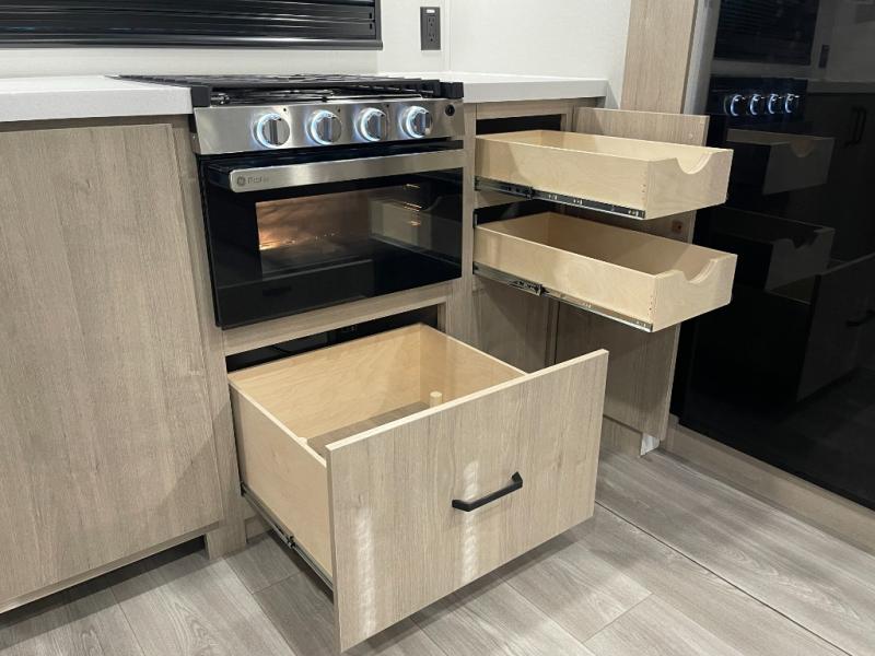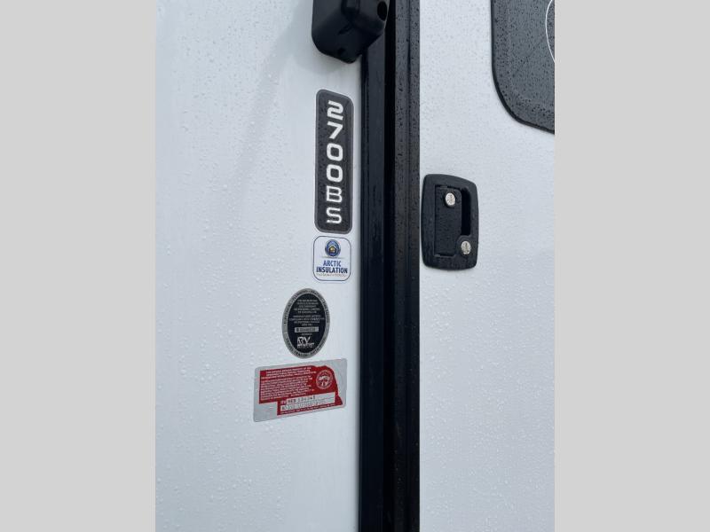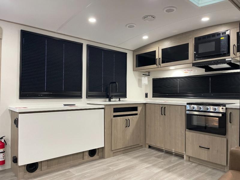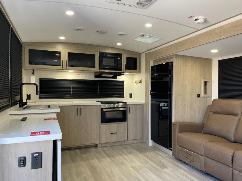 At the front of the 2700BS trailer, you’ll find a spacious full bedroom featuring a 70" x 80" king bed housed in one of two slide outs, offering both generous space and a comfortable night’s rest. The room also includes a wardrobe and dresser, providing ample storage for clothing and essentials. Moving toward the center, the walk-through bathroom boasts a 30" x 36" residential walk-in shower with a skylight, a toilet, and a sink opposite a mirrored medicine cabinet for added convenience and storage. At the rear, the open-concept kitchen and living area make excellent use of the second slide out, which includes cozy theater seating, perfect for dining or relaxing while watching TV. Next to it sits a 10-cu. ft. refrigerator, offering plenty of room for groceries and refreshments. Across the space, the L-shaped kitchen spans the entire rear wall, giving you extensive countertop room for meal prep. Equipped with a three-burner range, oven, microwave, and stainless steel sink, this kitchen allows you to cook in comfort and style without relying on campsite facilities.