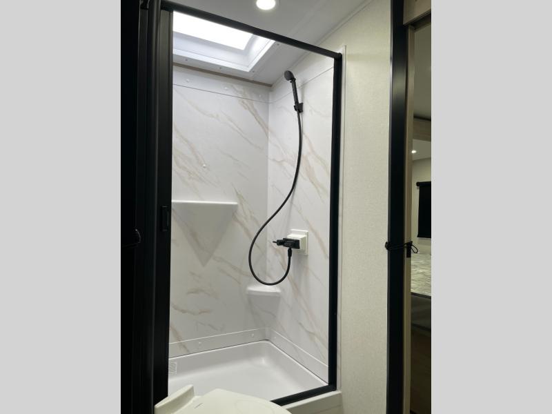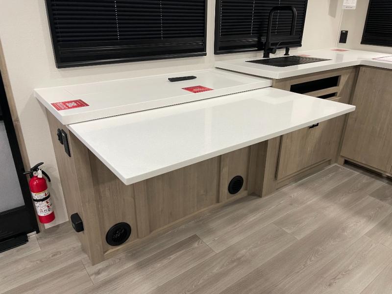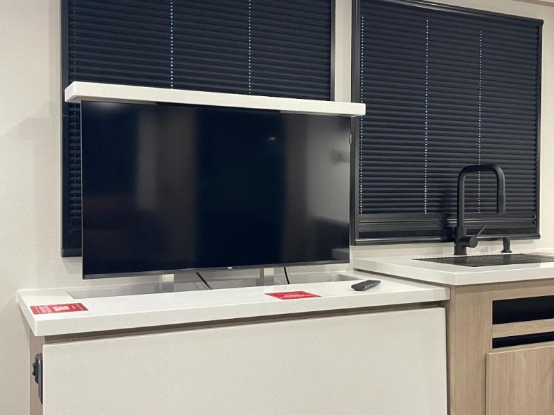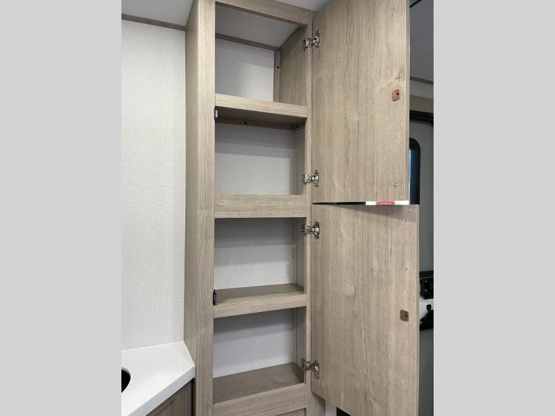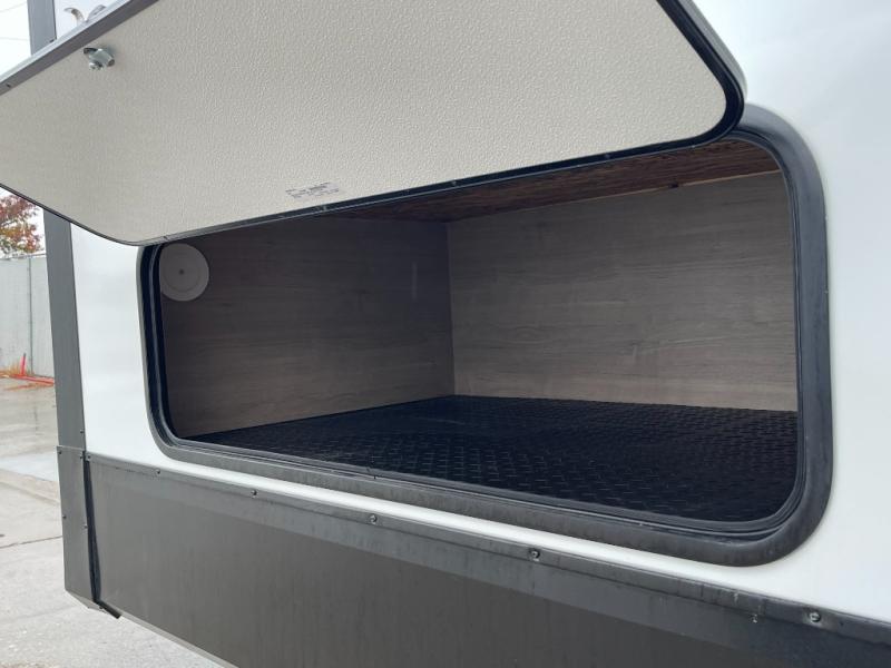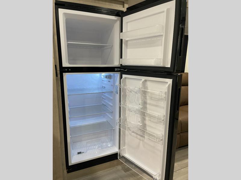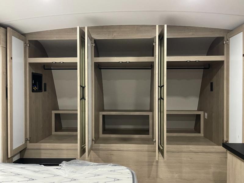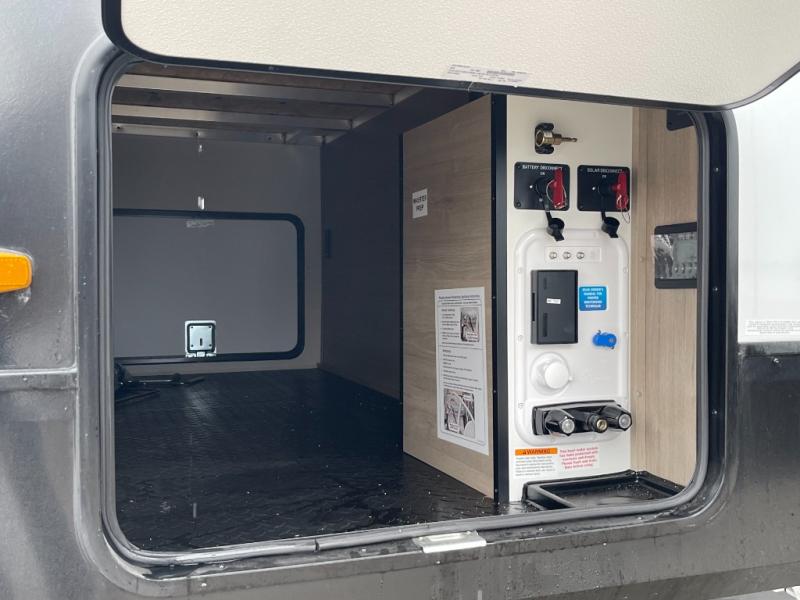 At the front of the 2700BS trailer, you’ll find a spacious full bedroom featuring a 70" x 80" king bed housed in one of two slide outs, offering both generous space and a comfortable night’s rest. The room also includes a wardrobe and dresser, providing ample storage for clothing and essentials. Moving toward the center, the walk-through bathroom boasts a 30" x 36" residential walk-in shower with a skylight, a toilet, and a sink opposite a mirrored medicine cabinet for added convenience and storage. At the rear, the open-concept kitchen and living area make excellent use of the second slide out, which includes cozy theater seating, perfect for dining or relaxing while watching TV. Next to it sits a 10-cu. ft. refrigerator, offering plenty of room for groceries and refreshments. Across the space, the L-shaped kitchen spans the entire rear wall, giving you extensive countertop room for meal prep. Equipped with a three-burner range, oven, microwave, and stainless steel sink, this kitchen allows you to cook in comfort and style without relying on campsite facilities.