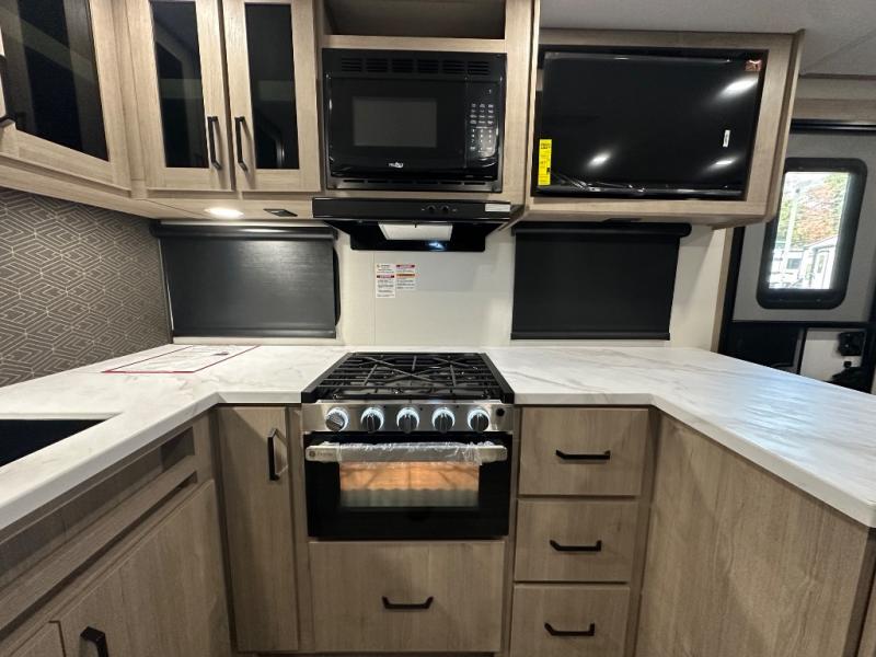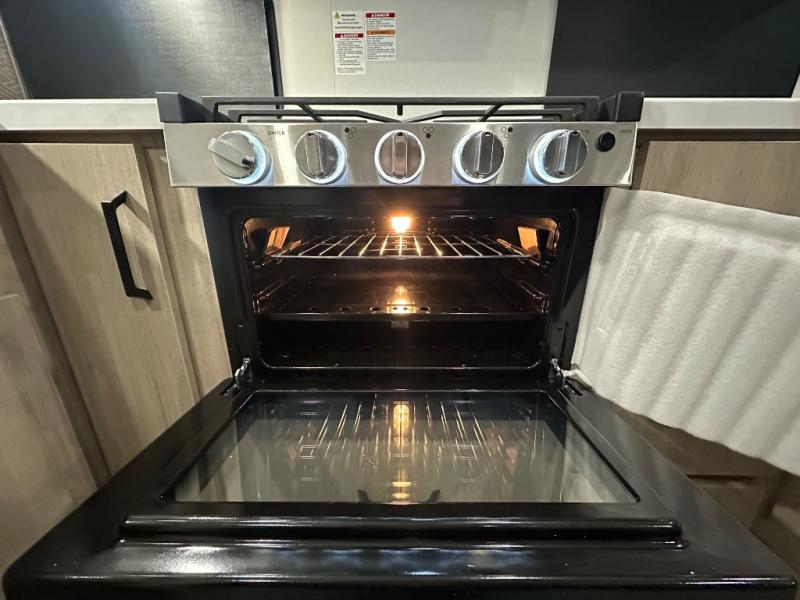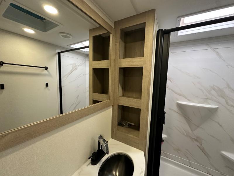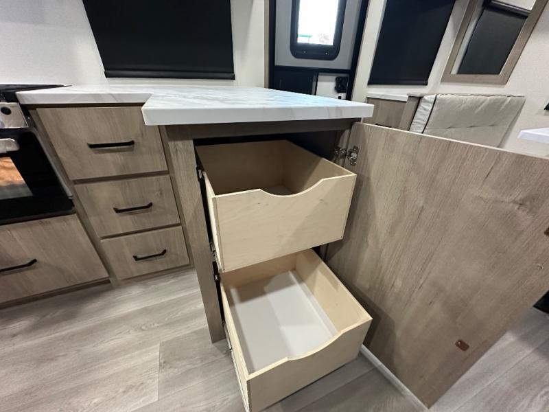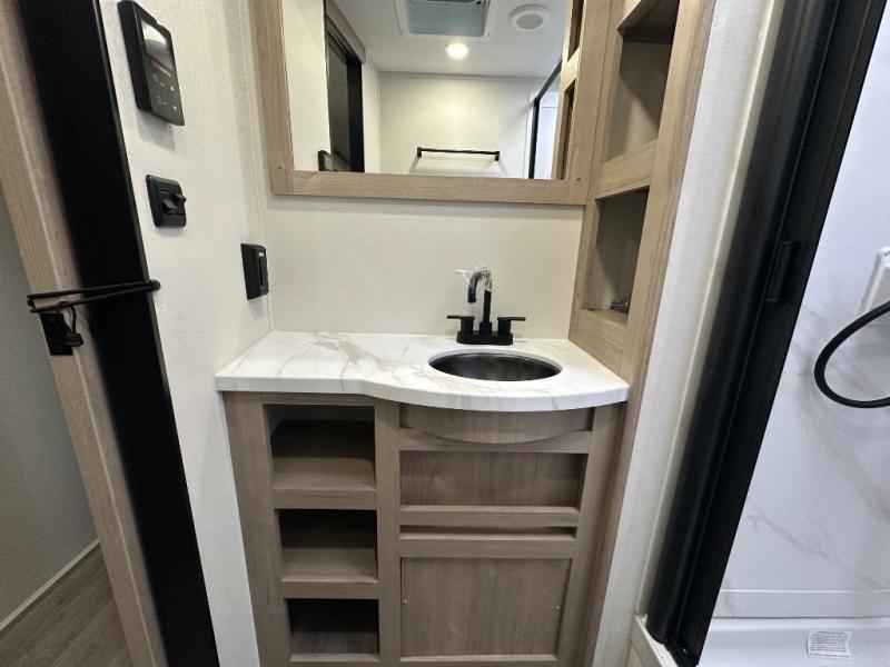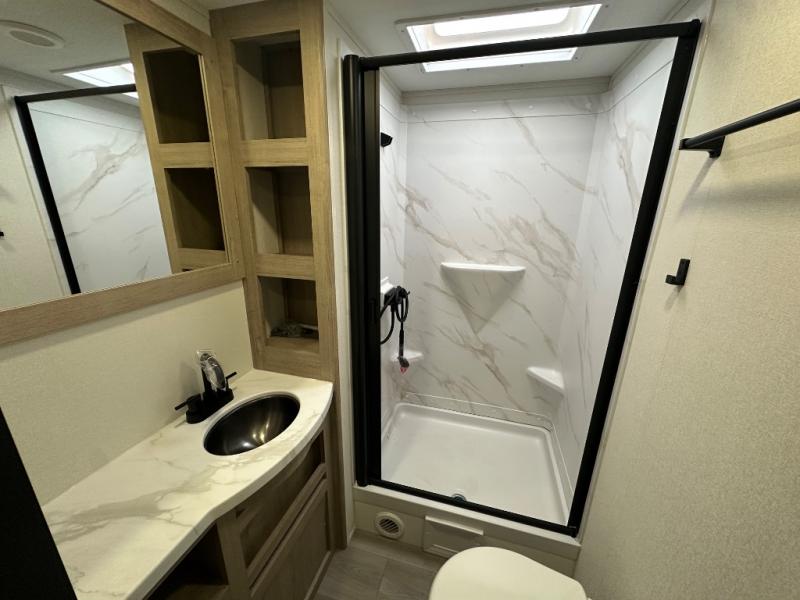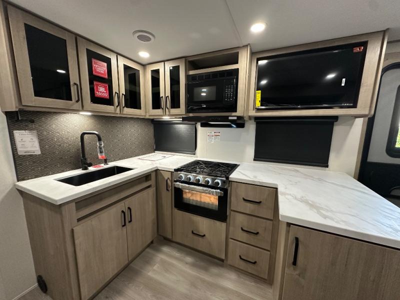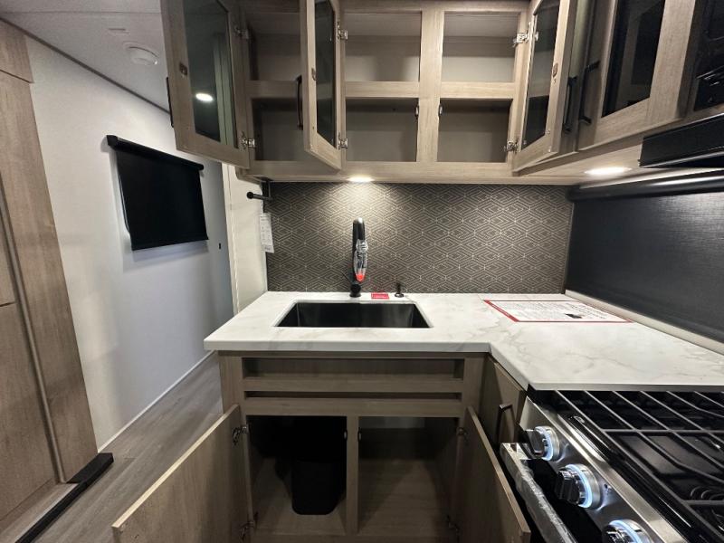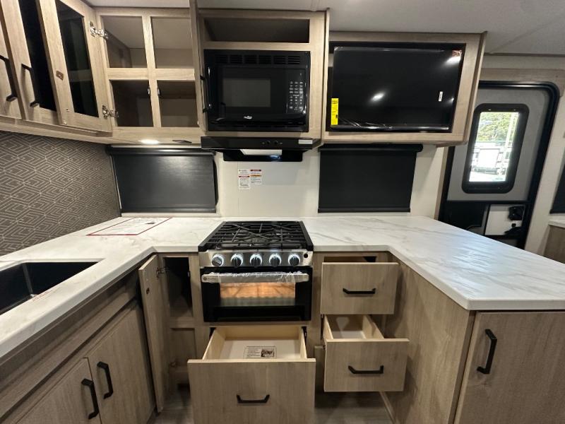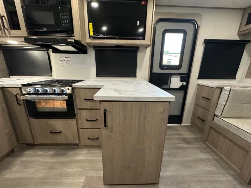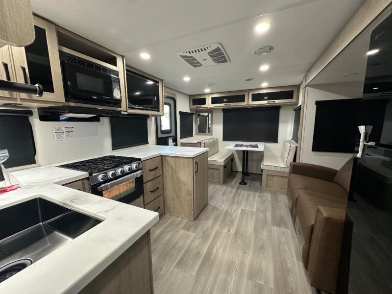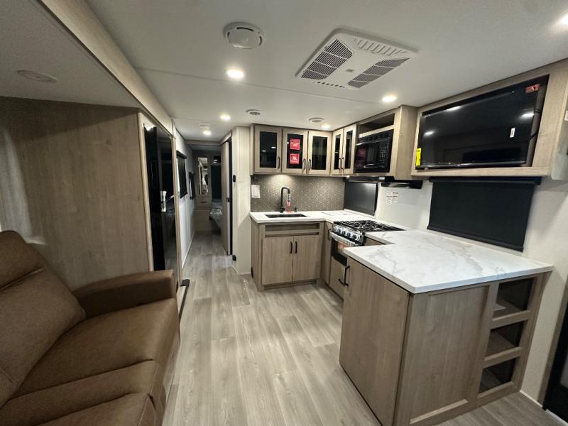 At the front of the 2700BS trailer, you’ll find a spacious full bedroom featuring a 70" x 80" king bed housed in one of two slide outs, offering both generous space and a comfortable night’s rest. The room also includes a wardrobe and dresser, providing ample storage for clothing and essentials. Moving toward the center, the walk-through bathroom boasts a 30" x 36" residential walk-in shower with a skylight, a toilet, and a sink opposite a mirrored medicine cabinet for added convenience and storage. At the rear, the open-concept kitchen and living area make excellent use of the second slide out, which includes cozy theater seating, perfect for dining or relaxing while watching TV. Next to it sits a 10-cu. ft. refrigerator, offering plenty of room for groceries and refreshments. Across the space, the L-shaped kitchen spans the entire rear wall, giving you extensive countertop room for meal prep. Equipped with a three-burner range, oven, microwave, and stainless steel sink, this kitchen allows you to cook in comfort and style without relying on campsite facilities.