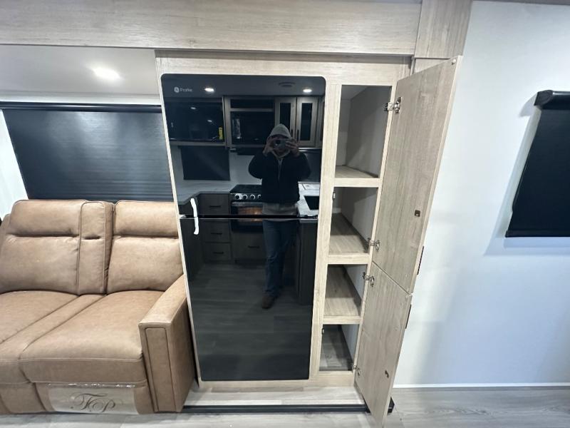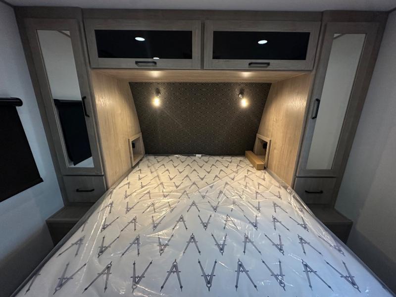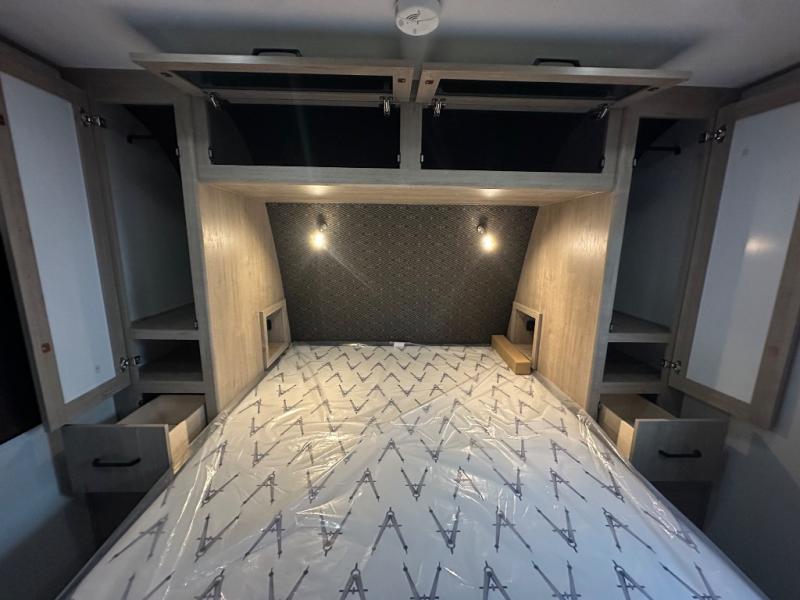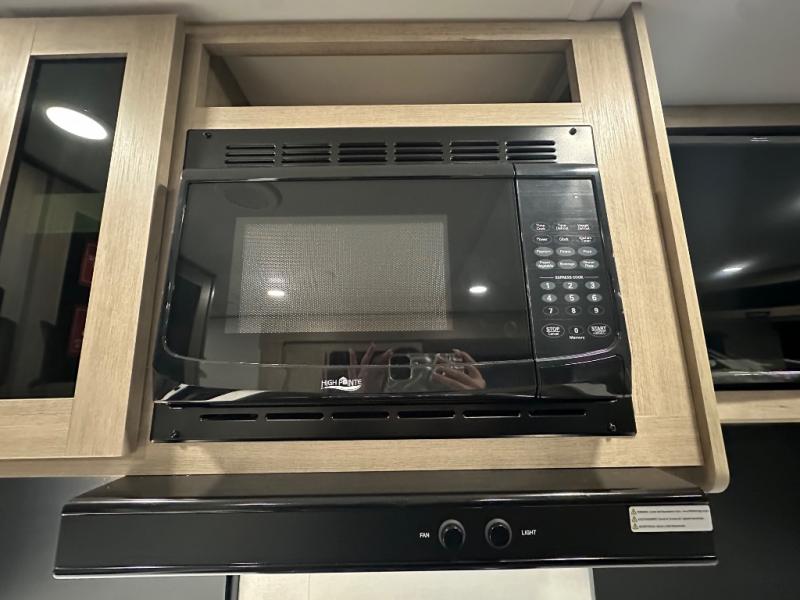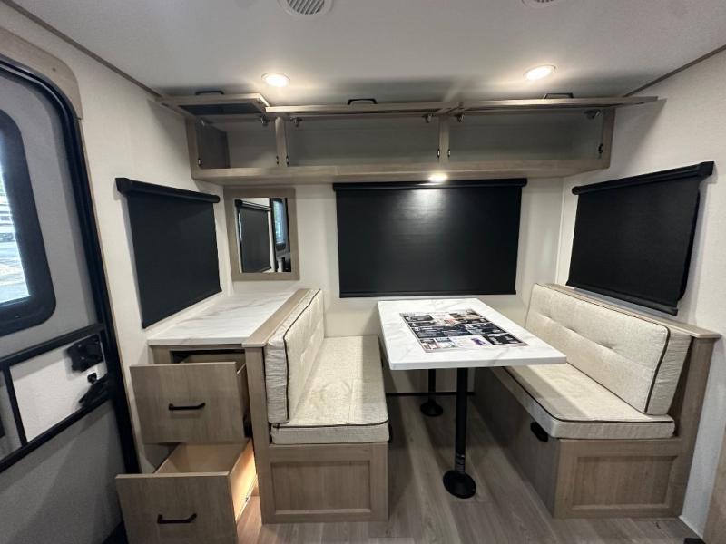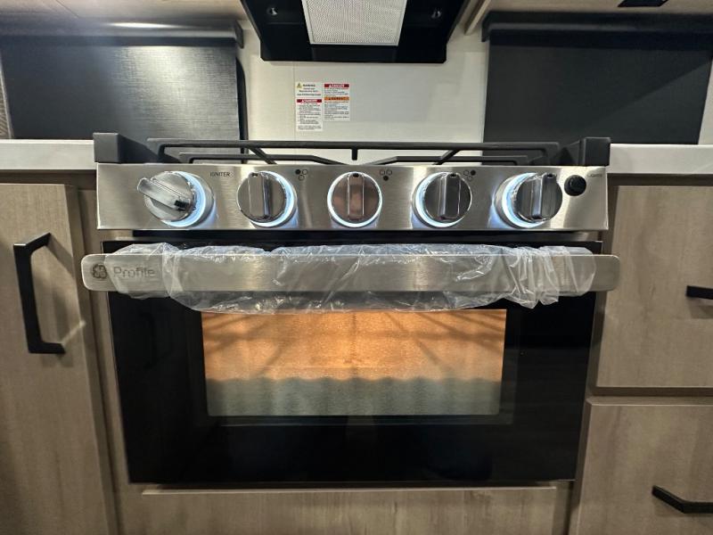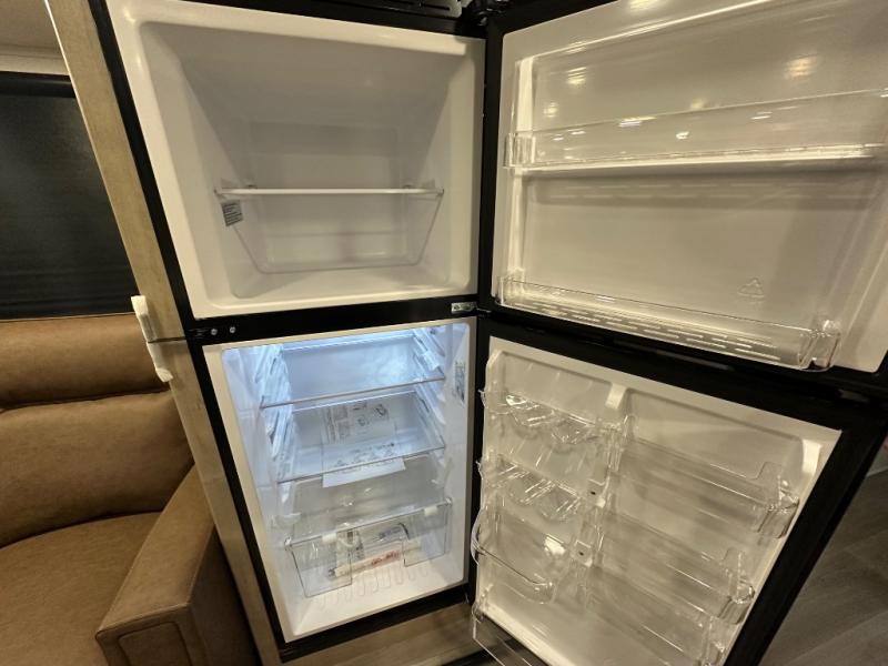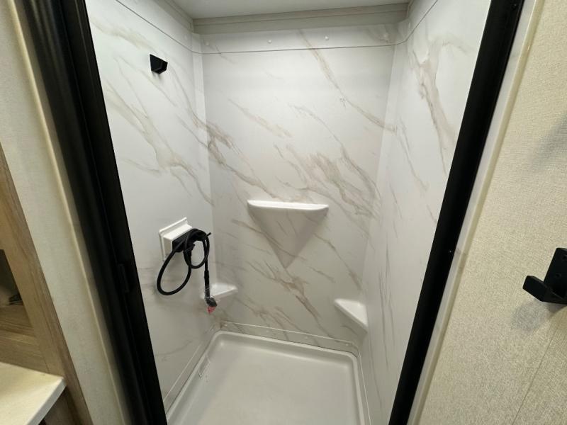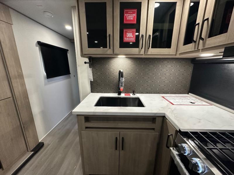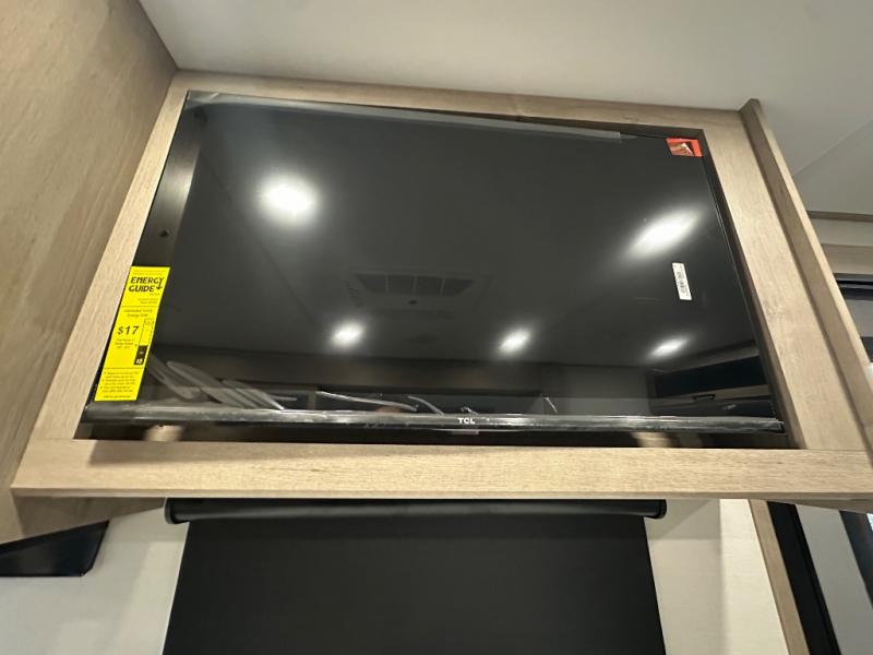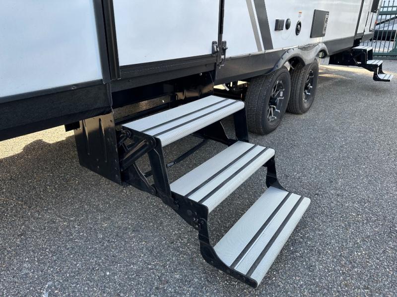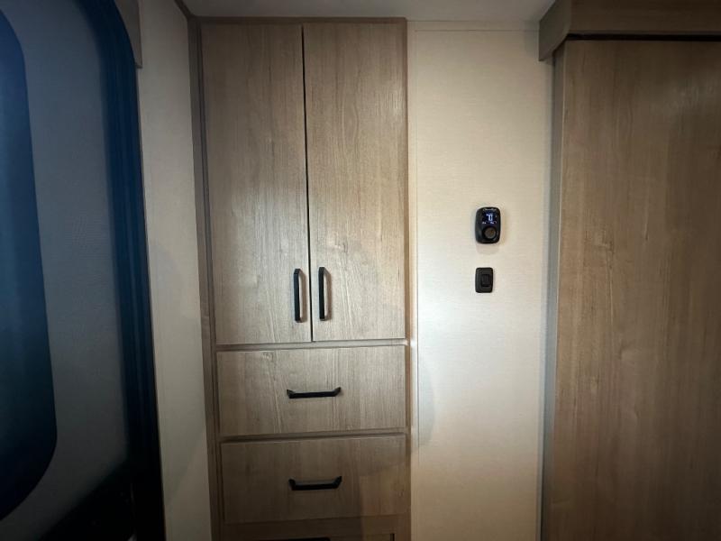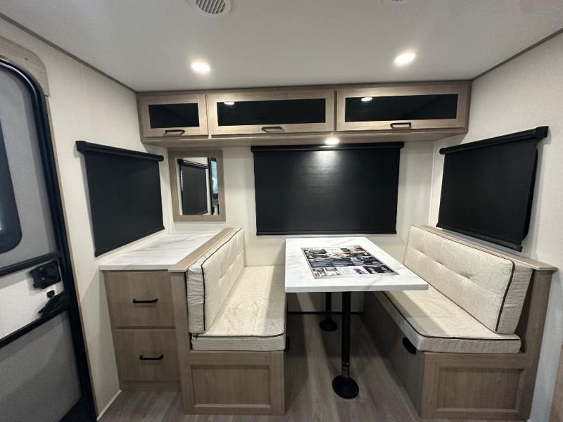 At the front of the 2700BS trailer, you’ll find a spacious full bedroom featuring a 70" x 80" king bed housed in one of two slide outs, offering both generous space and a comfortable night’s rest. The room also includes a wardrobe and dresser, providing ample storage for clothing and essentials. Moving toward the center, the walk-through bathroom boasts a 30" x 36" residential walk-in shower with a skylight, a toilet, and a sink opposite a mirrored medicine cabinet for added convenience and storage. At the rear, the open-concept kitchen and living area make excellent use of the second slide out, which includes cozy theater seating, perfect for dining or relaxing while watching TV. Next to it sits a 10-cu. ft. refrigerator, offering plenty of room for groceries and refreshments. Across the space, the L-shaped kitchen spans the entire rear wall, giving you extensive countertop room for meal prep. Equipped with a three-burner range, oven, microwave, and stainless steel sink, this kitchen allows you to cook in comfort and style without relying on campsite facilities.