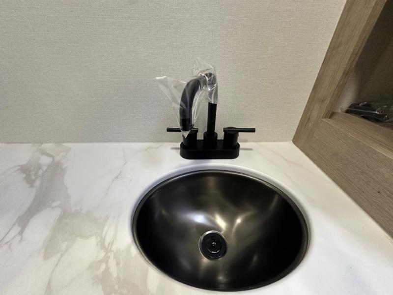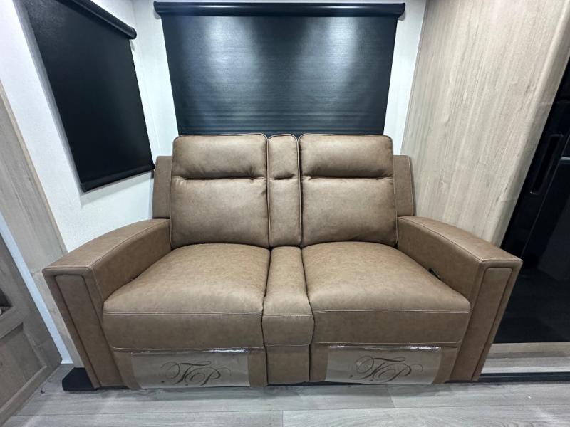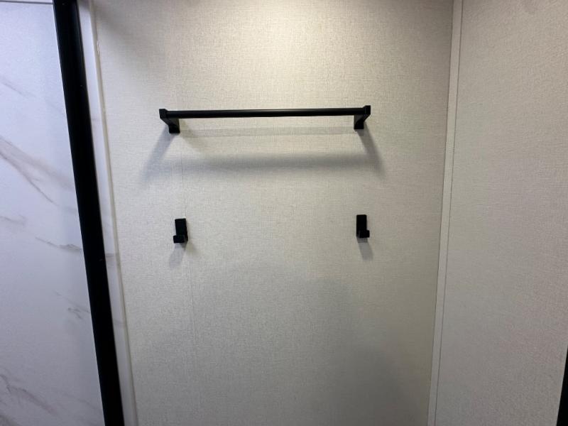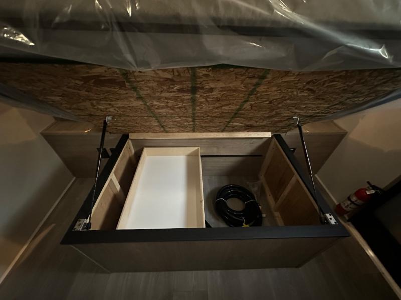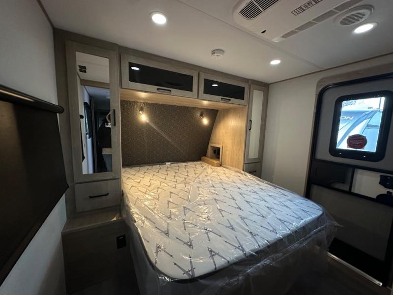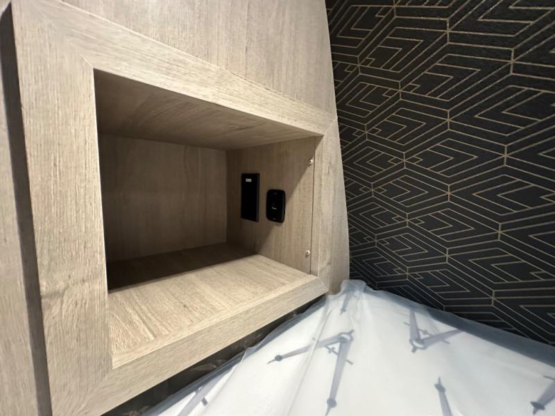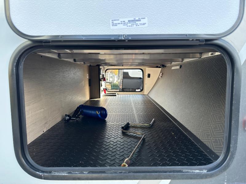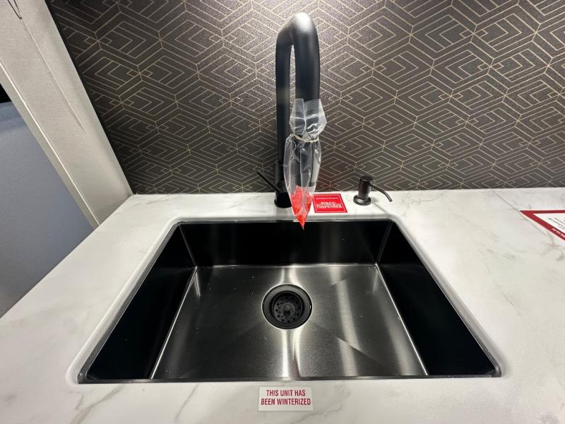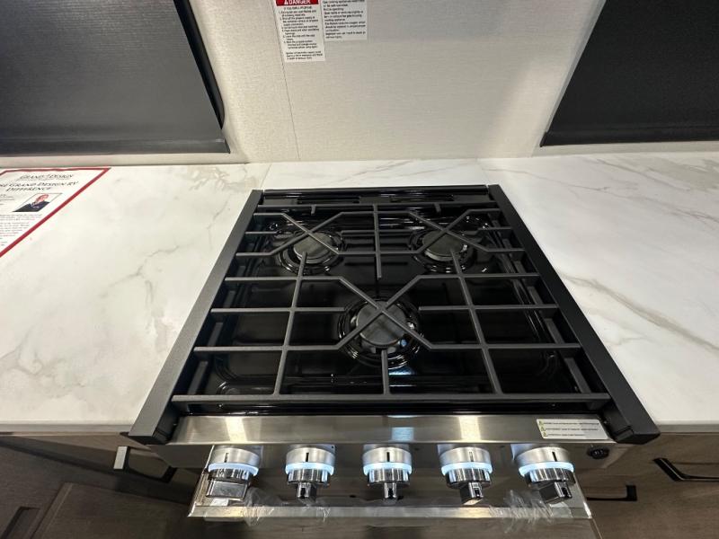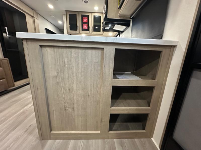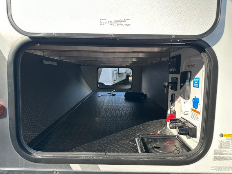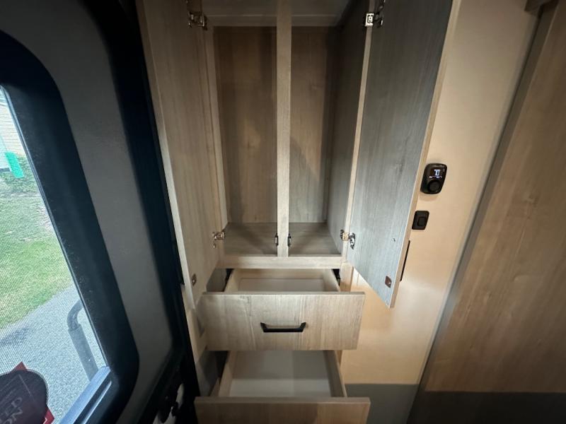 At the front of the 2700BS trailer, you’ll find a spacious full bedroom featuring a 70" x 80" king bed housed in one of two slide outs, offering both generous space and a comfortable night’s rest. The room also includes a wardrobe and dresser, providing ample storage for clothing and essentials. Moving toward the center, the walk-through bathroom boasts a 30" x 36" residential walk-in shower with a skylight, a toilet, and a sink opposite a mirrored medicine cabinet for added convenience and storage. At the rear, the open-concept kitchen and living area make excellent use of the second slide out, which includes cozy theater seating, perfect for dining or relaxing while watching TV. Next to it sits a 10-cu. ft. refrigerator, offering plenty of room for groceries and refreshments. Across the space, the L-shaped kitchen spans the entire rear wall, giving you extensive countertop room for meal prep. Equipped with a three-burner range, oven, microwave, and stainless steel sink, this kitchen allows you to cook in comfort and style without relying on campsite facilities.