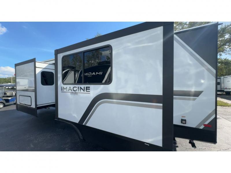 Just imagine leaving the world behind and secluding yourself away with your favorite people in your Grand Design Imagine travel trailer! The Imagine has been designed to enjoy camping and includes a high-capacity furnace, a heated and enclosed underbelly with suspended tanks, a designated heat duct to the subfloor, and a high-density roof insulation with attic vent. You'll have a large panoramic window to let natural lighting in and an adjustable Power Awning with LED Lights for those night gatherings. The exclusive drop-frame pass-through storage compartment is going to allow you to bring along lots of equipment, and the universal docking station is an all-in-one location for utilities and hook-ups. You'll also have oversized tank capacities so that you can fill and empty your tanks less often.