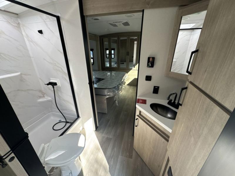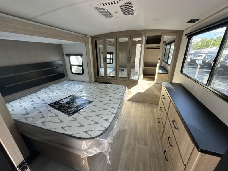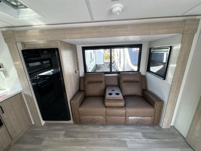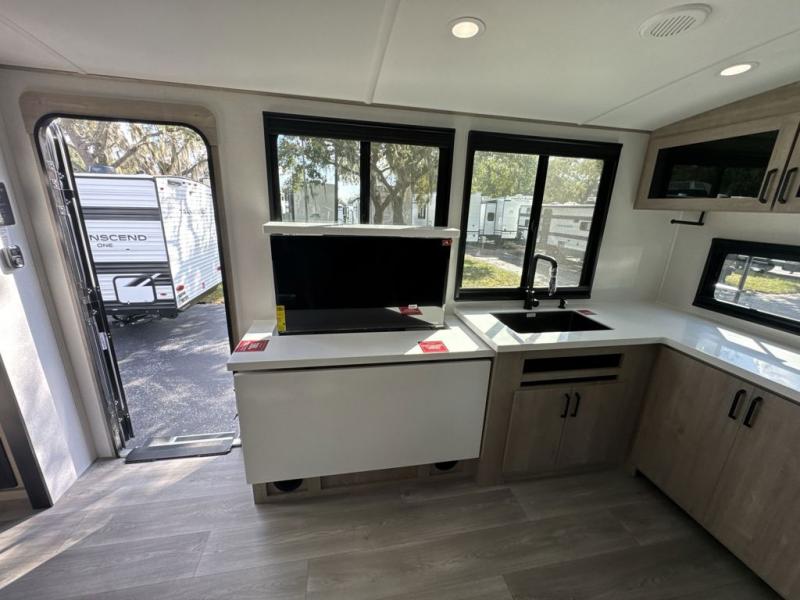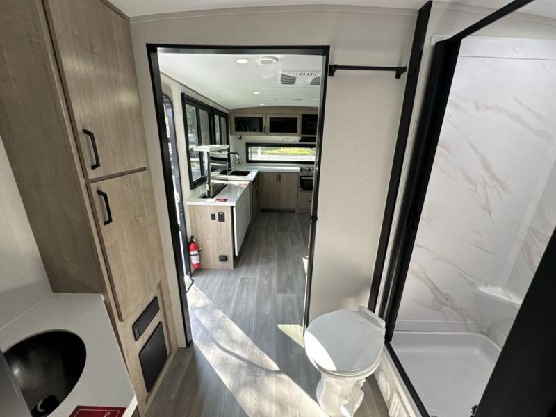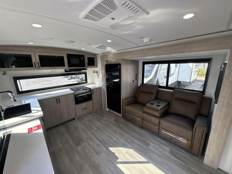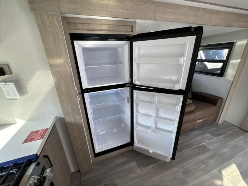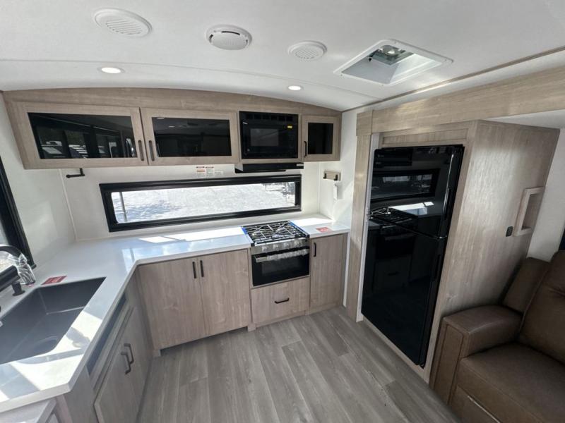 At the front of the 2700BS trailer, you’ll find a spacious full bedroom featuring a 70" x 80" king bed housed in one of two slide outs, offering both generous space and a comfortable night’s rest. The room also includes a wardrobe and dresser, providing ample storage for clothing and essentials. Moving toward the center, the walk-through bathroom boasts a 30" x 36" residential walk-in shower with a skylight, a toilet, and a sink opposite a mirrored medicine cabinet for added convenience and storage. At the rear, the open-concept kitchen and living area make excellent use of the second slide out, which includes cozy theater seating, perfect for dining or relaxing while watching TV. Next to it sits a 10-cu. ft. refrigerator, offering plenty of room for groceries and refreshments. Across the space, the L-shaped kitchen spans the entire rear wall, giving you extensive countertop room for meal prep. Equipped with a three-burner range, oven, microwave, and stainless steel sink, this kitchen allows you to cook in comfort and style without relying on campsite facilities.