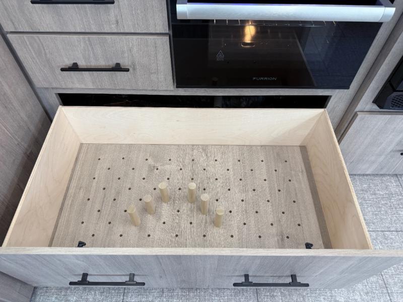 What I liked most: Bunk area area lifts up for additional storage which is very unique. Place for shoes. The bathroom shower surround has a brick molded design look.