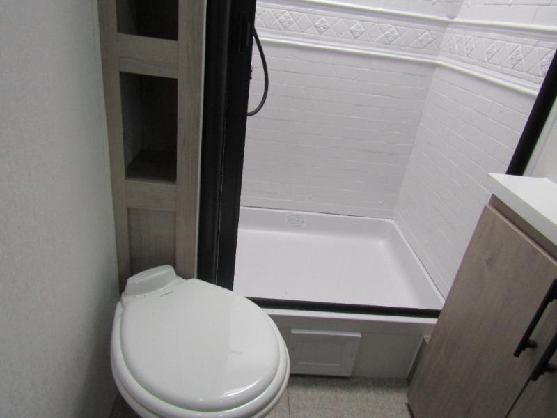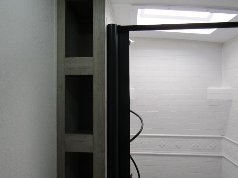 What I liked most: Bunk area area lifts up for additional storage which is very unique. Place for shoes. The bathroom shower surround has a brick molded design look.