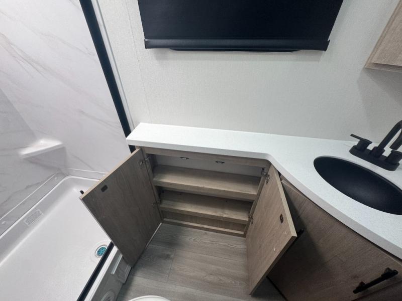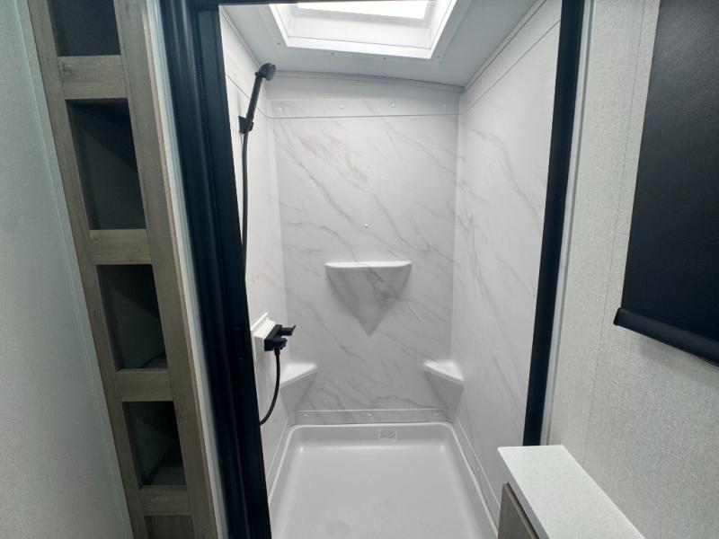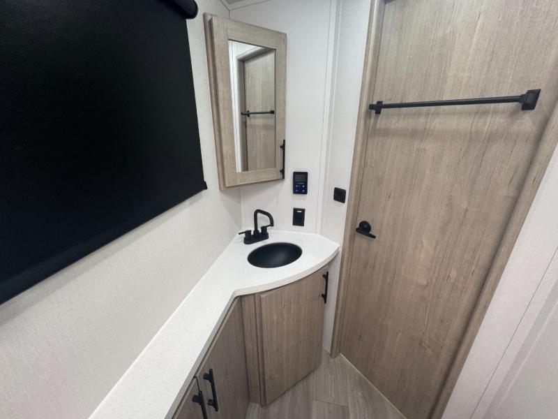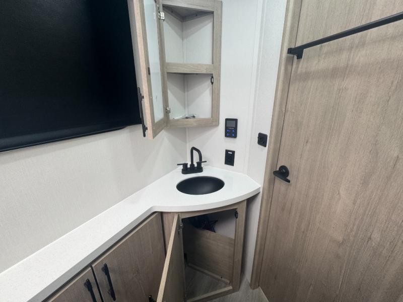 Enjoy the convenience of a residential-sized shower, medicine cabinet, and linen storage in a well-laid-out corner bath with its own exterior access—ideal for quick cleanups without tracking through the trailer.