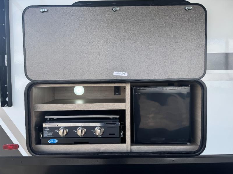 Bring all your gear with you thanks to massive pass-thru storage up front and enjoy cooking under the stars with the outdoor kitchen, complete with a mini fridge and cooktop.