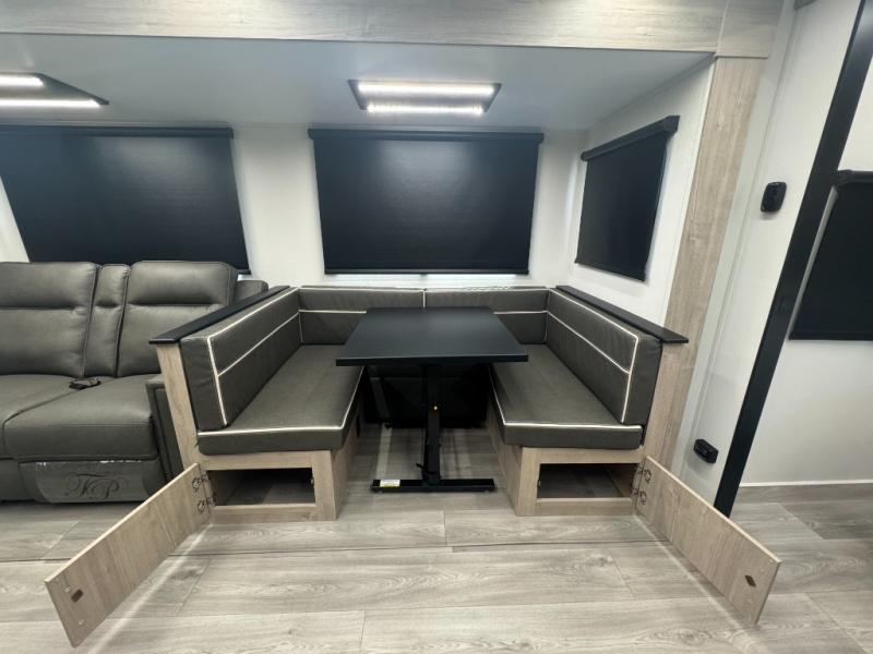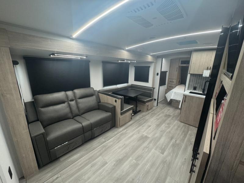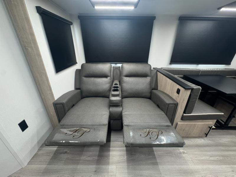 With a large slide-out featuring a tri-fold sofa and a booth dinette, the main living area is perfect for movie nights, family meals, or just stretching out and relaxing. The optional theater seating upgrade adds even more comfort.