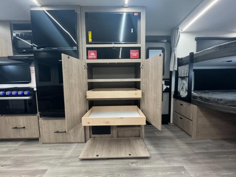 Double bunks, private queen suite, outdoor kitchen, and roomy slide-out—family camping made easy