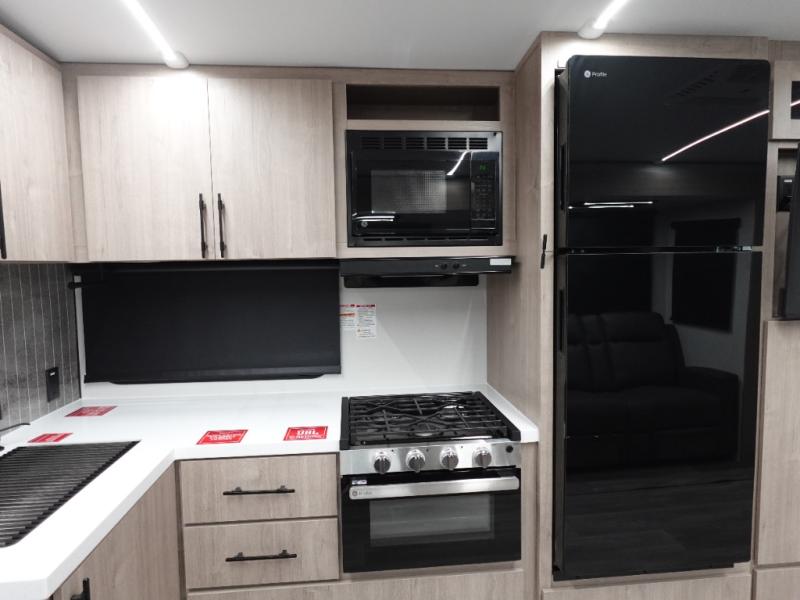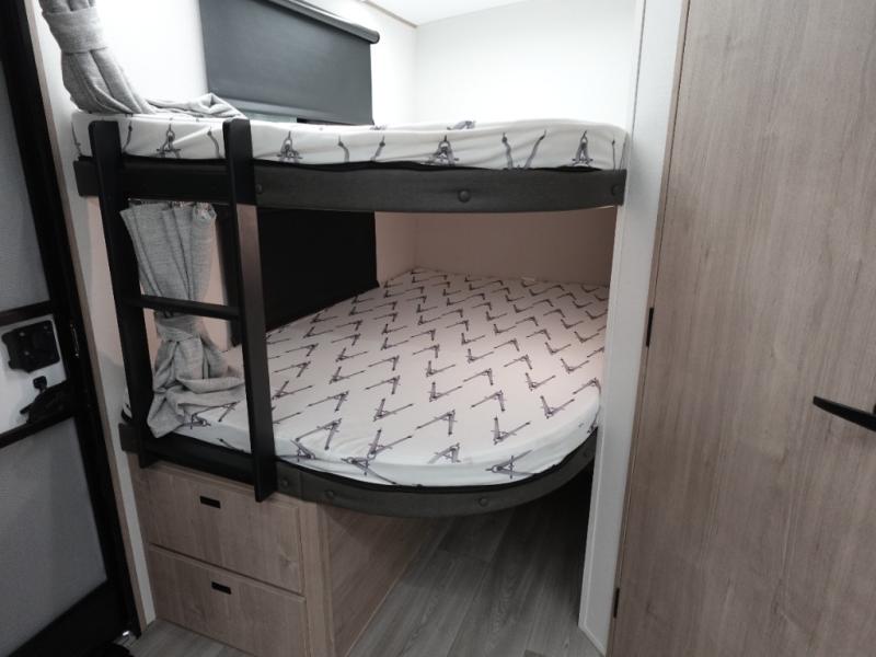 Where will you go with this Imagine travel trailer? The possibilities are endless! You can take your family on an exciting excursion because this trailer has enough sleeping space for everyone with a 60" x 80" queen bed in the private bedroom, a U-shaped dinette in the main living area, and there is a set of 47" x 76" bunk beds with privacy curtains in the rear corner. You can come and go as you please with two entry doors, and the outdoor griddle and refrigerator will be fun to use when the weather is nice. The flip-up countertop extension will make it easier to prepare delicious home cooked meals and the shoe storage area helps to keep things neat and tidy.
