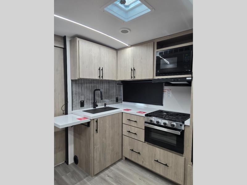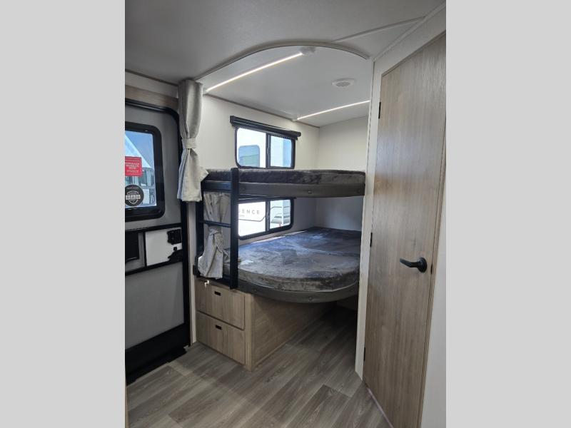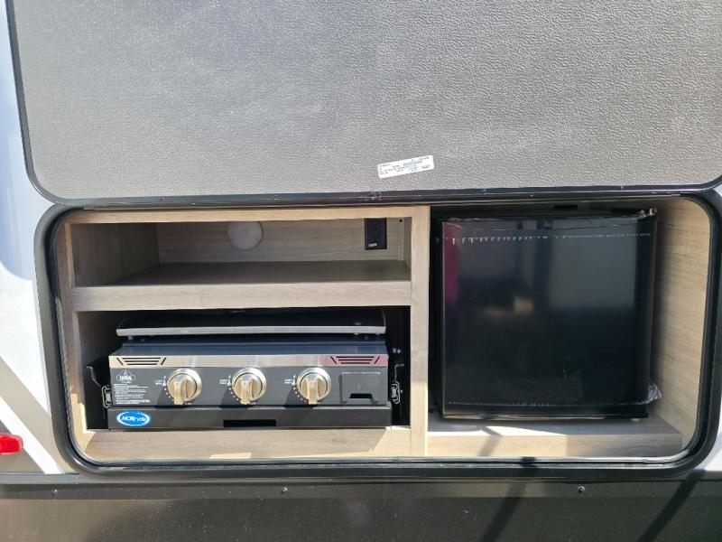 Where will you go with this Imagine travel trailer? The possibilities are endless! You can take your family on an exciting excursion because this trailer has enough sleeping space for everyone with a 60" x 80" queen bed in the private bedroom, a U-shaped dinette and tri-fold sofa in the main living area, and there is a set of 47" x 76" bunk beds with privacy curtains in the rear corner. You can come and go as you please with two entry doors, and the outdoor griddle and refrigerator will be fun to use when the weather is nice. The flip-up countertop extension will make it easier to prepare delicious home cooked meals and the shoe storage area helps to keep things neat and tidy.
