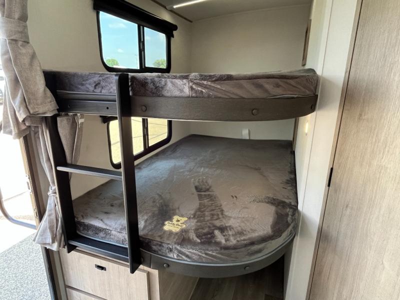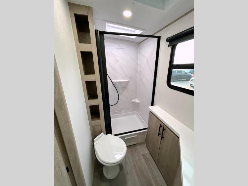 What I liked most: Bunk area area lifts up for additional storage which is very unique. Place for shoes. The bathroom shower surround has a brick molded design look.