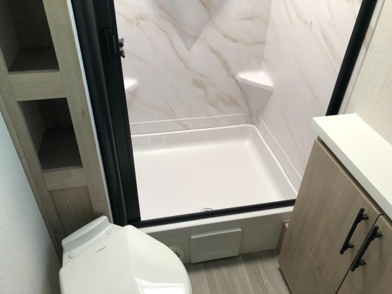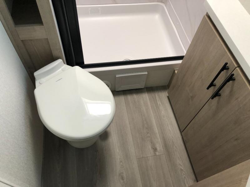 What I liked most: Bunk area area lifts up for additional storage which is very unique. Place for shoes. The bathroom shower surround has a brick molded design look.