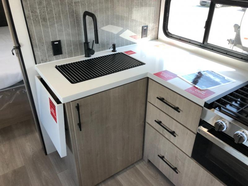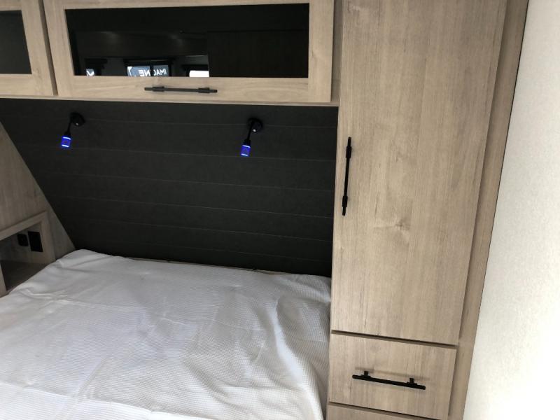 Where will you go with this Imagine travel trailer? The possibilities are endless! You can take your family on an exciting excursion because this trailer has enough sleeping space for everyone with a 60" x 80" queen bed in the private bedroom, a U-shaped dinette and tri-fold sofa in the main living area, and there is a set of 47" x 76" bunk beds with privacy curtains in the rear corner. You can come and go as you please with two entry doors, and the outdoor griddle and refrigerator will be fun to use when the weather is nice. The flip-up countertop extension will make it easier to prepare delicious home cooked meals and the shoe storage area helps to keep things neat and tidy.
