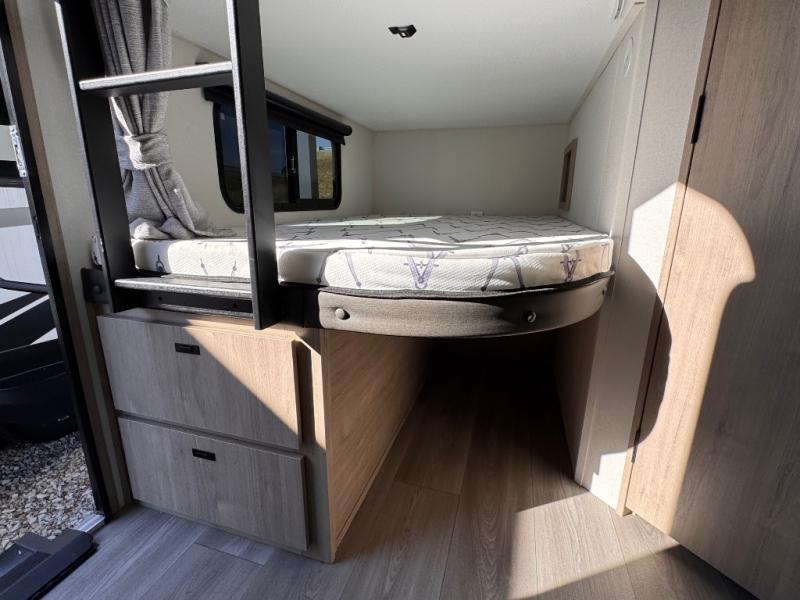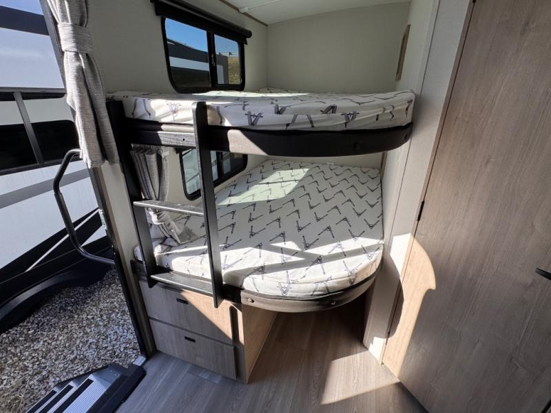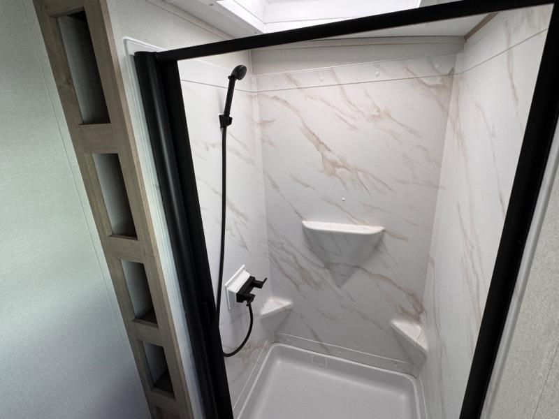 What I liked most: Bunk area area lifts up for additional storage which is very unique. Place for shoes. The bathroom shower surround has a brick molded design look.