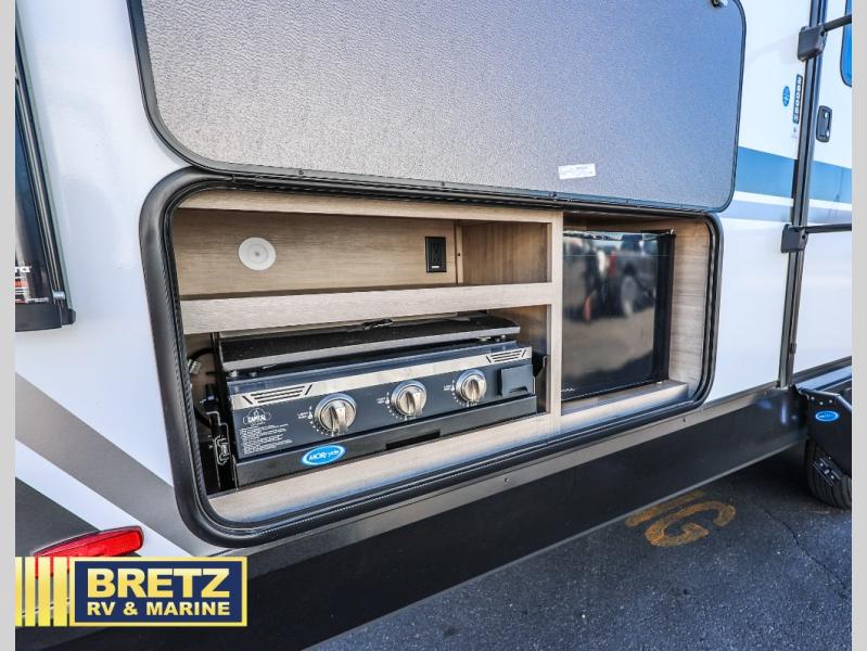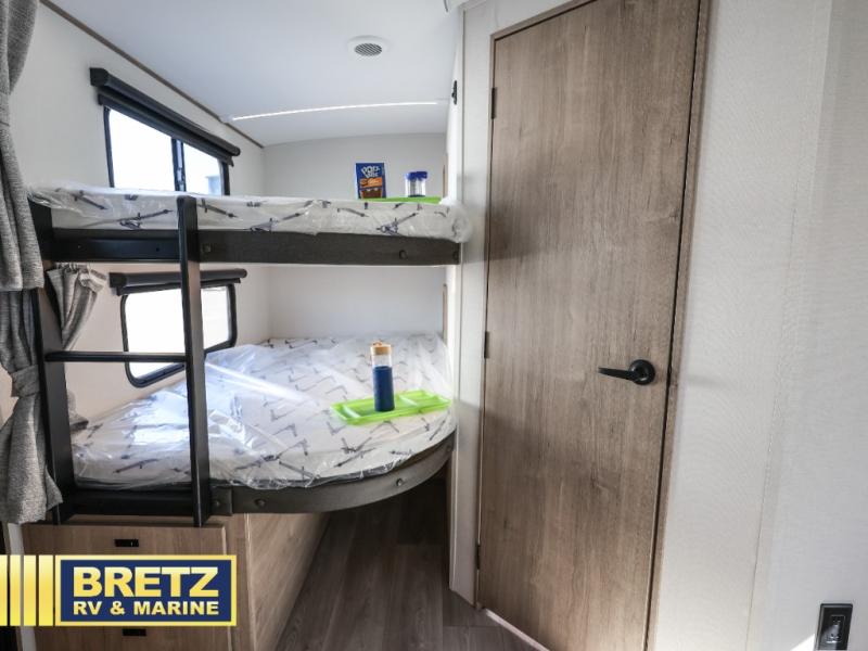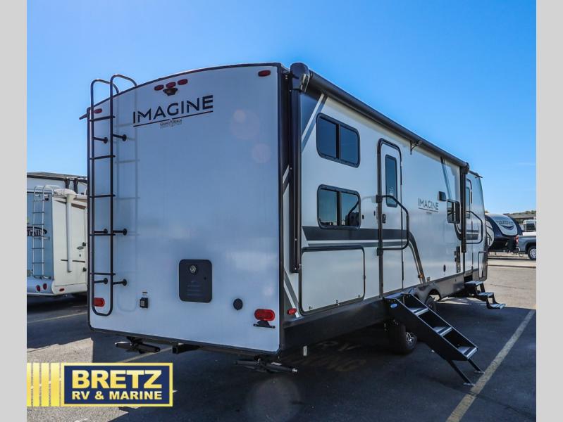 Where will you go with this Imagine travel trailer? The possibilities are endless! You can take your family on an exciting excursion because this trailer has enough sleeping space for everyone with a 60" x 80" queen bed in the private bedroom, a U-shaped dinette and tri-fold sofa in the main living area, and there is a set of 47" x 76" bunk beds with privacy curtains in the rear corner. You can come and go as you please with two entry doors, and the outdoor griddle and refrigerator will be fun to use when the weather is nice. The flip-up countertop extension will make it easier to prepare delicious home cooked meals and the shoe storage area helps to keep things neat and tidy.