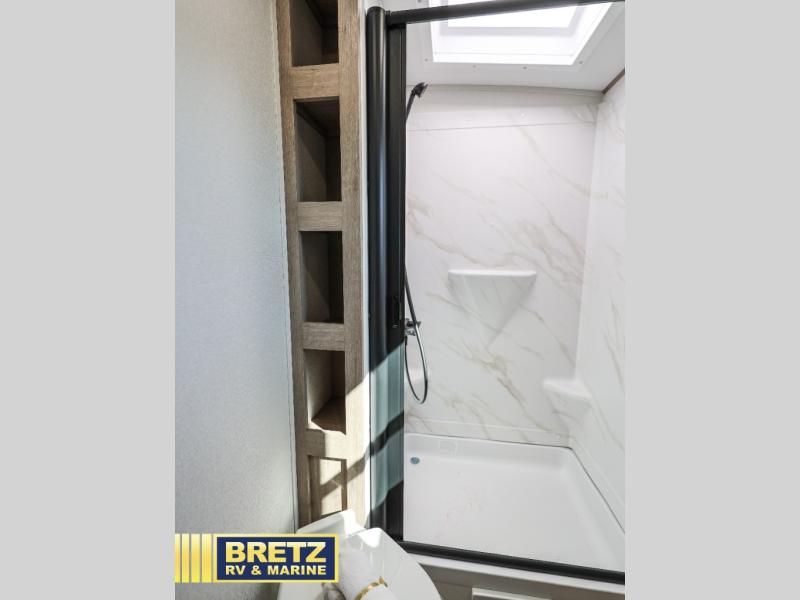 What I liked most: Bunk area area lifts up for additional storage which is very unique. Place for shoes. The bathroom shower surround has a brick molded design look.