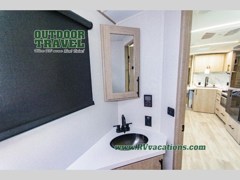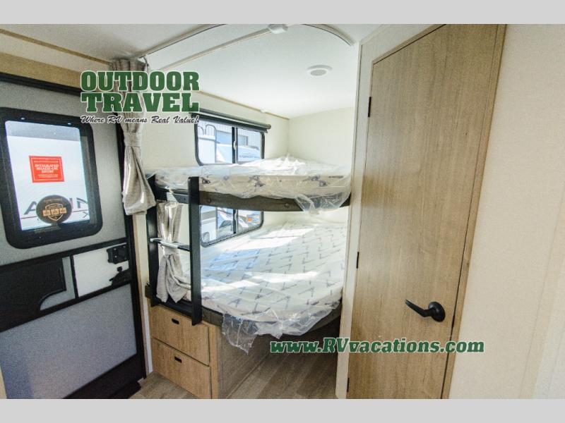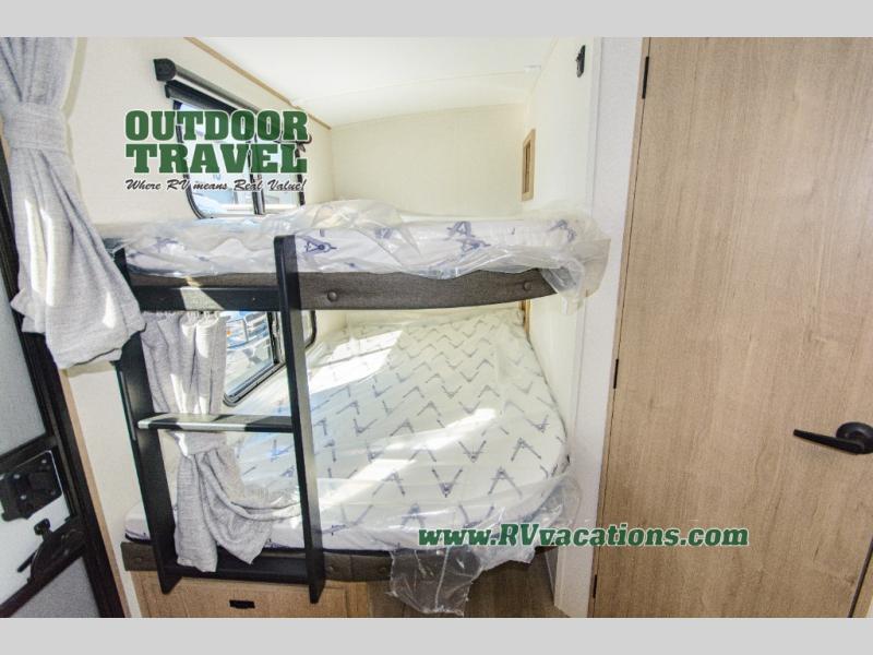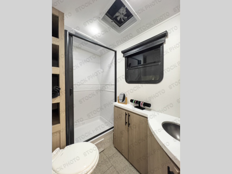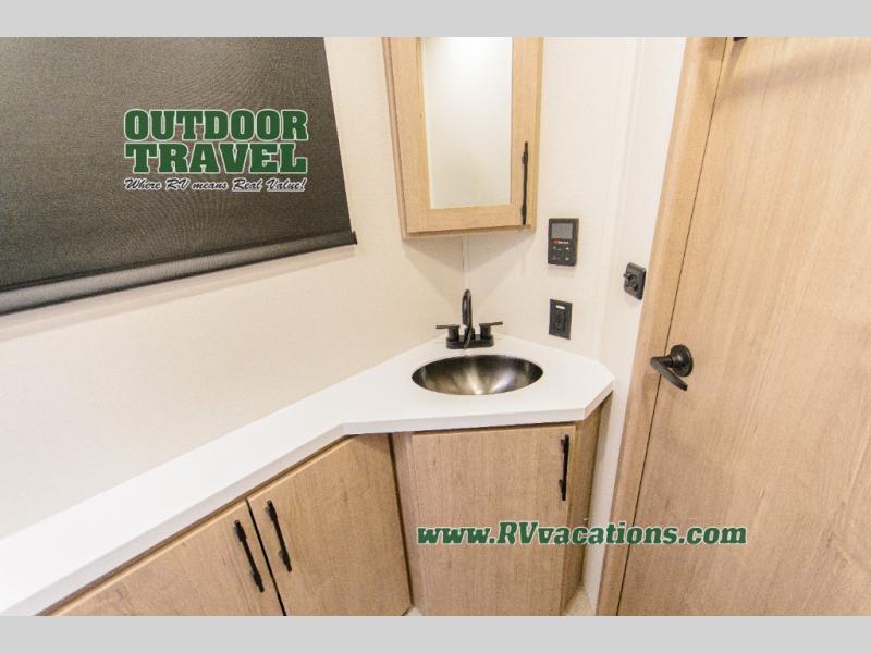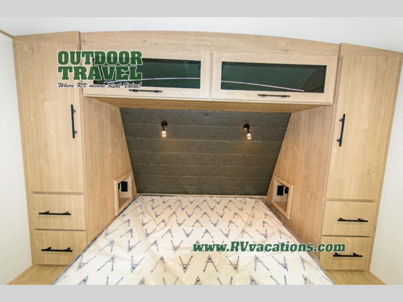 What I liked most: Bunk area area lifts up for additional storage which is very unique. Place for shoes. The bathroom shower surround has a brick molded design look.