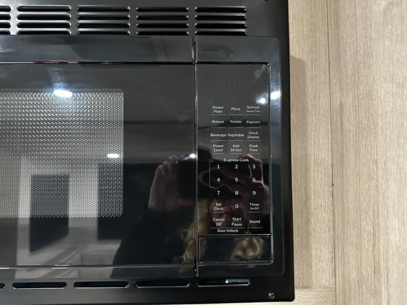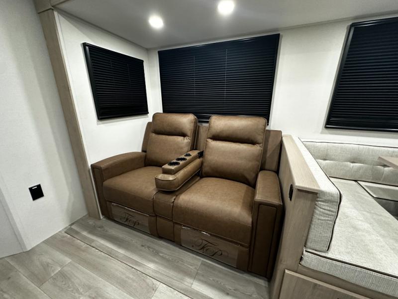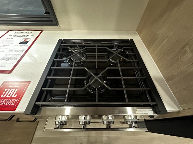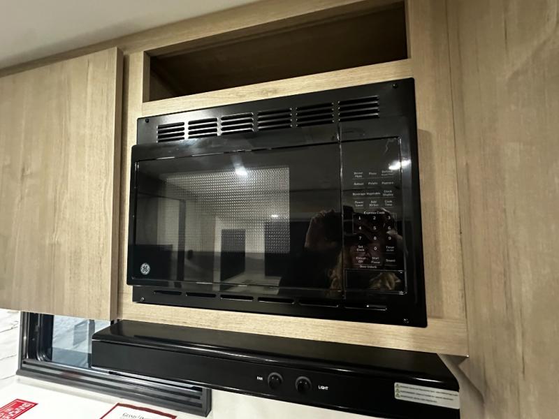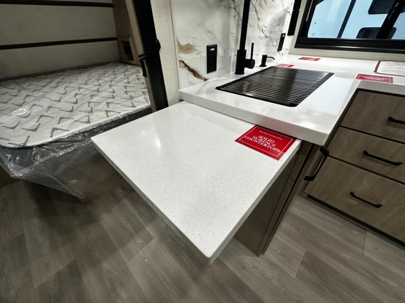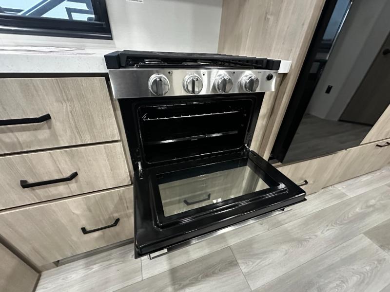 Meal prep is a breeze thanks to a fully equipped kitchen featuring a three-burner range with oven, microwave, large refrigerator, flip-up countertop extension, and plenty of pantry and overhead storage. When the weather’s nice, take your cooking outside to the outdoor kitchen with griddle and mini refrigerator under the 19-foot power awning with LED lighting — perfect for breakfast at sunrise or dinner under the stars.