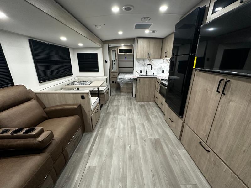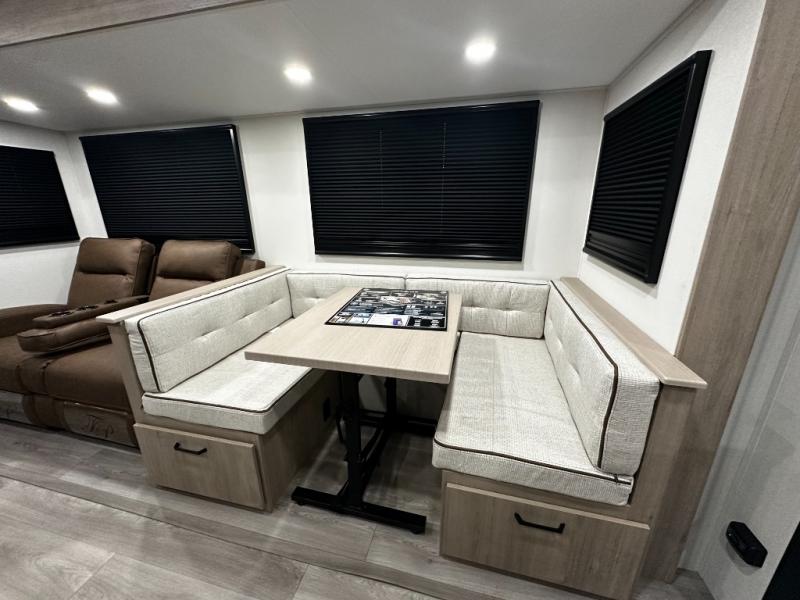 The heart of the 2800BH is its inviting living space, anchored by a large U-shaped dinette and tri-fold sofa that offer flexible seating for meals, games, and lounging. Large panoramic windows plus 81" radius ceilings create a bright and open interior, connecting you with the views outside while keeping everyone comfortable inside.