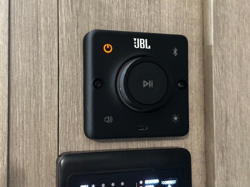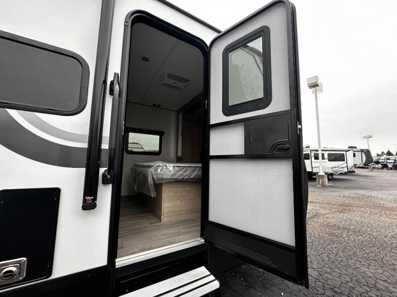 Convenience continues with dual entry doors — one to the main living area and another to the bathroom — making access quick and easy without tracking dirt through the camper. Spacious pass-through storage and a universal docking station keep gear organized and utility hookups simple.