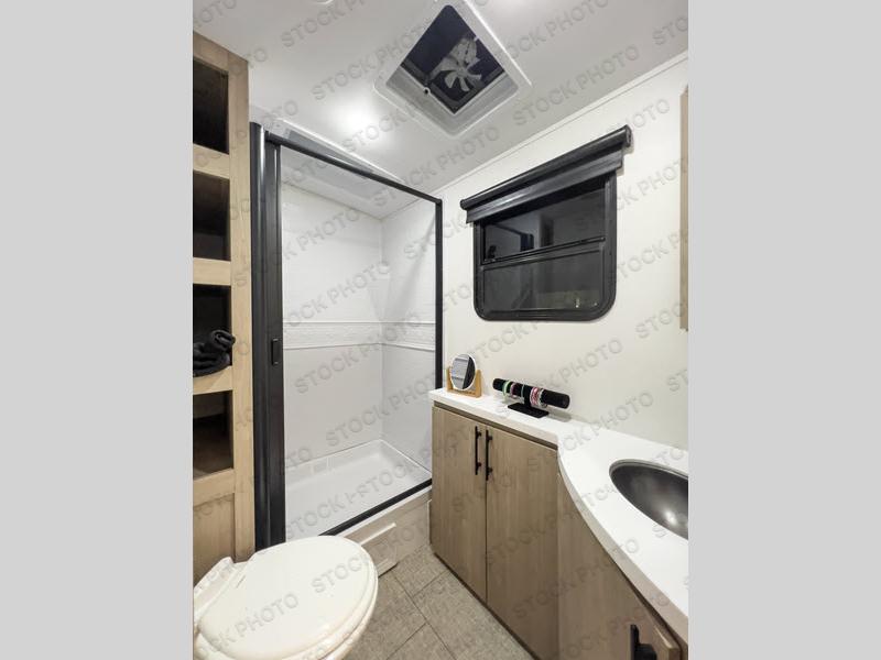 What I liked most: Bunk area area lifts up for additional storage which is very unique. Place for shoes. The bathroom shower surround has a brick molded design look.