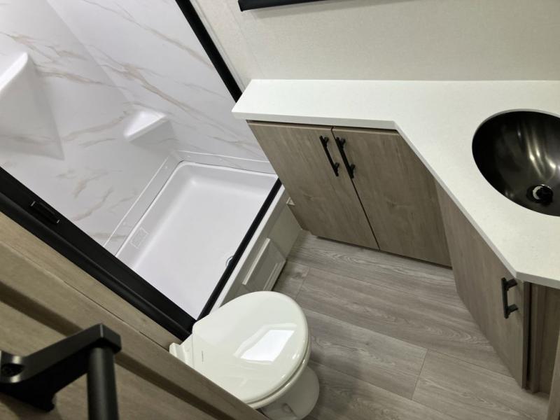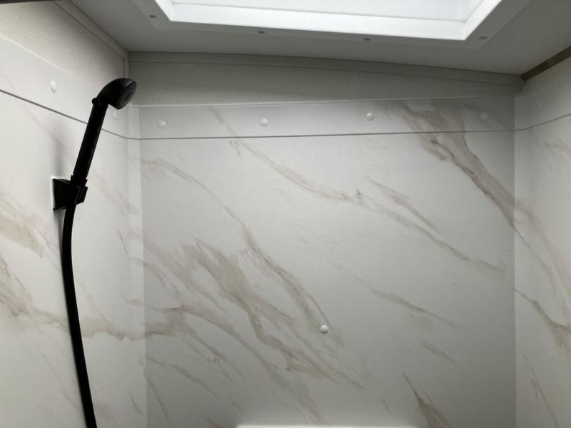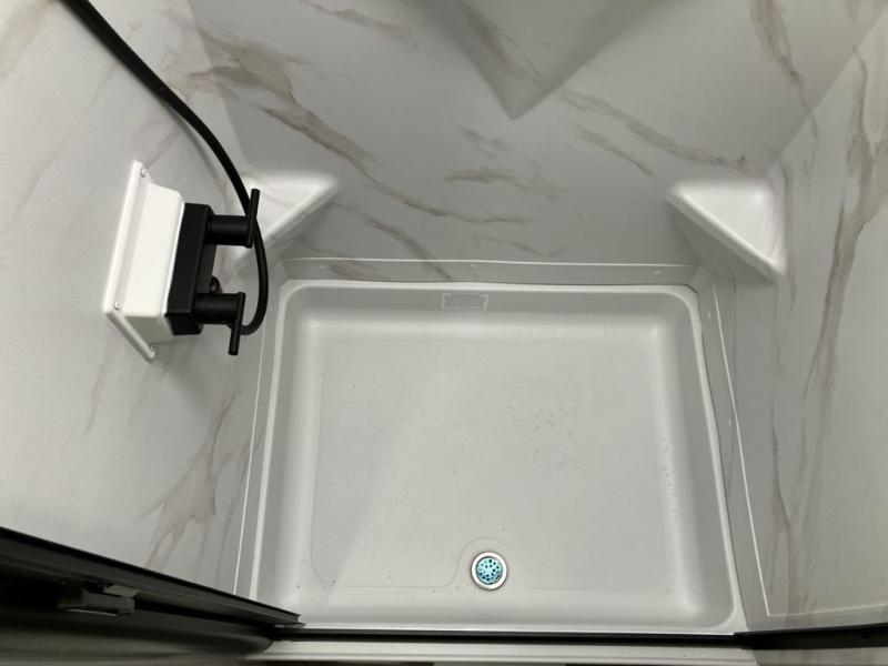 What I liked most: Bunk area area lifts up for additional storage which is very unique. Place for shoes. The bathroom shower surround has a brick molded design look.