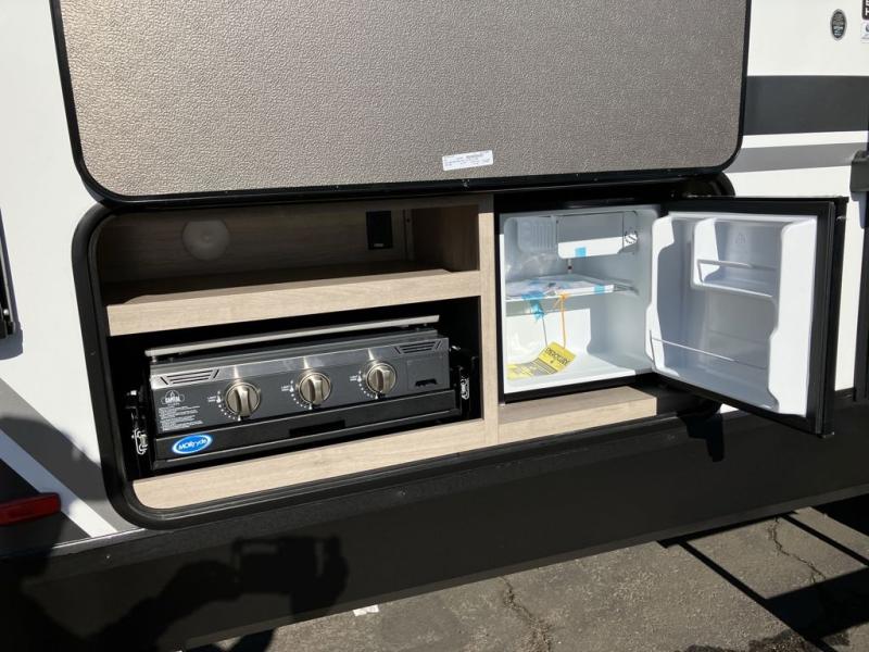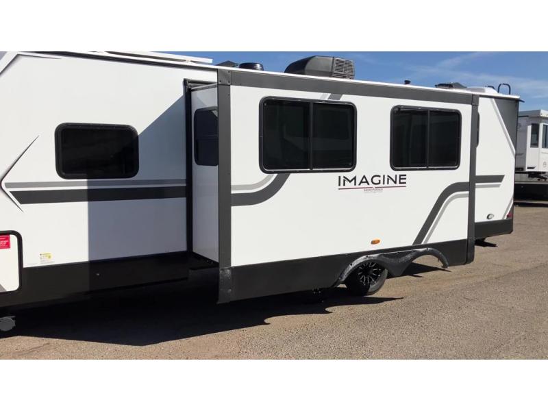 Where will you go with this Imagine travel trailer? The possibilities are endless! You can take your family on an exciting excursion because this trailer has enough sleeping space for everyone with a 60" x 80" queen bed in the private bedroom, a U-shaped dinette and tri-fold sofa in the main living area, and there is a set of 47" x 76" bunk beds with privacy curtains in the rear corner. You can come and go as you please with two entry doors, and the outdoor griddle and refrigerator will be fun to use when the weather is nice. The flip-up countertop extension will make it easier to prepare delicious home cooked meals and the shoe storage area helps to keep things neat and tidy.