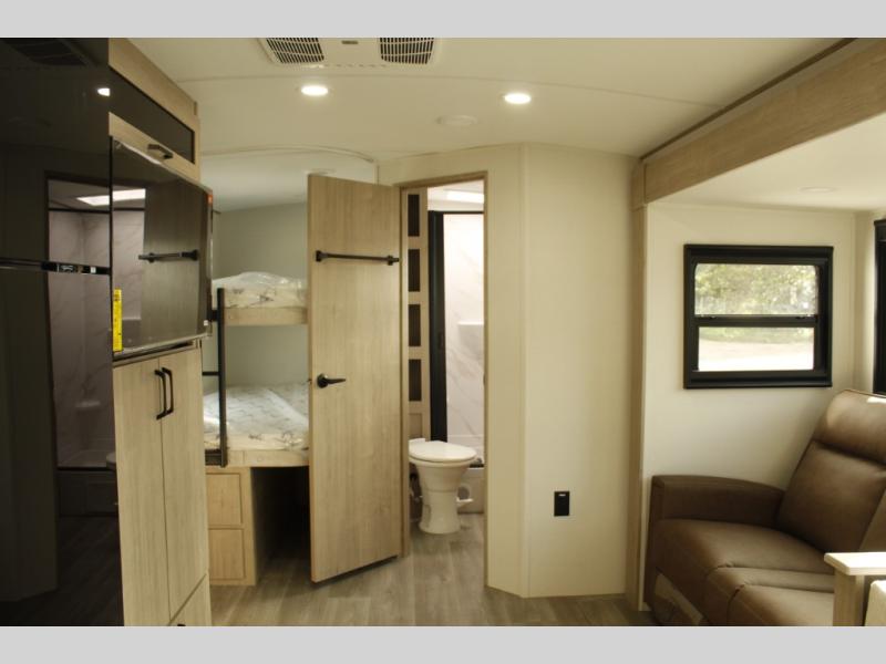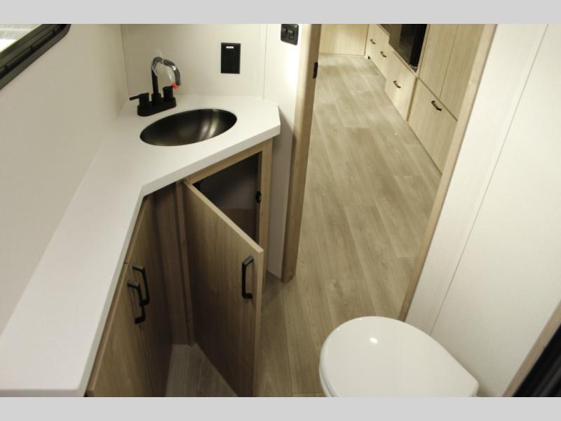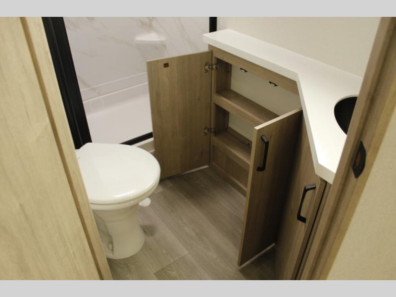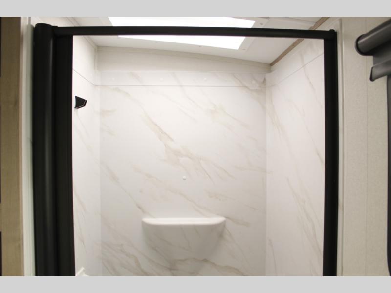 What I liked most: Bunk area area lifts up for additional storage which is very unique. Place for shoes. The bathroom shower surround has a brick molded design look.