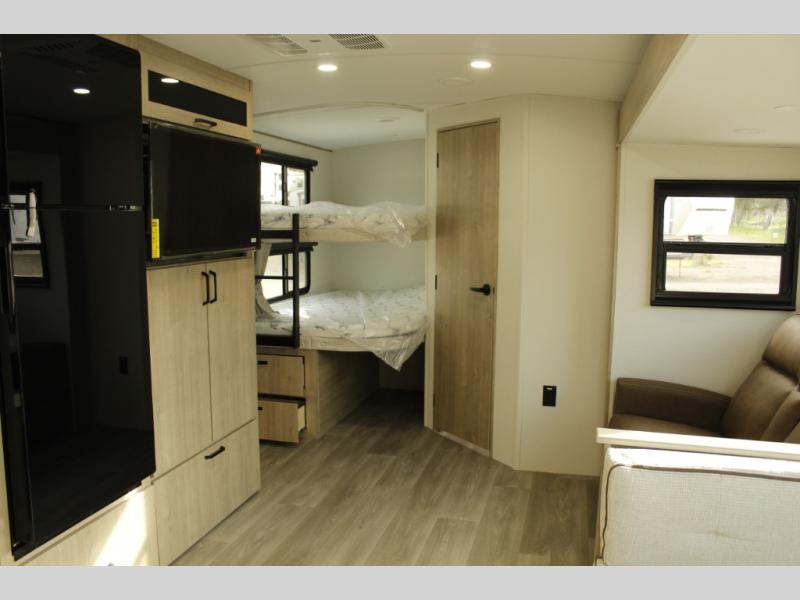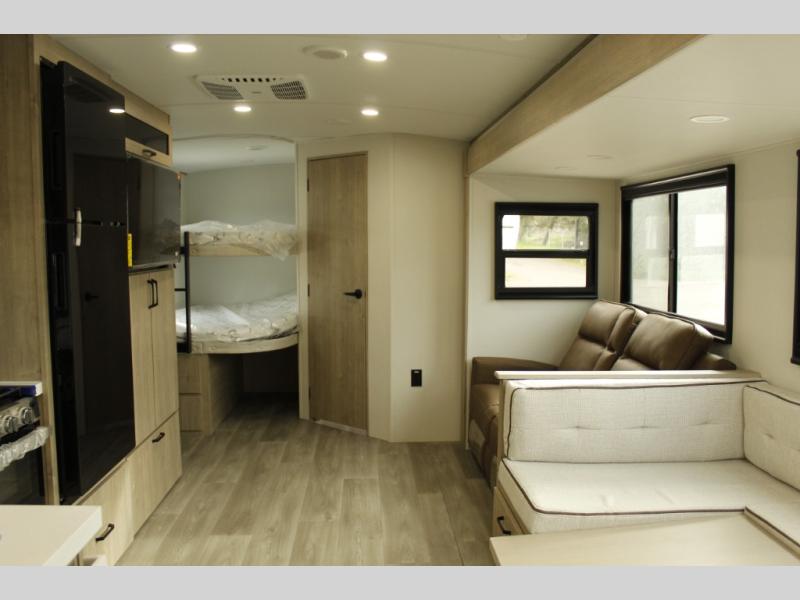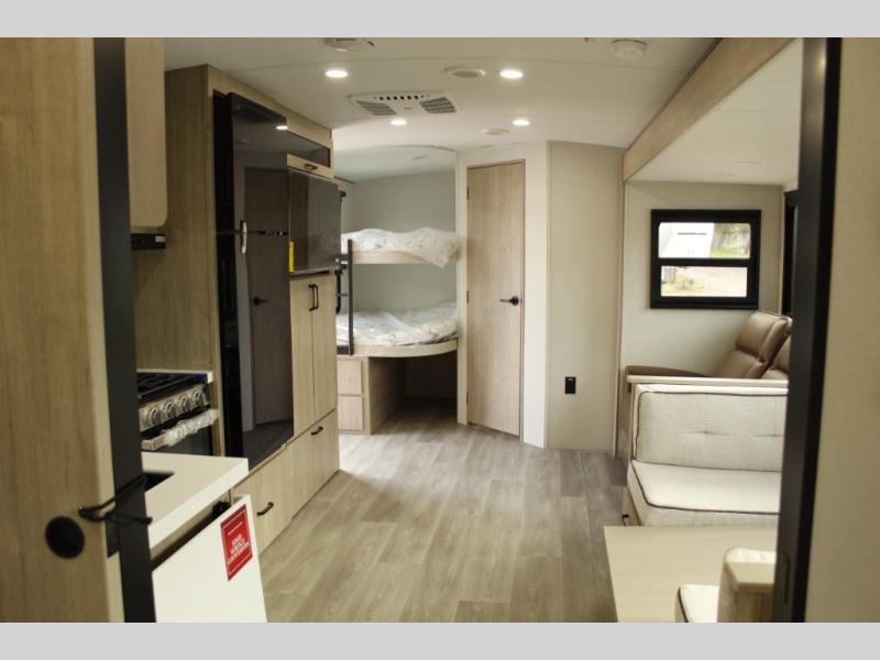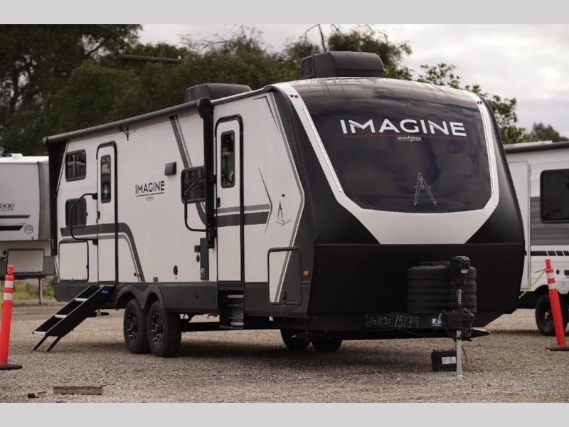 Where will you go with this Imagine travel trailer? The possibilities are endless! You can take your family on an exciting excursion because this trailer has enough sleeping space for everyone with a 60" x 80" queen bed in the private bedroom, a U-shaped dinette and tri-fold sofa in the main living area, and there is a set of 47" x 76" bunk beds with privacy curtains in the rear corner. You can come and go as you please with two entry doors, and the outdoor griddle and refrigerator will be fun to use when the weather is nice. The flip-up countertop extension will make it easier to prepare delicious home cooked meals and the shoe storage area helps to keep things neat and tidy.